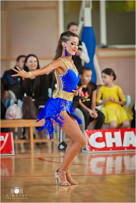 Blue and Gold Latin Dress with Accented Belt