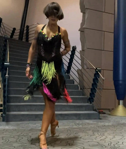 Black Latin Dress With Multicolor Fringes