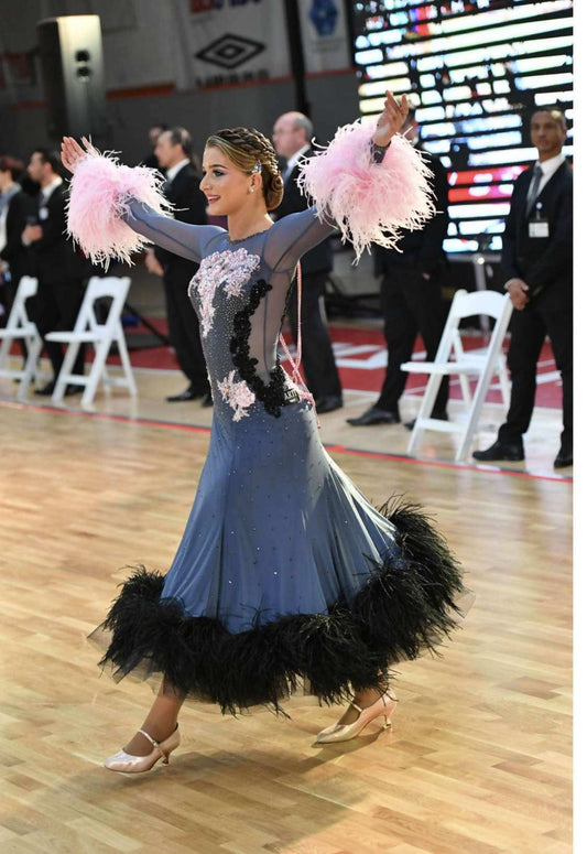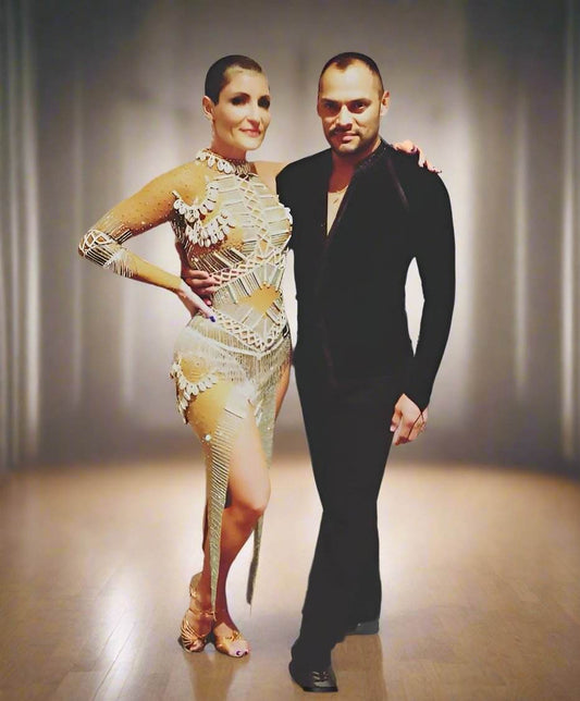 Latin Dance Dress | Grey Velvet and Gold Chiffon Elegance