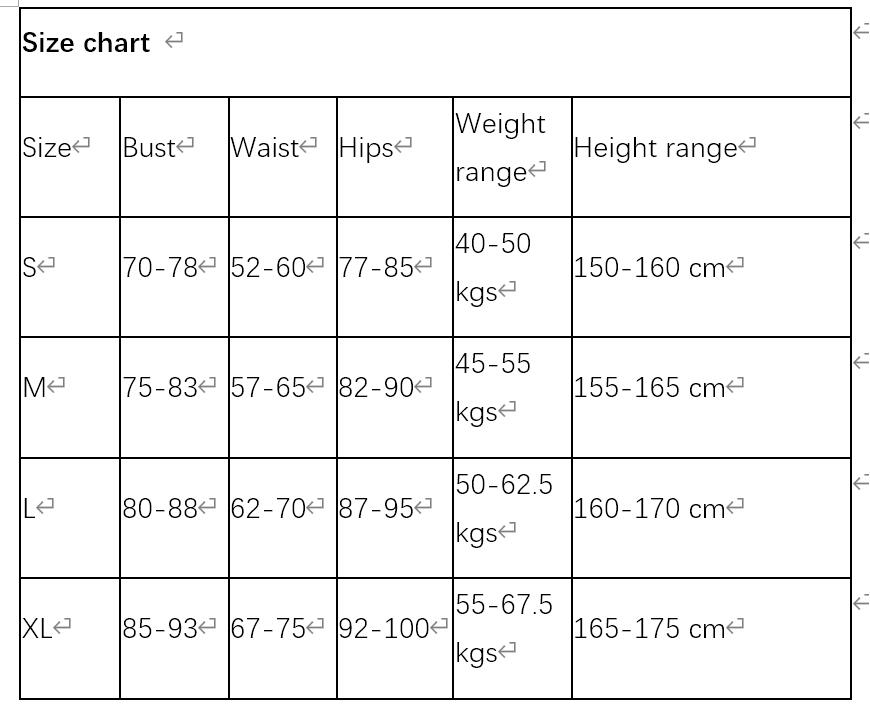 | Size | Bust | Waist | Hips | Weight | Height |