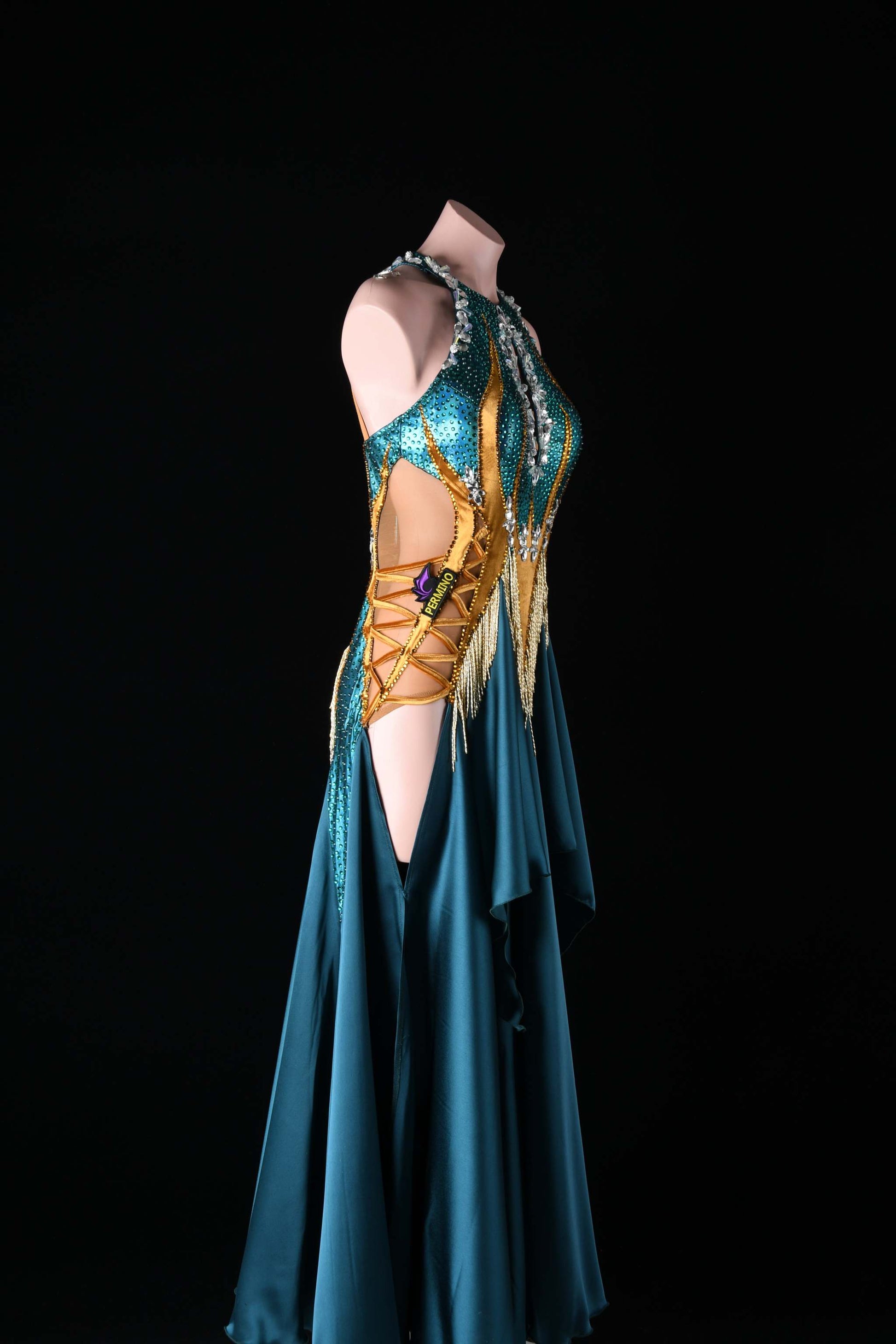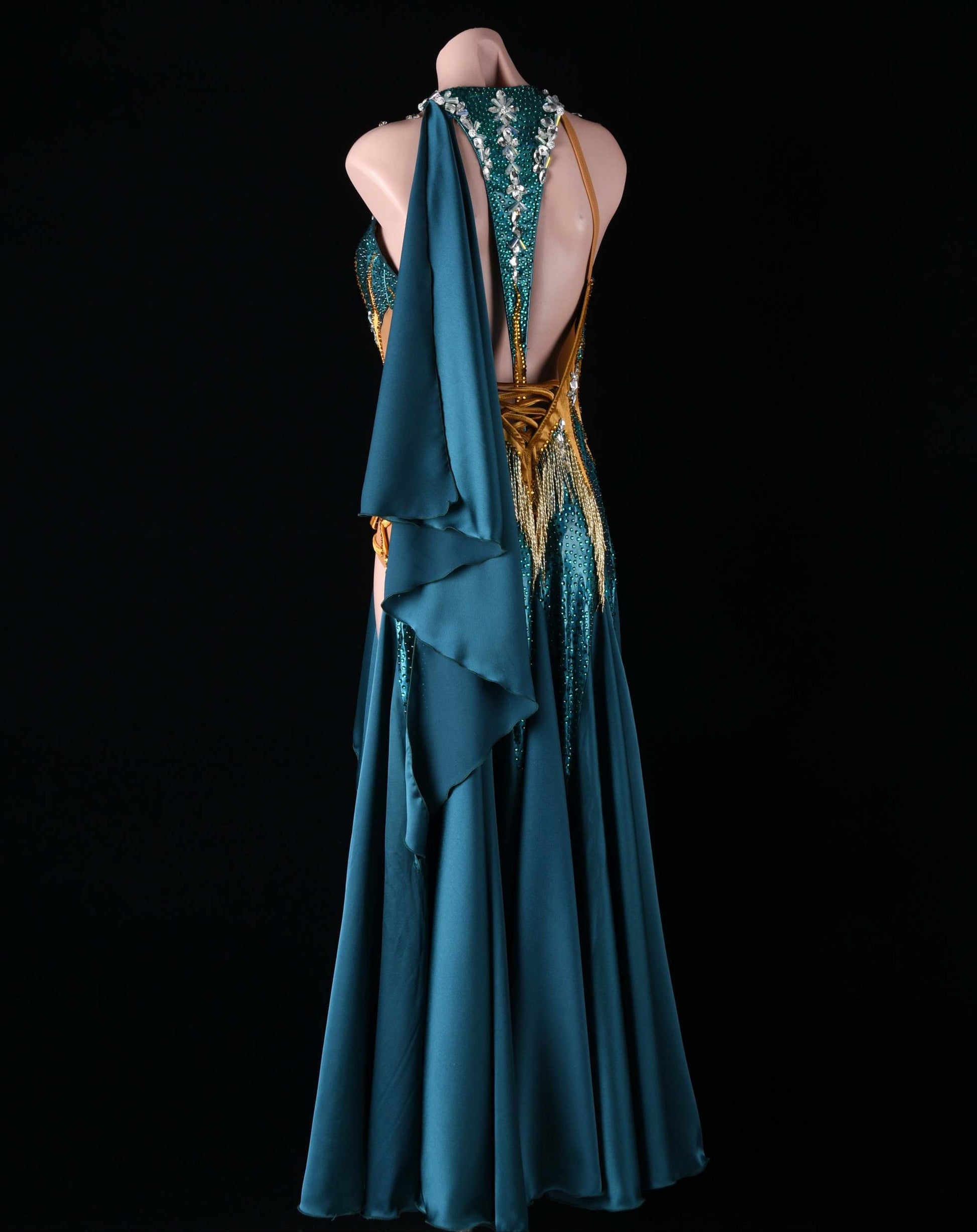 This exquisite emerald american smooth dress is custom-designed without sleeves and includes daring leg cutouts. Adorned with sparkling stones and beads, it showcases intricate craftsmanship and striking sophistication, perfect for commanding attention on stage.