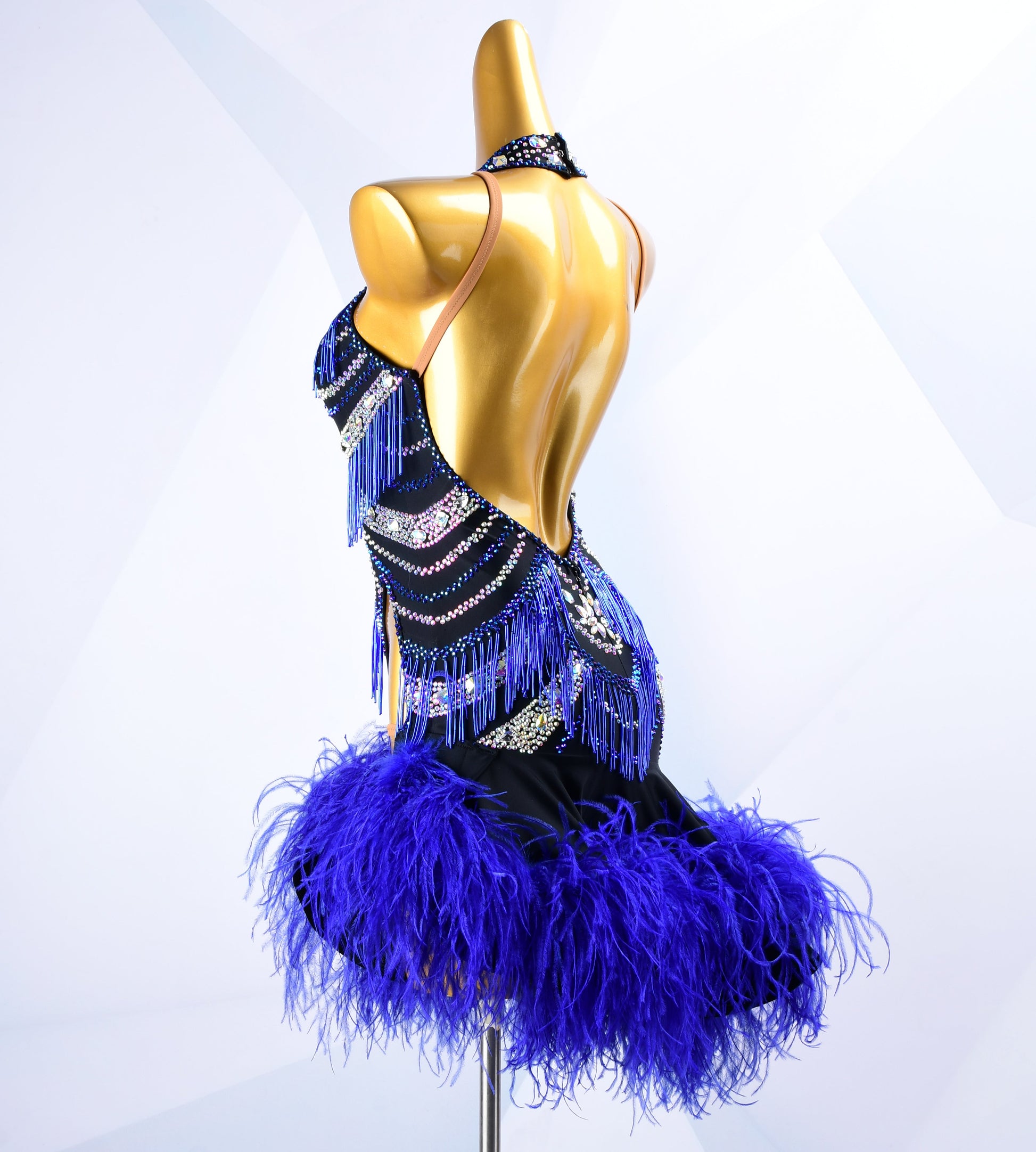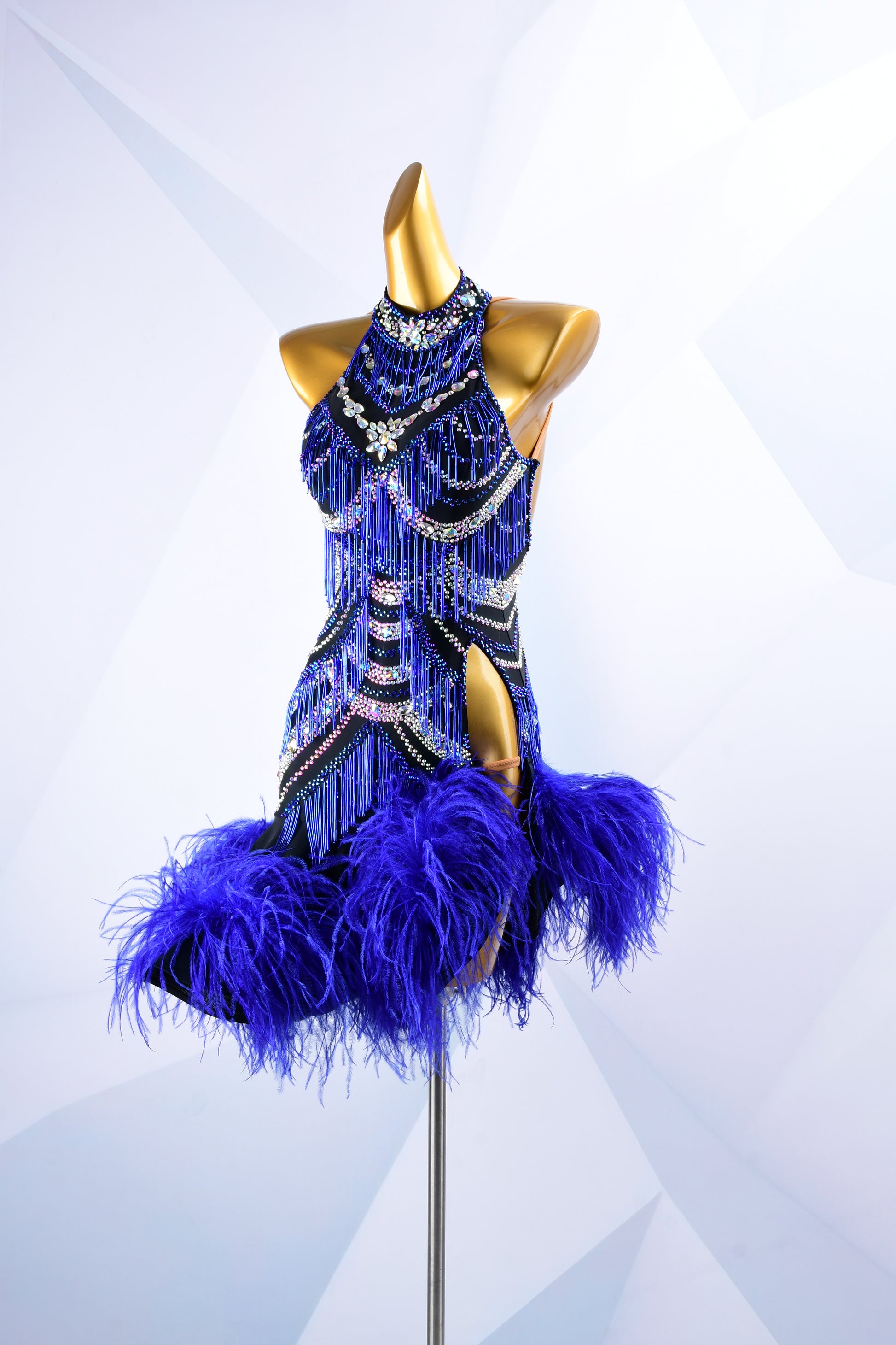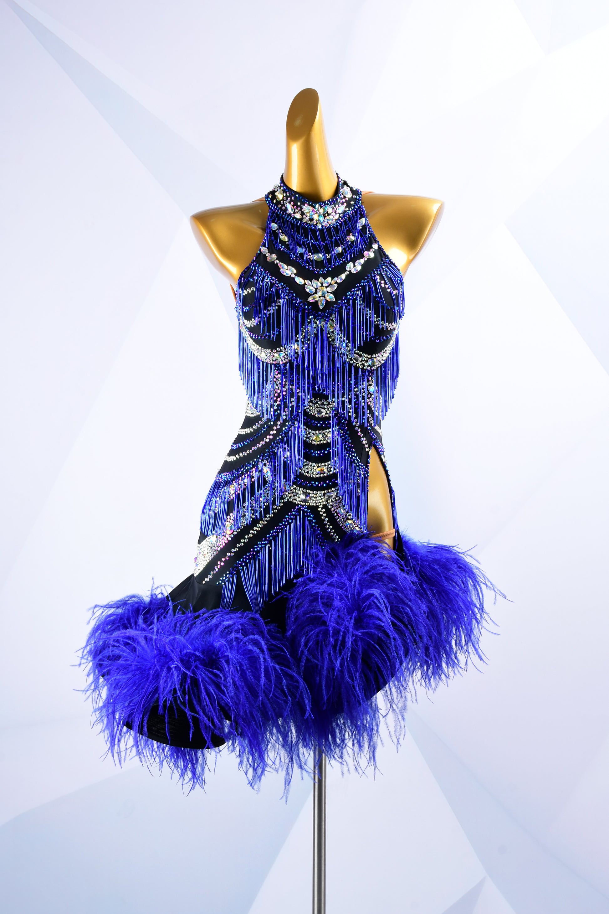Make a striking impression in this stunning dance dress featuring royal blue fringe, sparkling crystals, and luxurious feather details. Crafted to flow gracefully with every movement, it enhances your performance with elegance and intensity, ensuring you captivate the audience from start to finish.