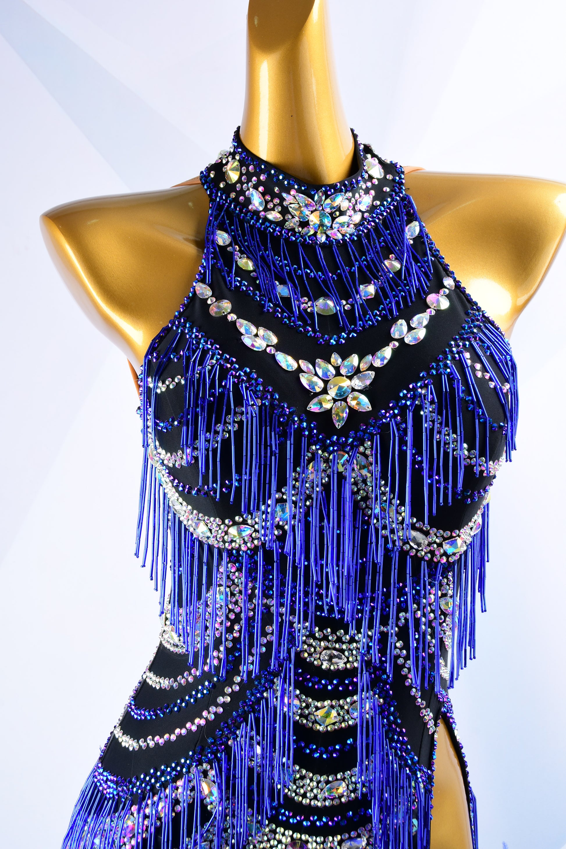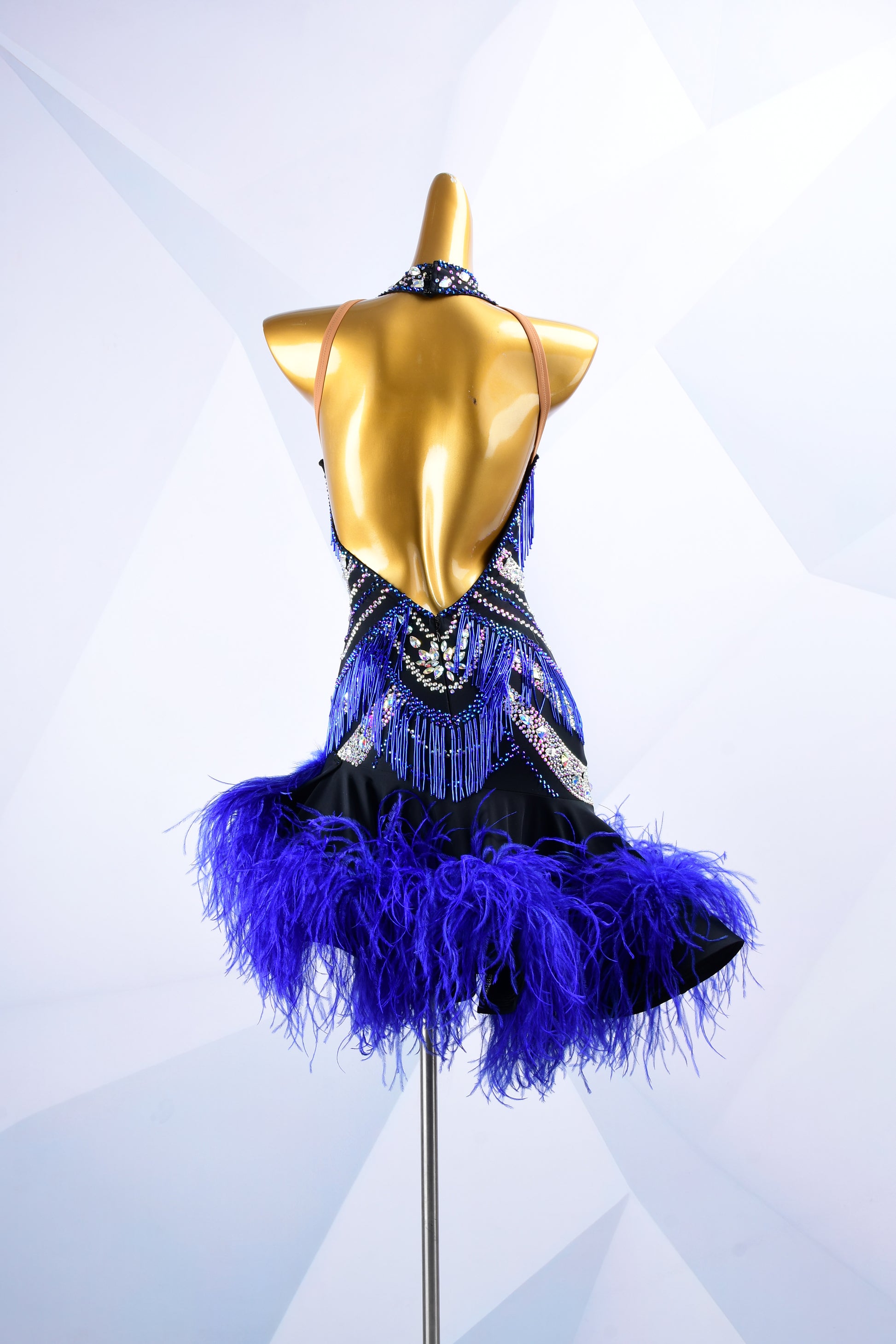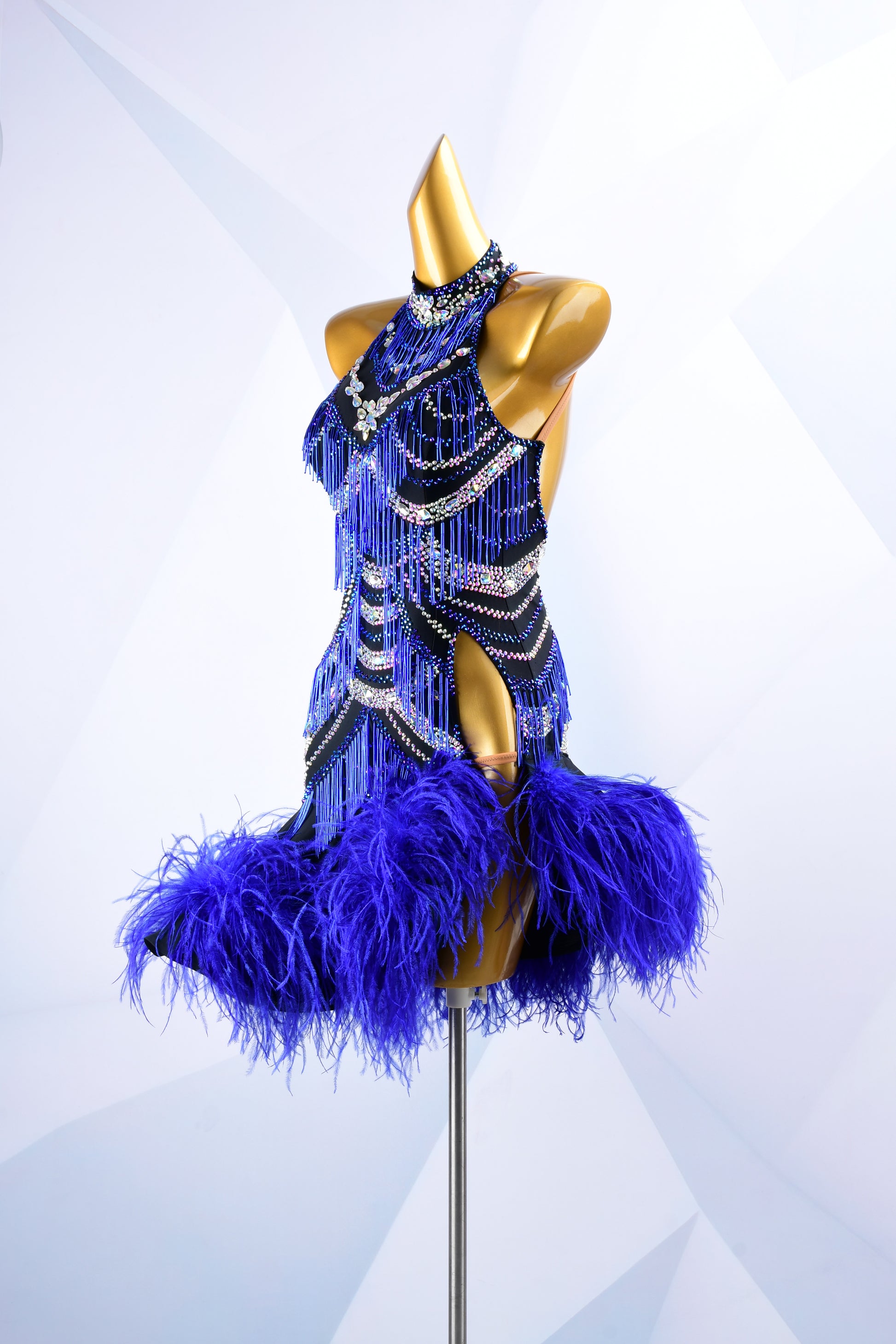 Make a striking impression in this stunning dance dress featuring royal blue fringe, sparkling crystals, and luxurious feather details. Crafted to flow gracefully with every movement, it enhances your performance with elegance and intensity, ensuring you captivate the audience from start to finish.
