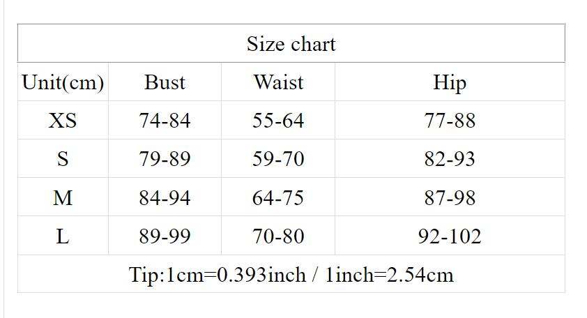 | Size | Bust | Waist | Hips |