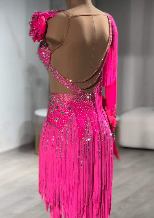 Pink Fringe Rhythm Dance Dress with Sparkling Crystals