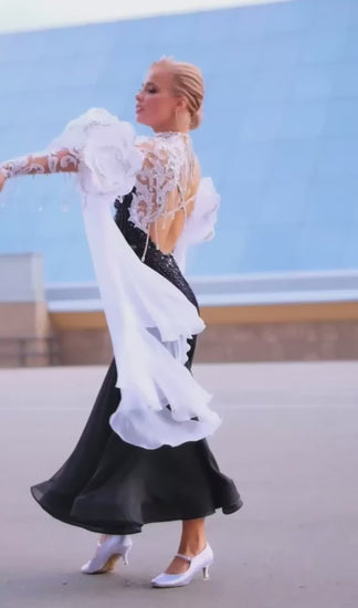 Unveiling the stunning black and white ballroom gown by Savich Art, an exquisite piece of luxury. With long, intricate lace sleeves, this dress seamlessly combines classic charm with contemporary style. Perfect for devoted ballroom dancers, it guarantees a mesmerizing presence on the dance floor and is perfect for those in search of a sophisticated, timeless aesthetic.