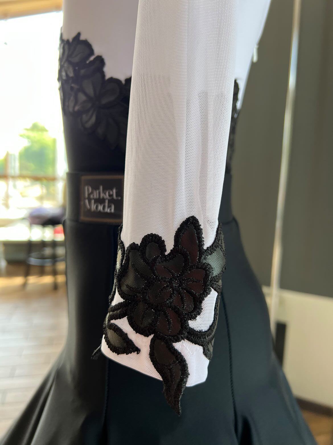 Get ready to make a statement on the dance floor with this stunning long sleeve black and white juvenile latin set by Parket Moda! This set is in impeccable condition and includes a bodysuit and skirt for a flawless fit. The bodysuit features a stylish row of small black crystals on the neckline and two rows of buttons for adjustable sizing, ensuring maximum comfort. The premium skirt with an organza petticoat adds volume and flow, making it ideal for young dancers in latin competitions and performances.