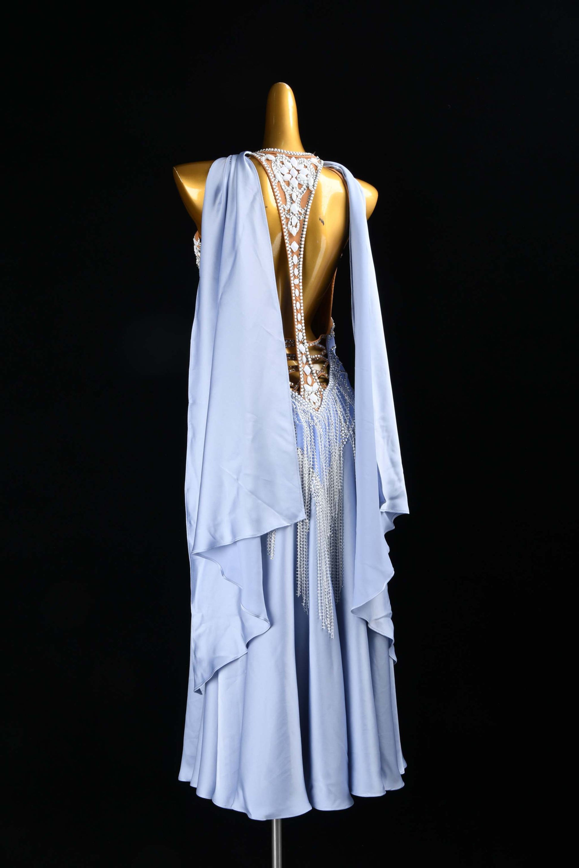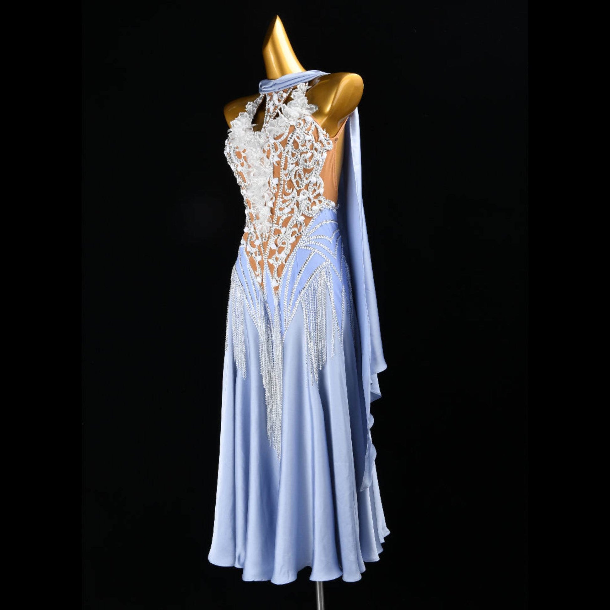 This exquisite sleeveless smooth dress is custom-crafted with detailed stone and lace accents, complemented by graceful fringes. Ideal for performances or competitions, it combines elegance and allure in a distinctive style that ensures you stand out.