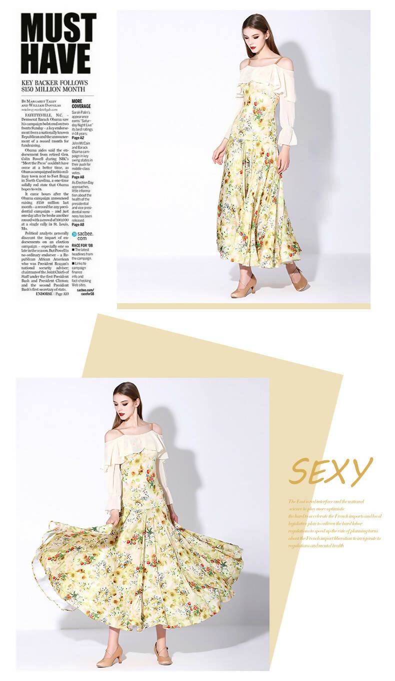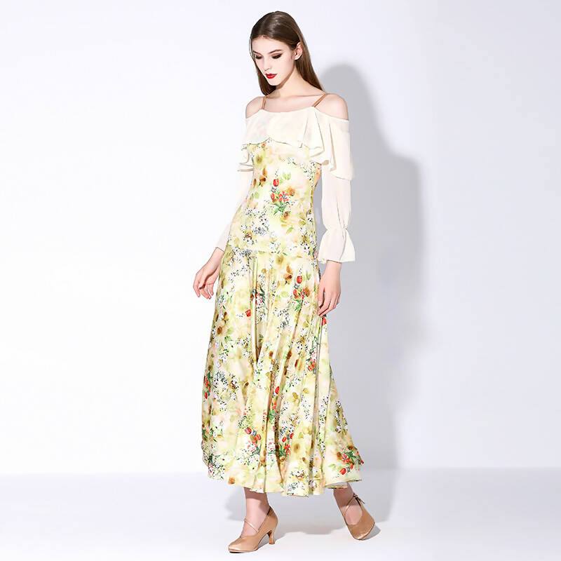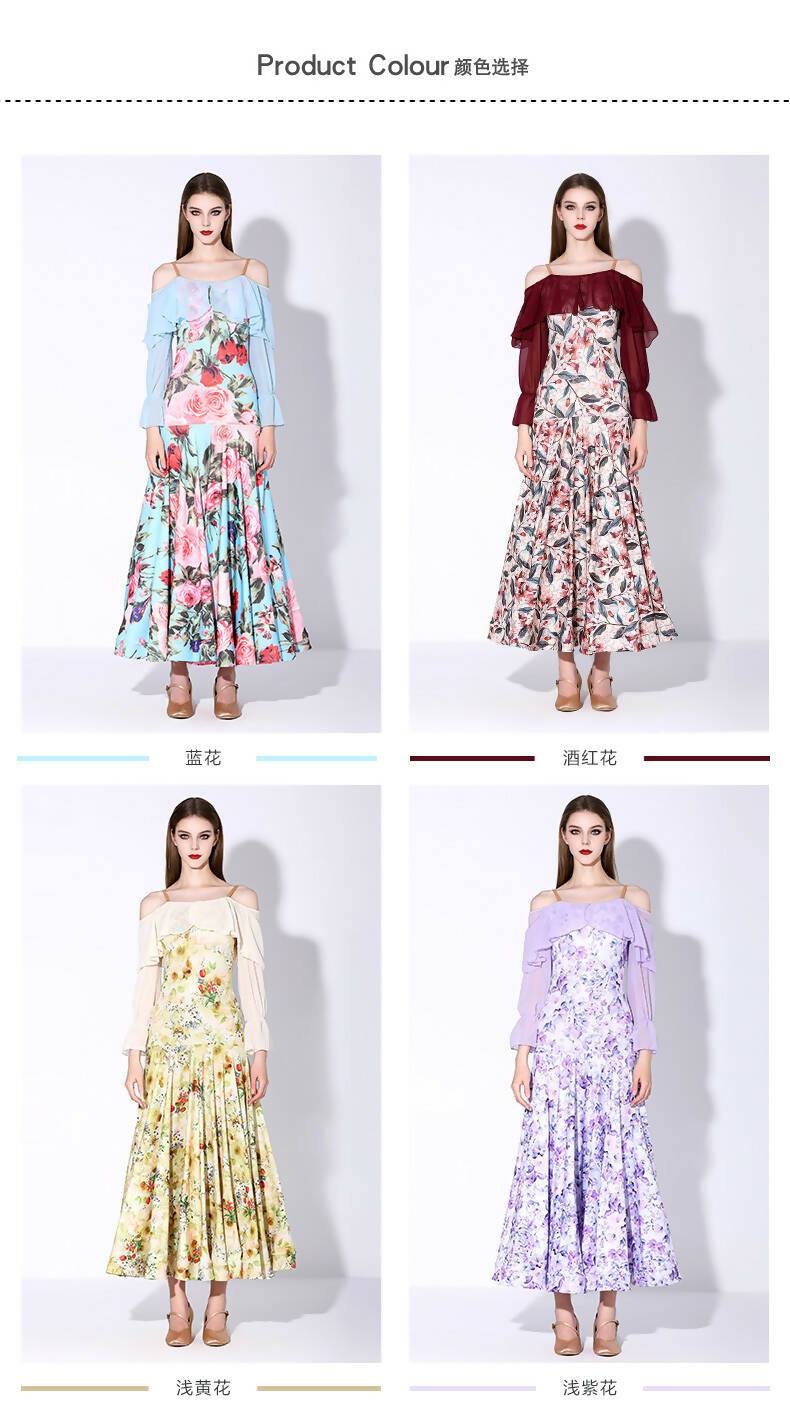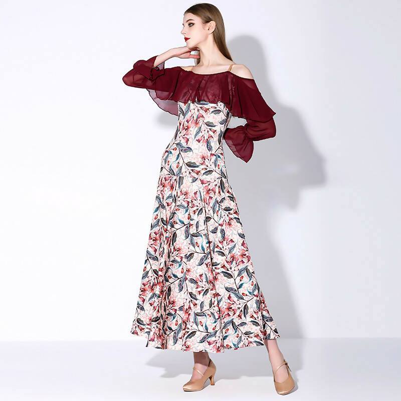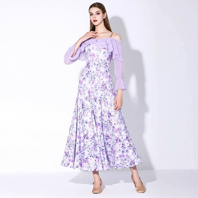 Discover the harmony of movement and style with our practice ballroom dress. Designed for ease and elegance, this dress features graceful, long flowy sleeves. Available in a delightful array of colors – from regal purple to sunny yellow, tranquil blue, and dark red flower prints. Elevate your practice sessions as you waltz and twirl, enveloped in the beauty of floral patterns and the freedom of flowing sleeves.