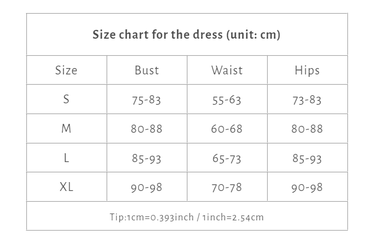 | Size chart for the dress (unit: cm) | |||