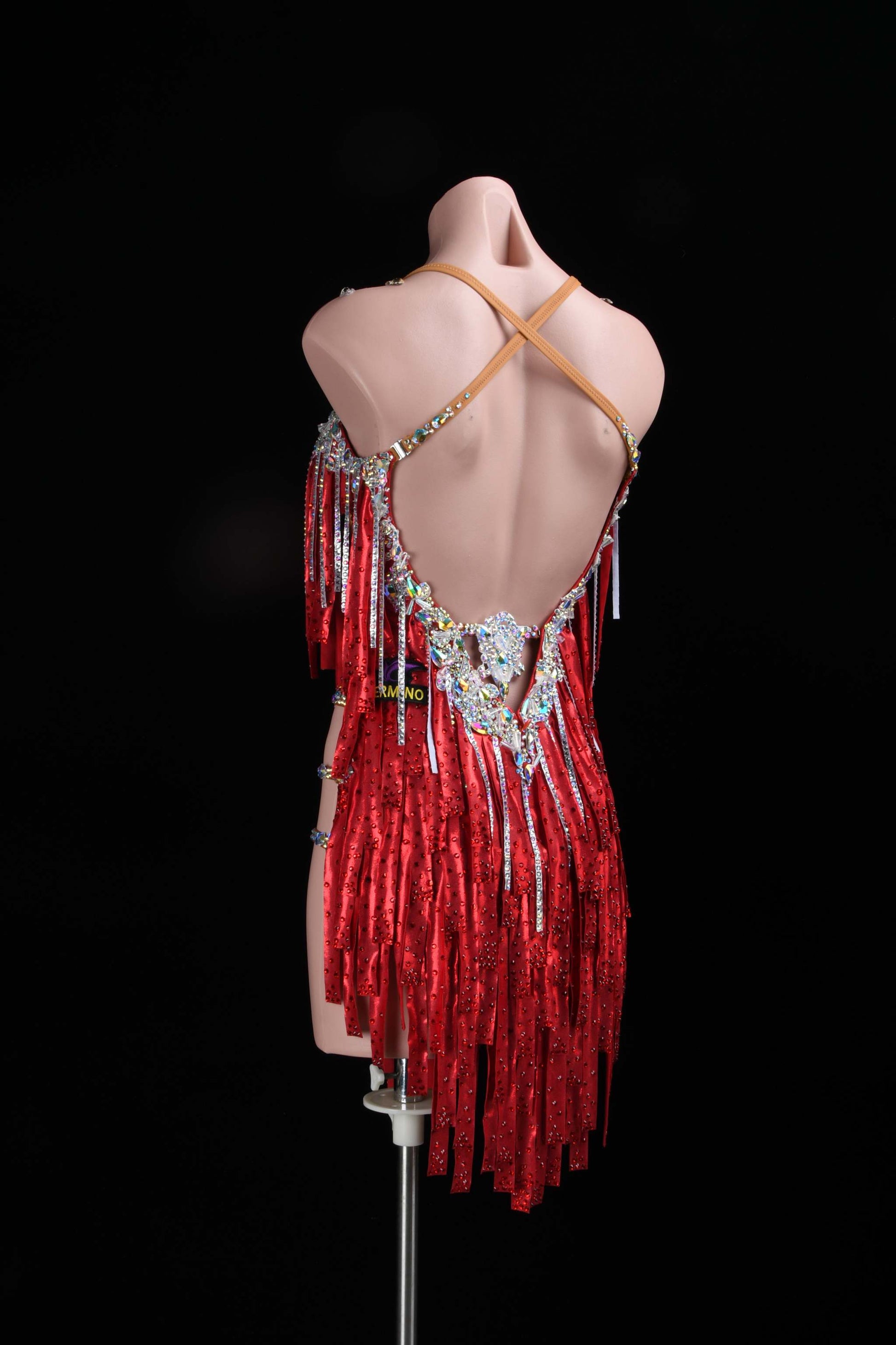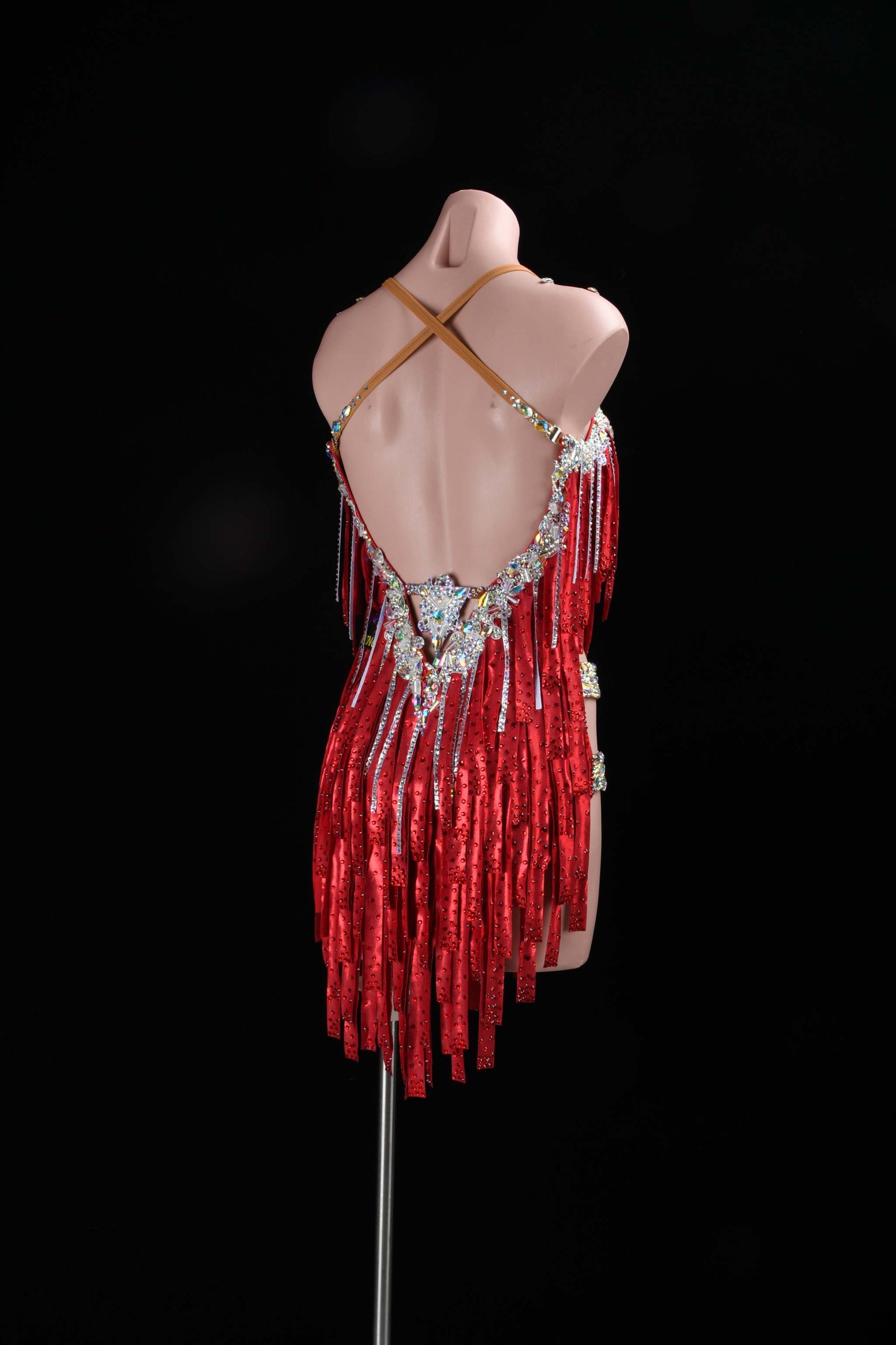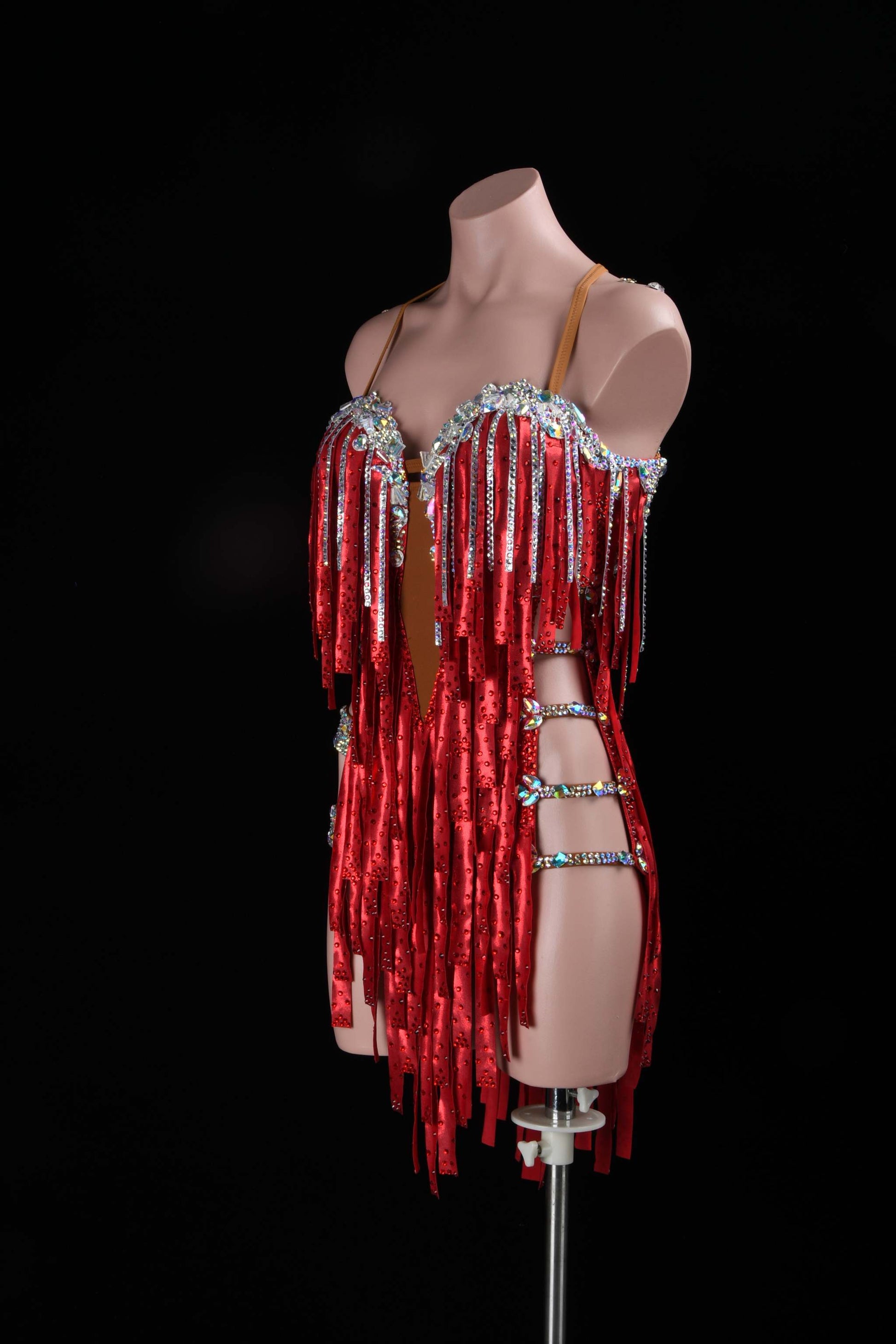 Turn heads with this striking red latin dress, adorned with sparkling rhinestones and bold cutouts. Crafted for both grace and impact, it offers a flattering silhouette and ensures you stand out on stage with confidence.