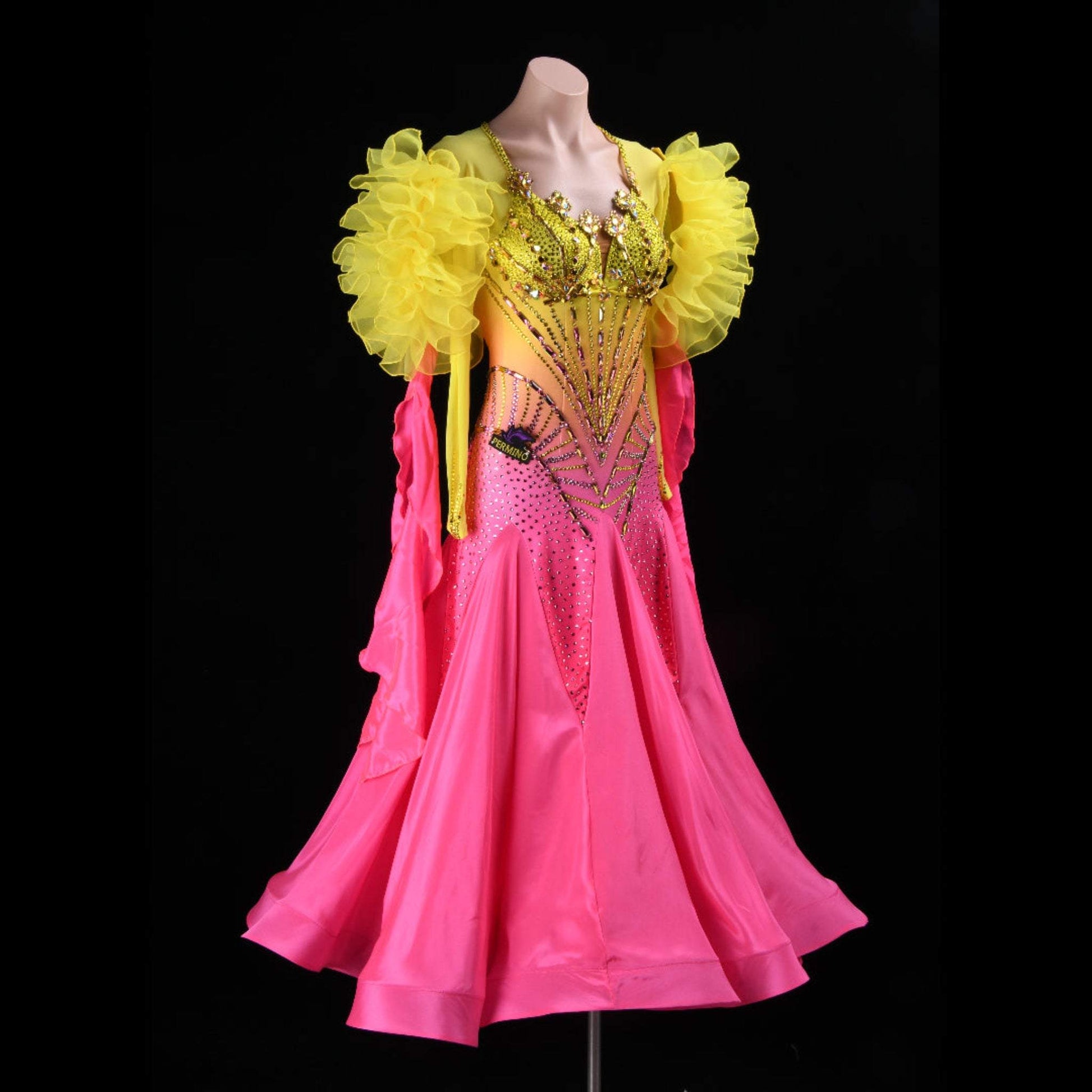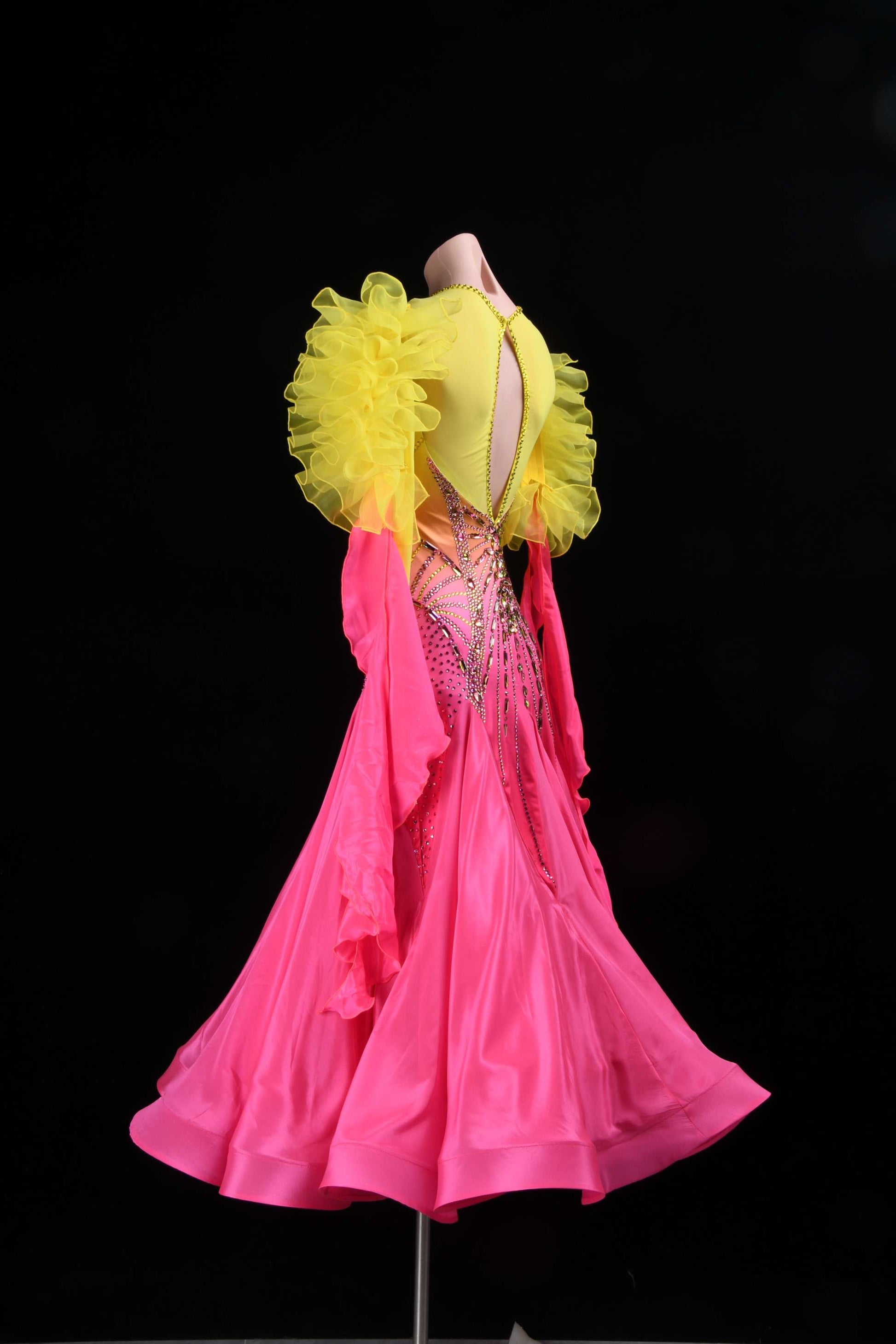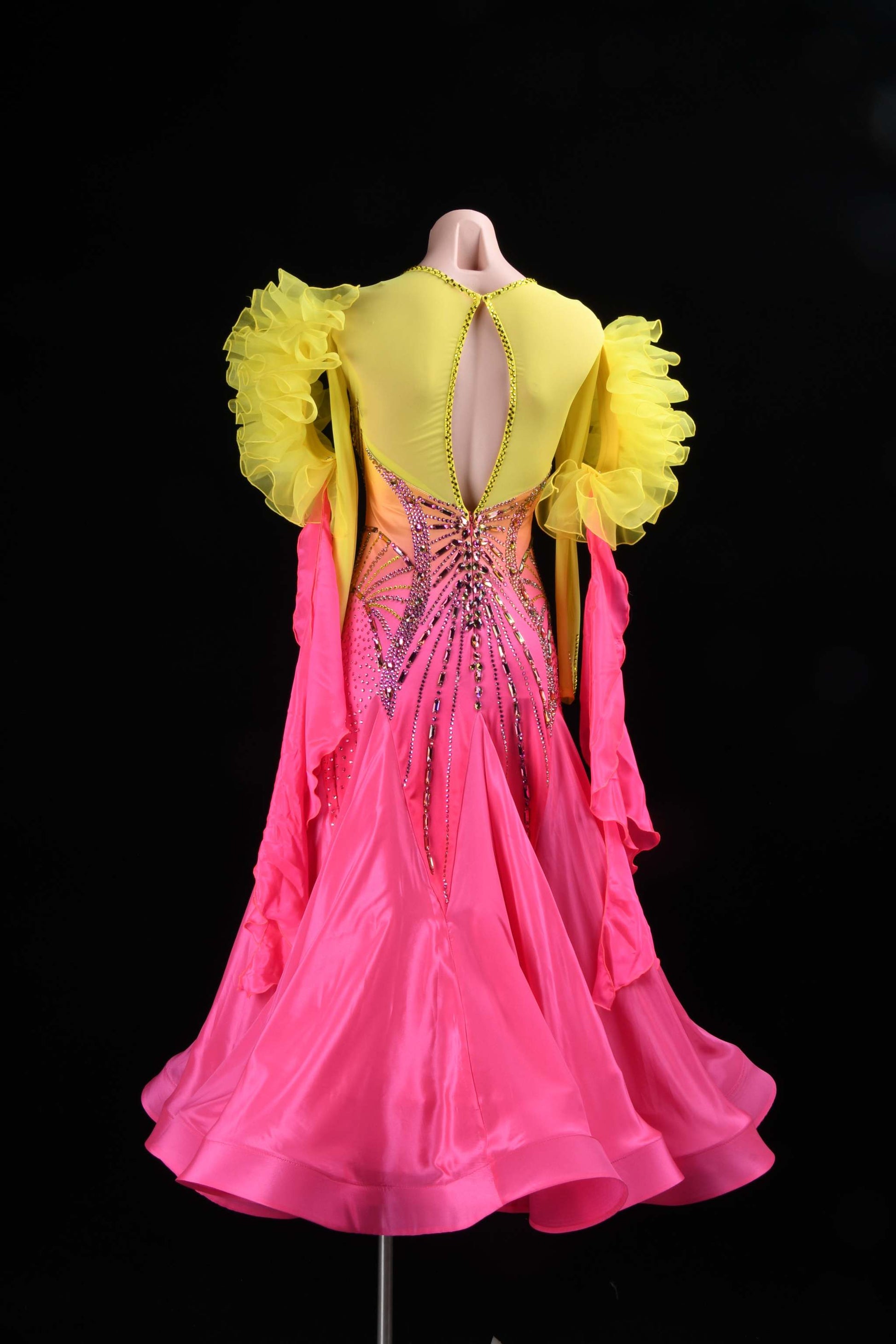 This exclusive ballroom dress features a striking blend of two vivid colors, enhanced by long sleeves and dazzling stone details. With intricate shoulder designs and a full, flowing crinoline, it offers both grace and dynamic movement, ensuring you stand out and captivate every audience on stage.