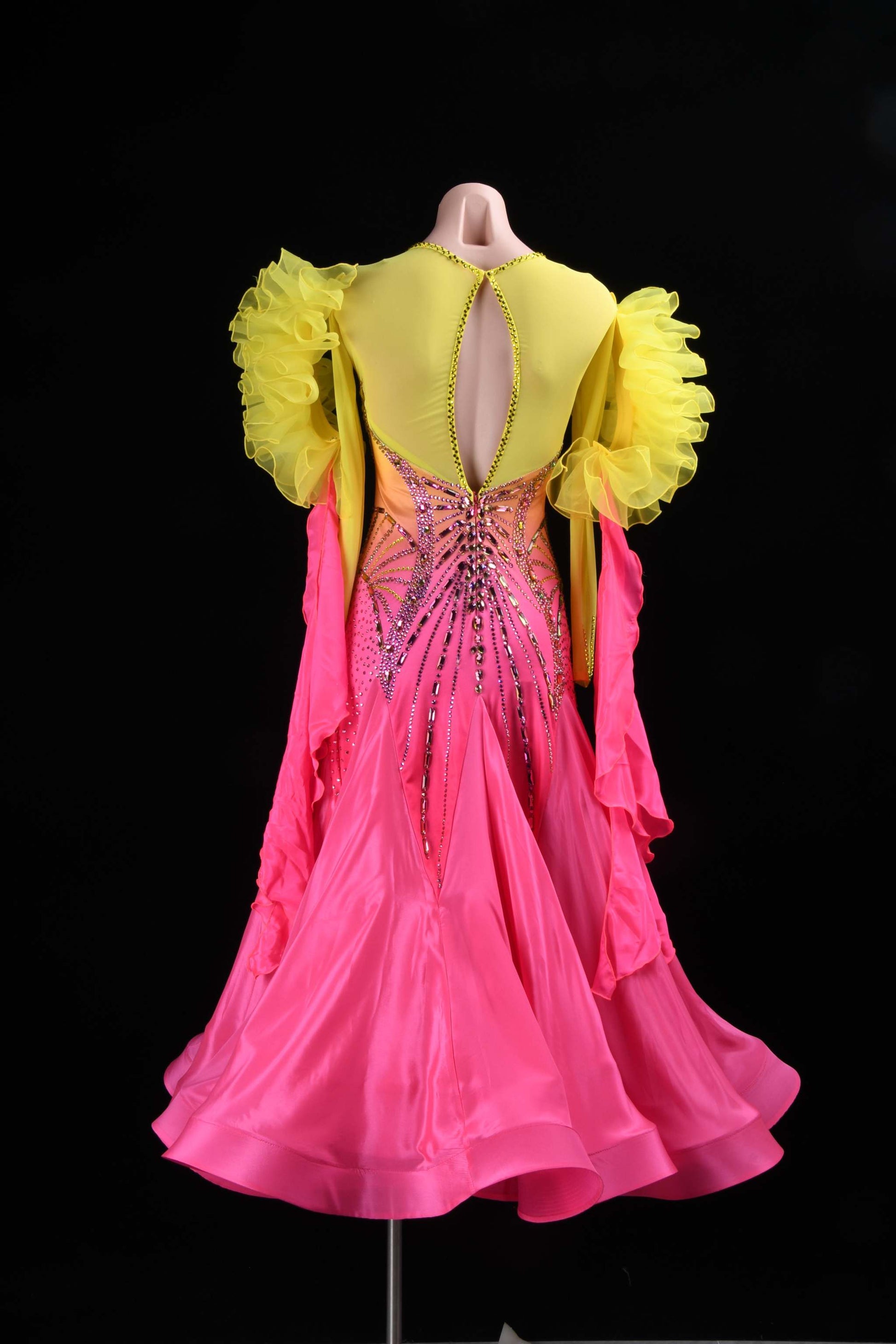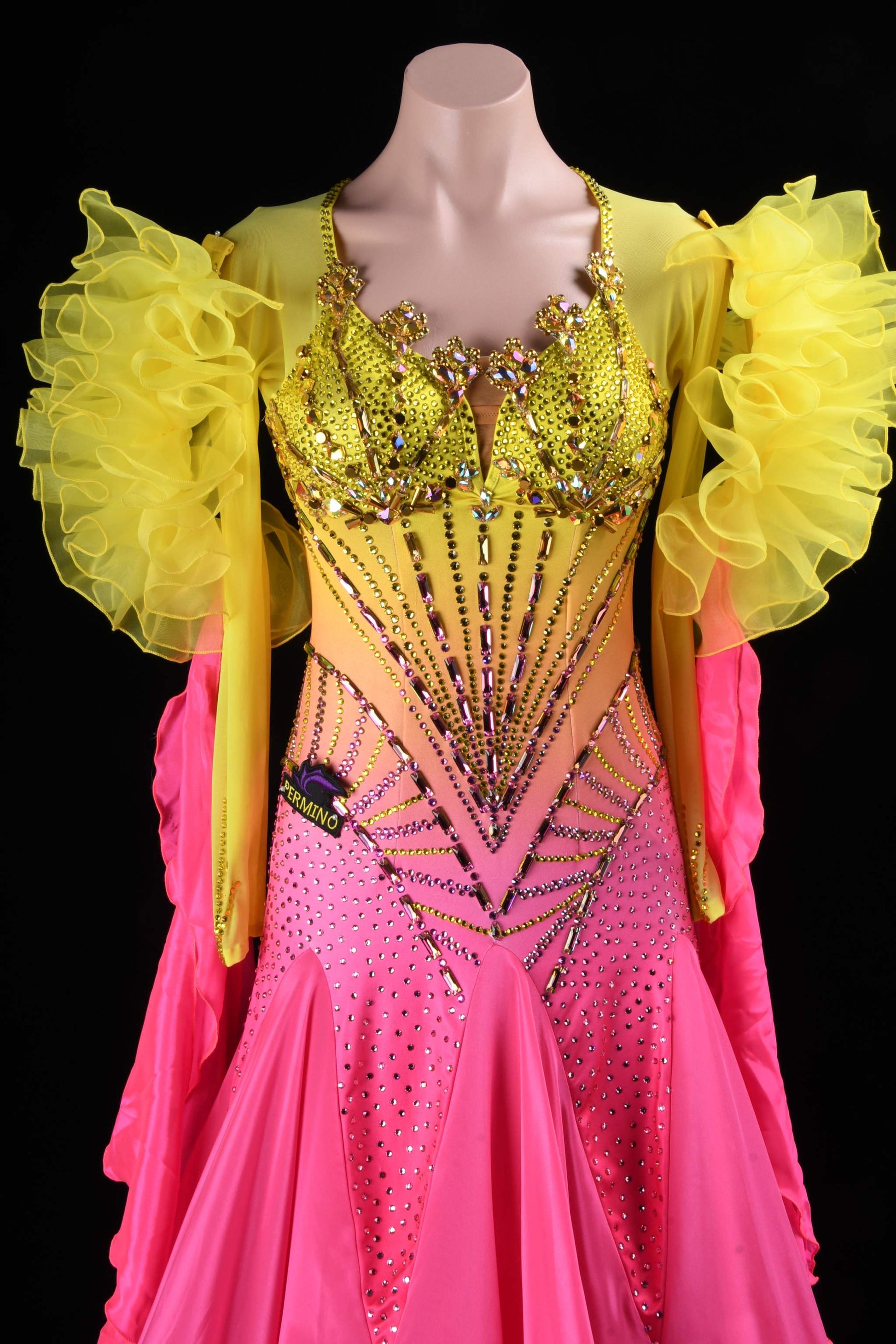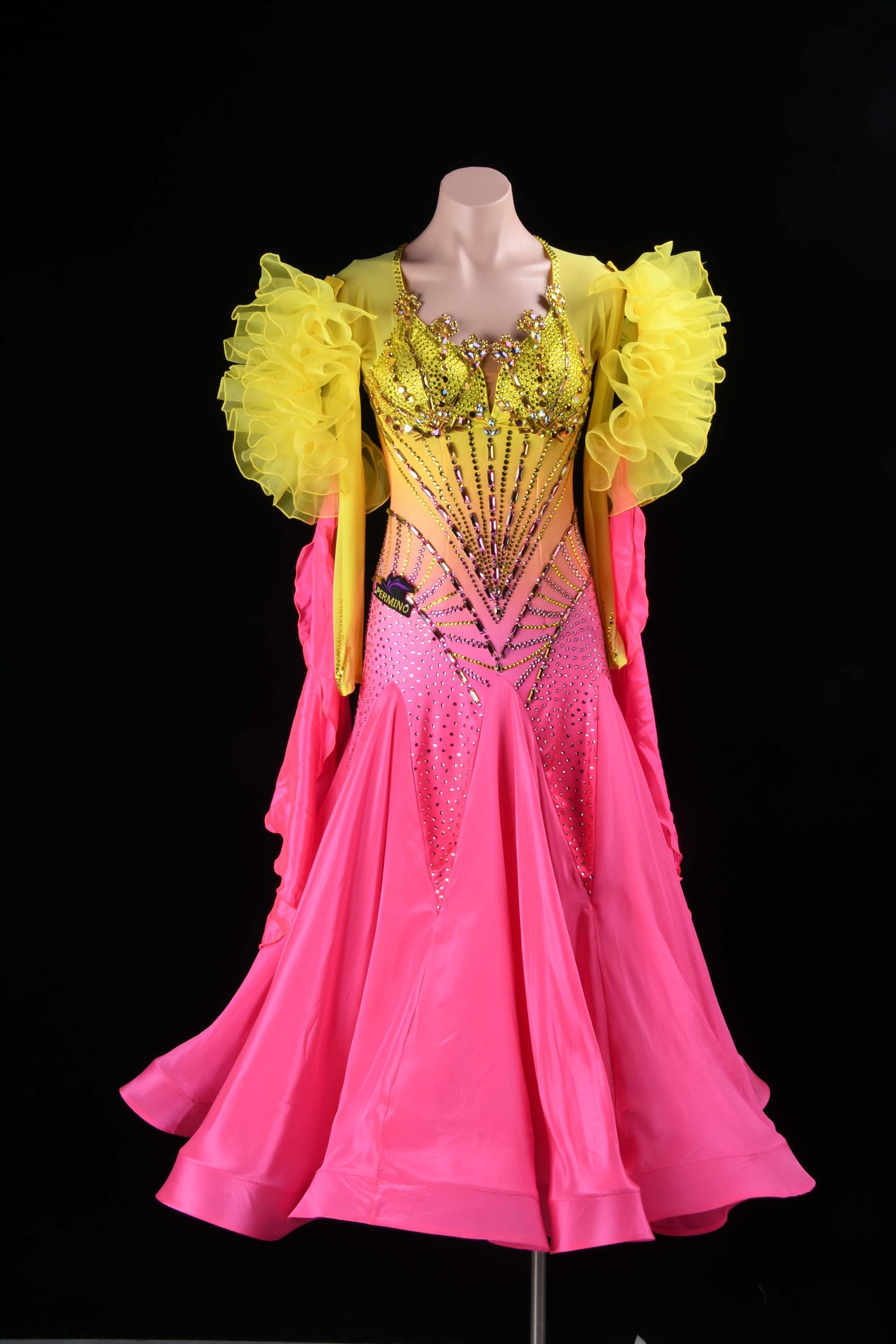 This exclusive ballroom dress features a striking blend of two vivid colors, enhanced by long sleeves and dazzling stone details. With intricate shoulder designs and a full, flowing crinoline, it offers both grace and dynamic movement, ensuring you stand out and captivate every audience on stage.