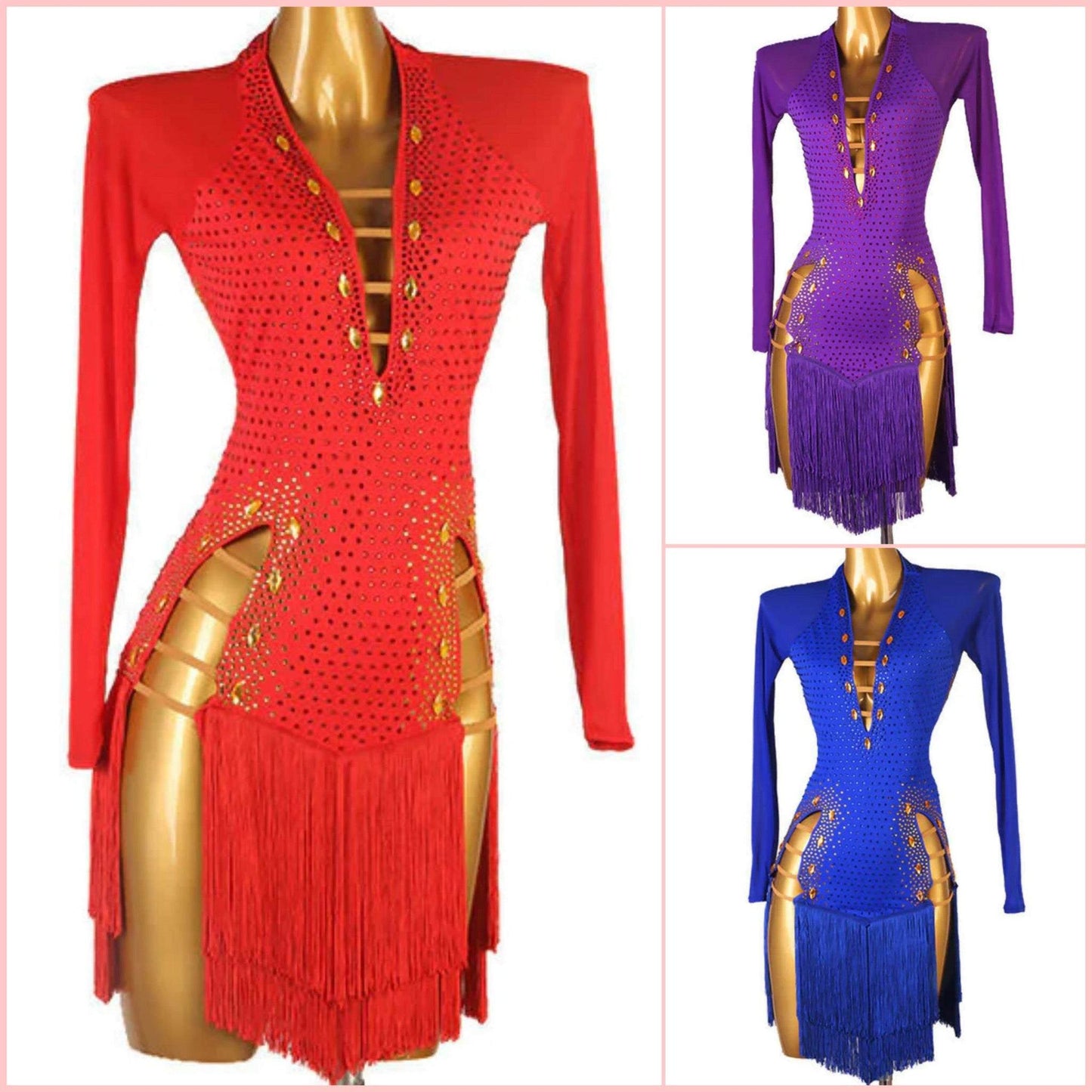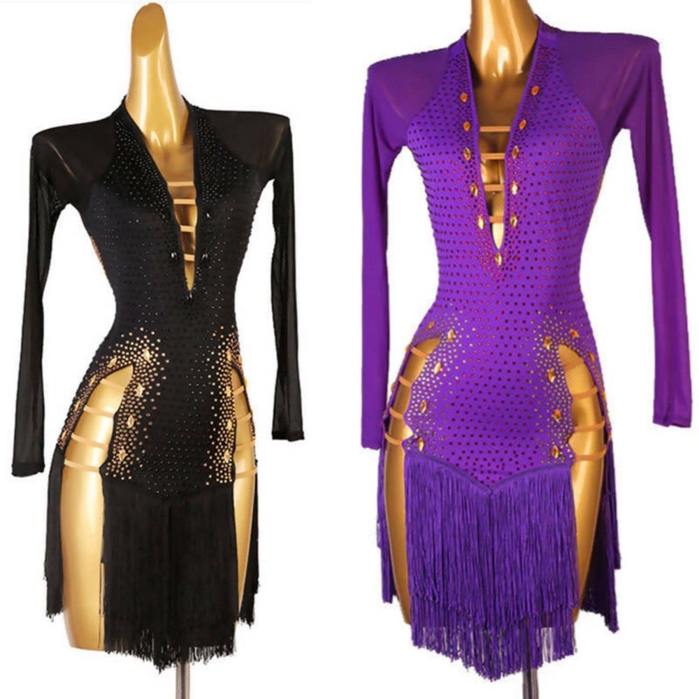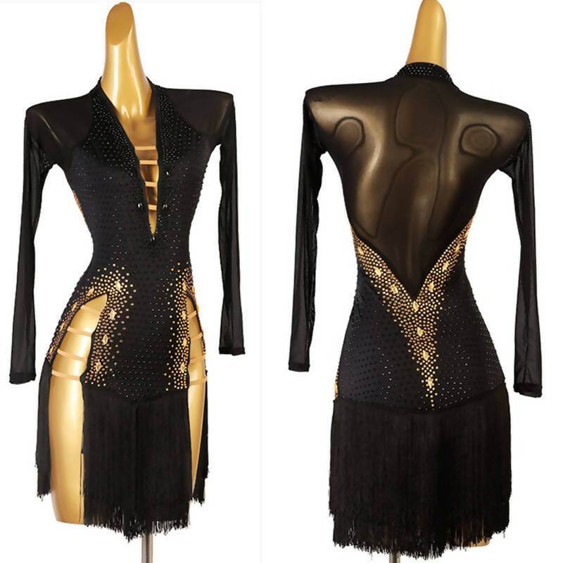 Custom-made to perfection, this enchanting ensemble is tailored to your measurements, ensuring a flawless fit and exquisite design. The fringed skirt adds a touch of latin character to your movements, while the deep décolleté and long sleeves strike the perfect balance between allure and sophistication.