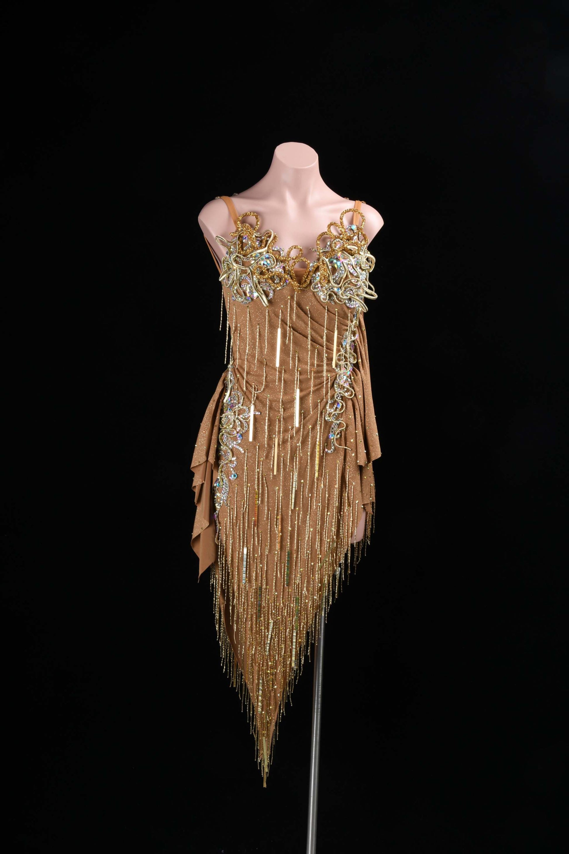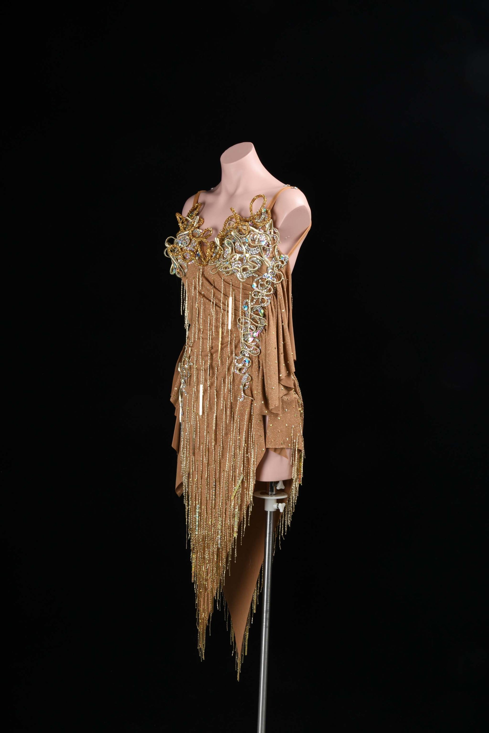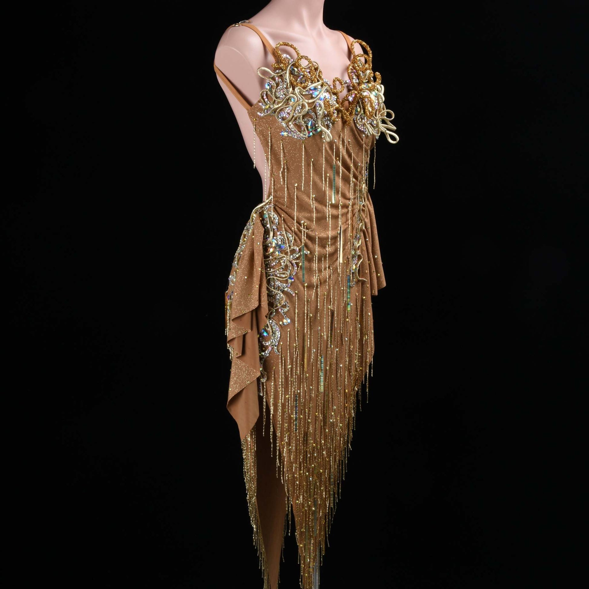 Make a statement in this stunning brown latin dress adorned with intricate beadwork, and sequins details. Perfect for stage or glamorous events, it combines elegance with bold sparkle and movement for unforgettable allure.