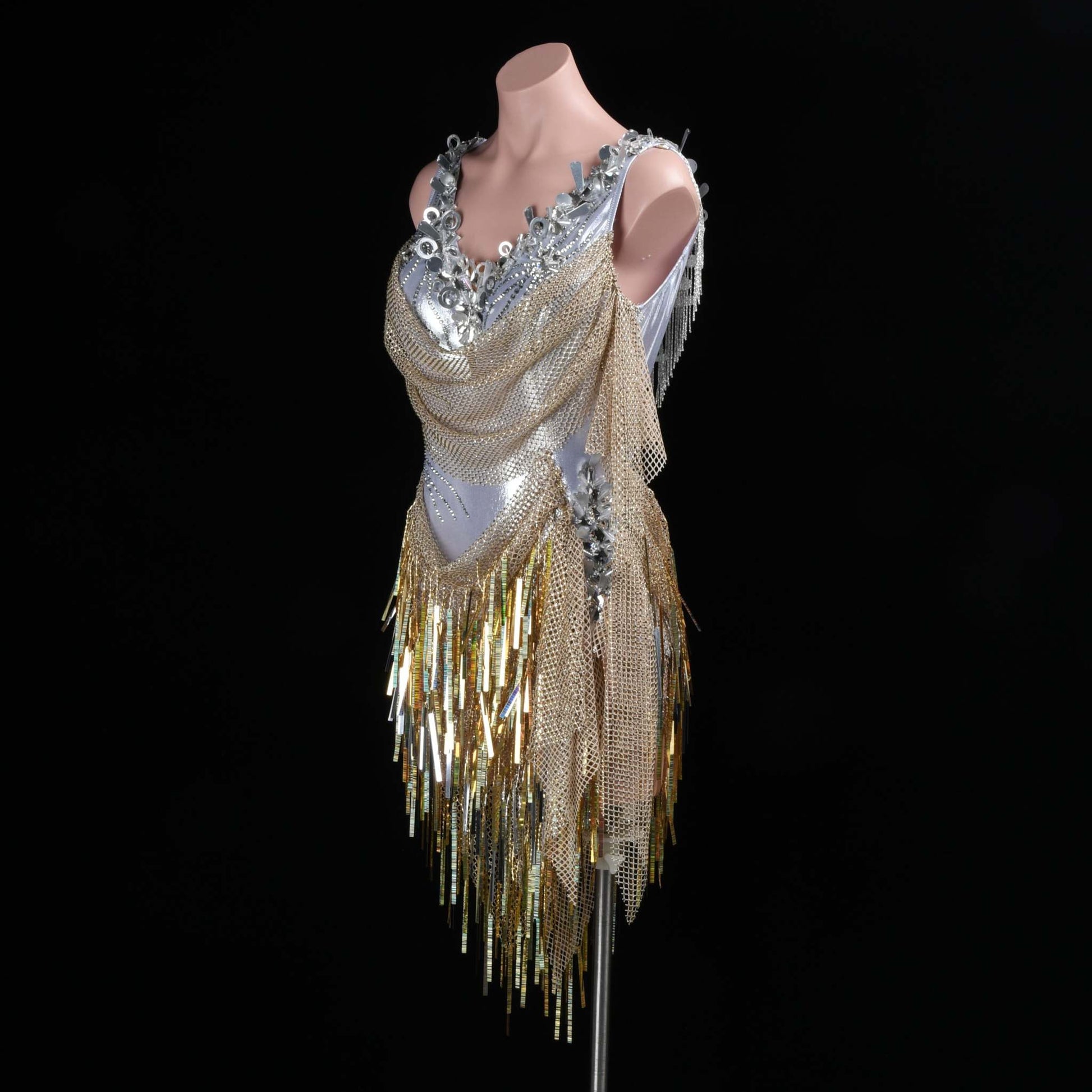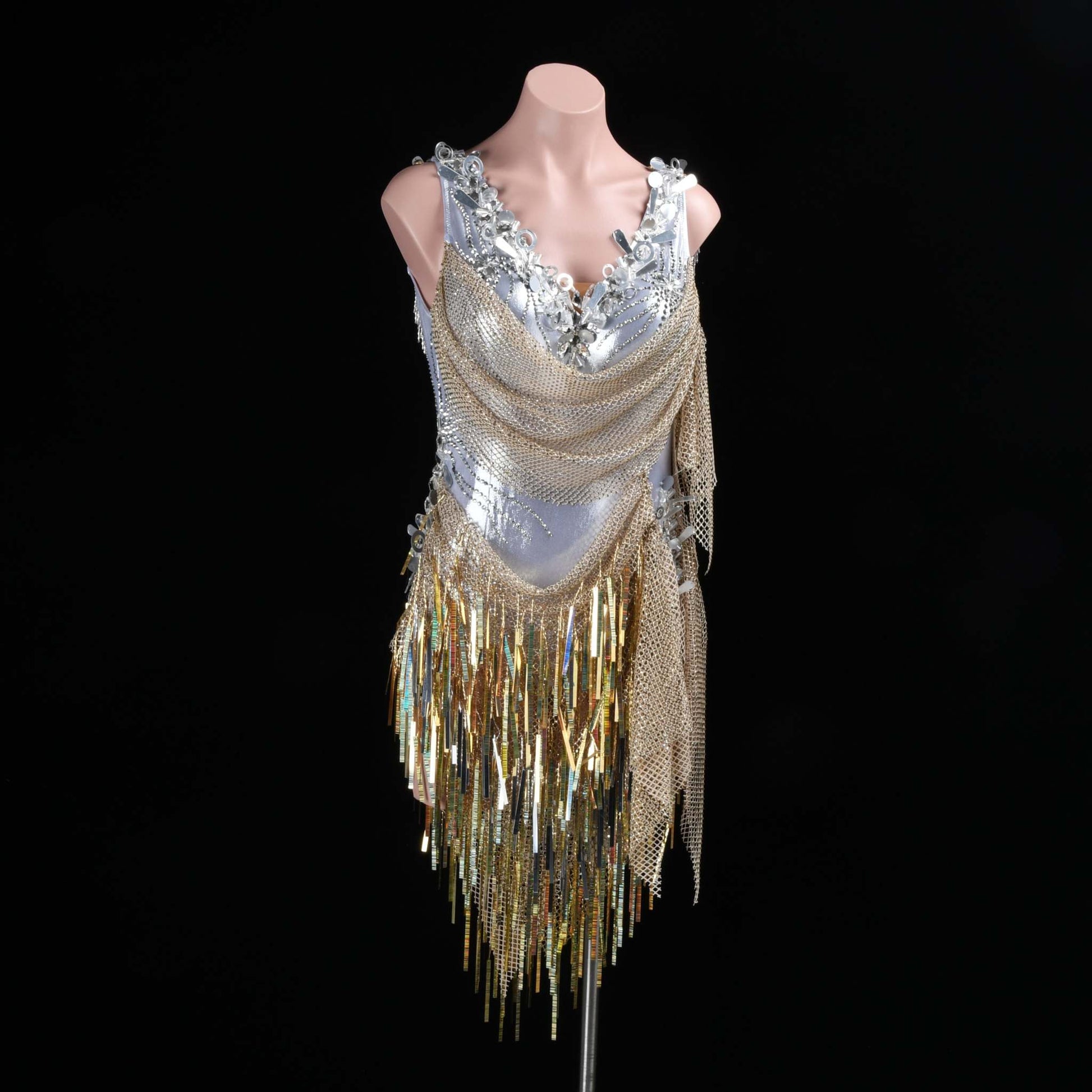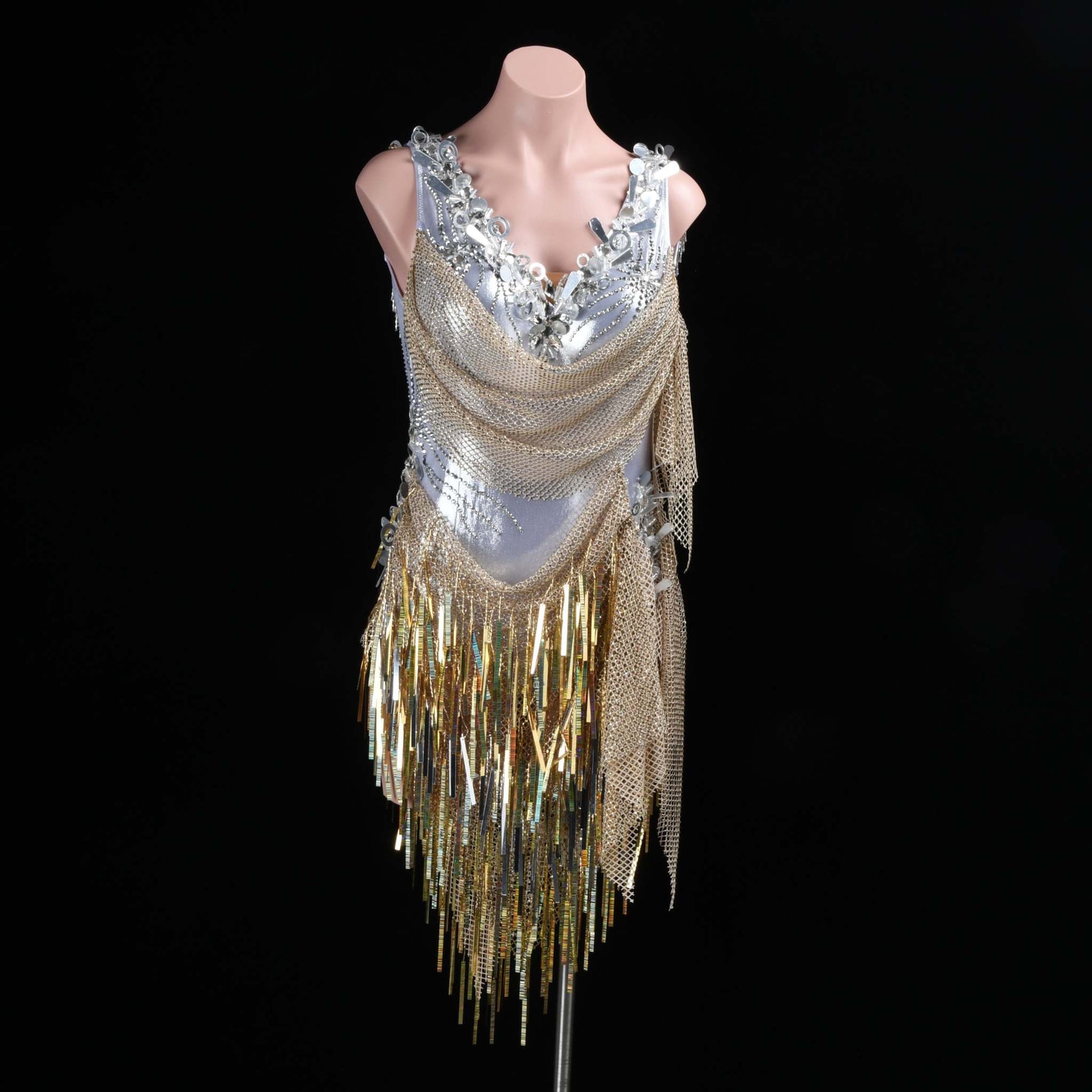 Turn heads in this dazzling silver and gold dress with beads, and sequins accents. Ideal for performances or elegant occasions, it blends sophistication with striking shimmer and dynamic flair to ensure you captivate every audience.
