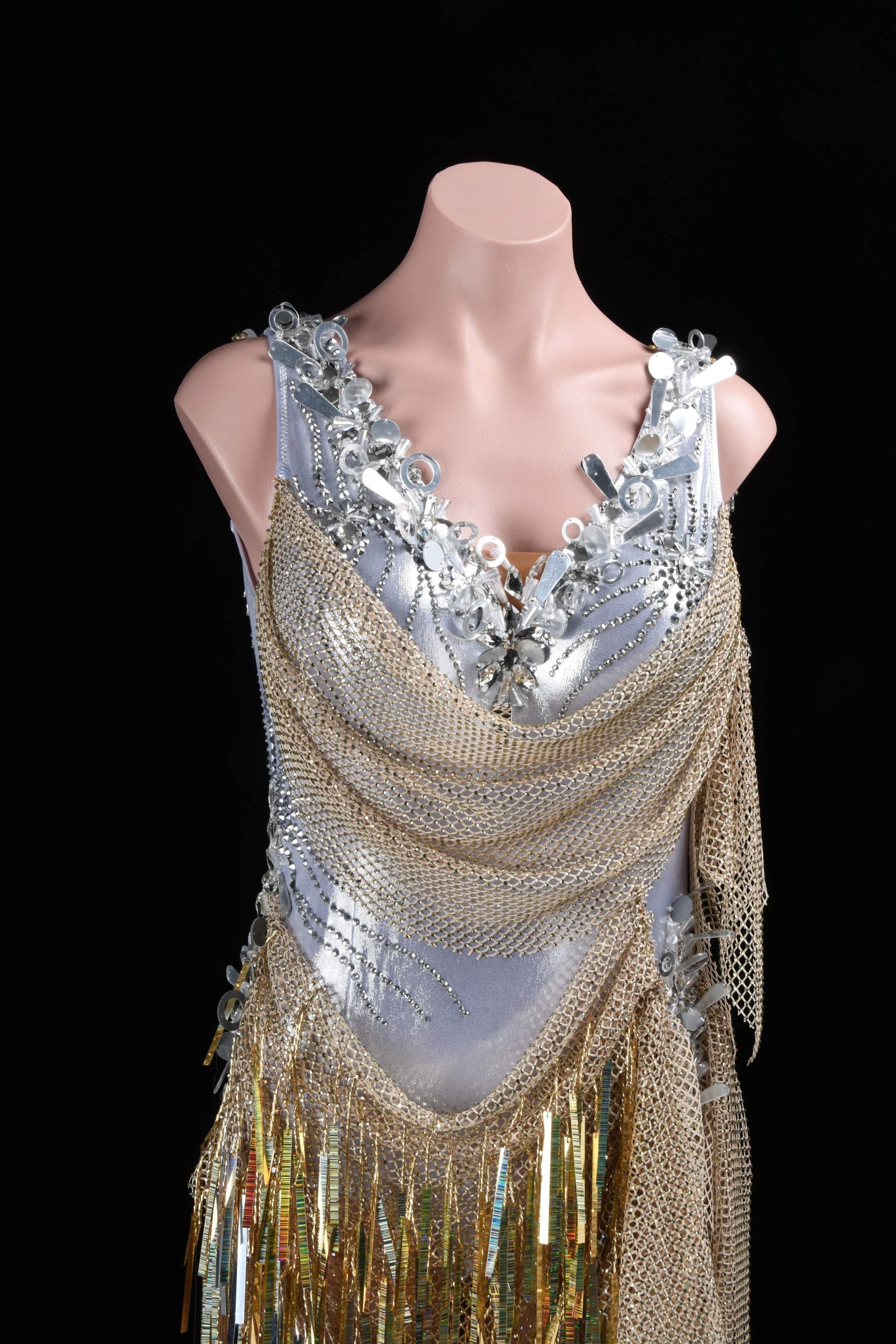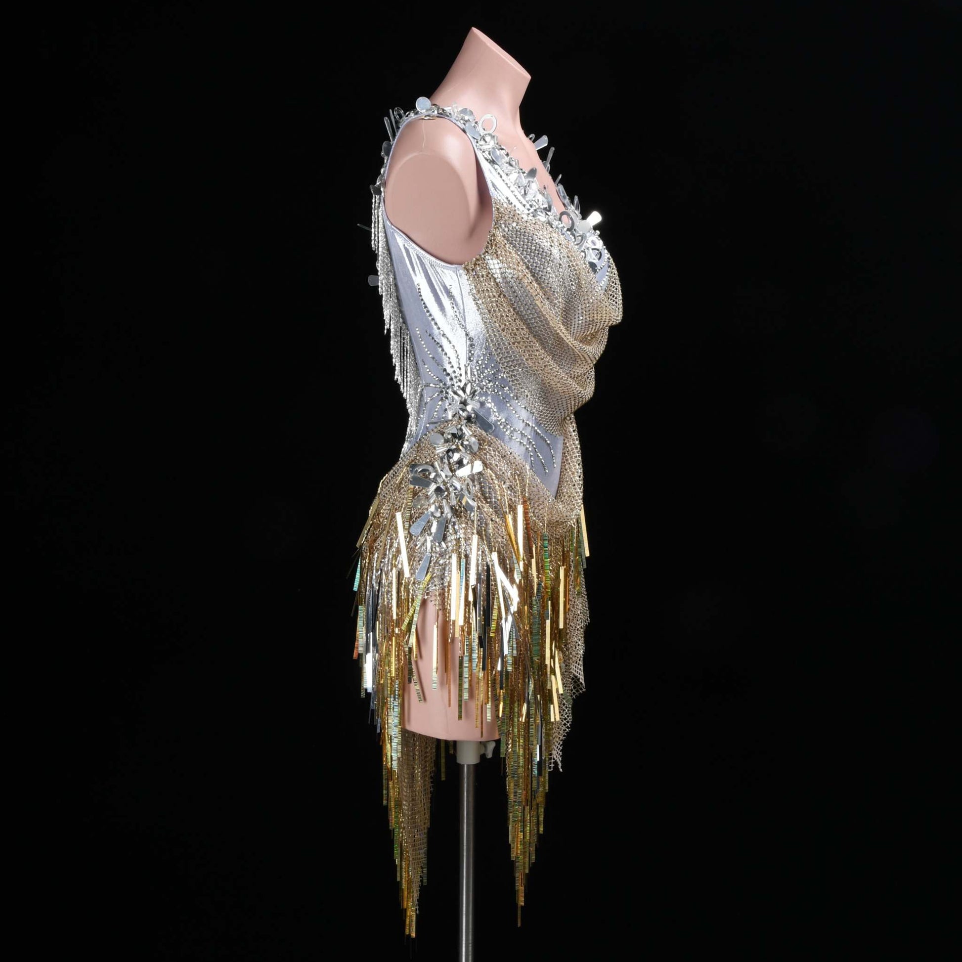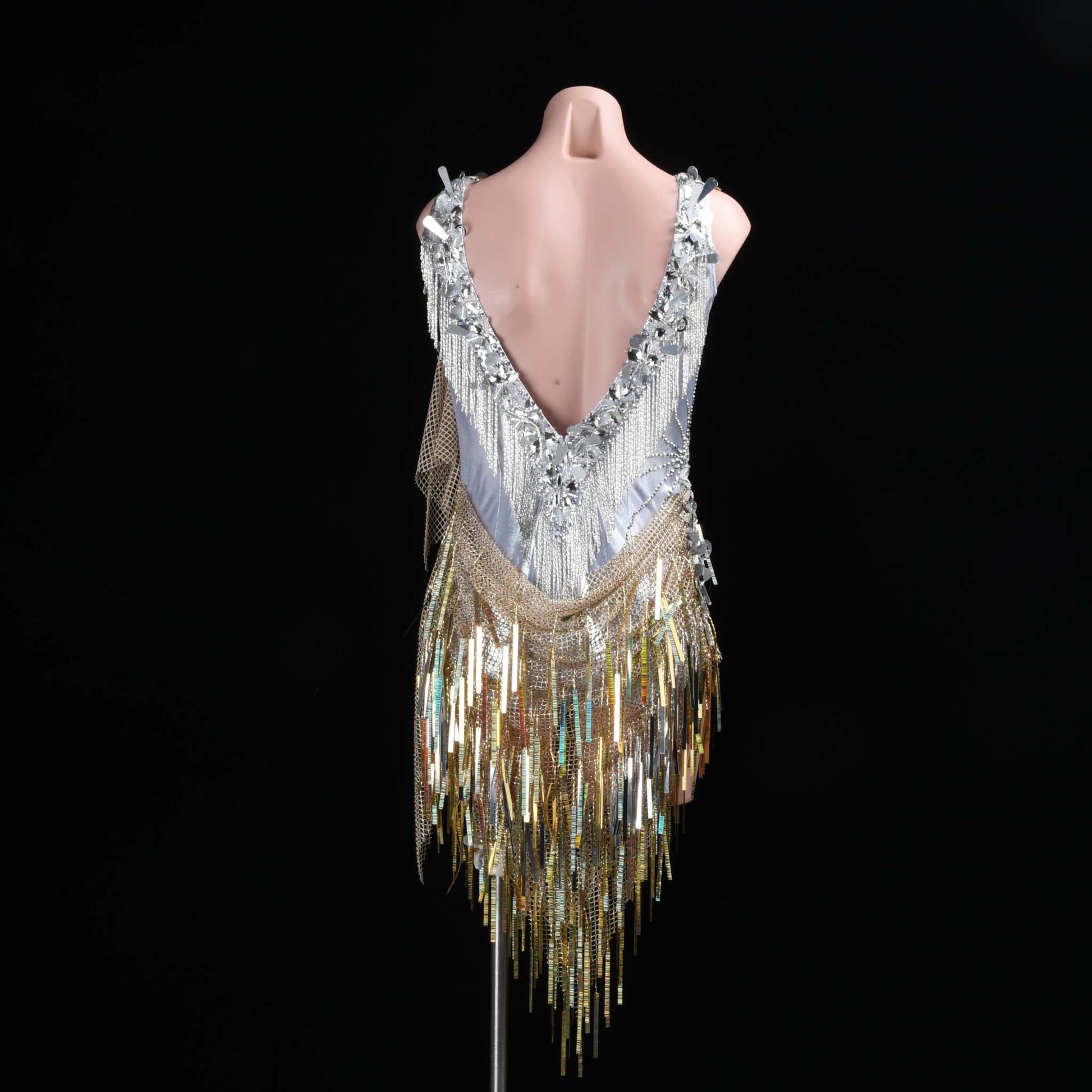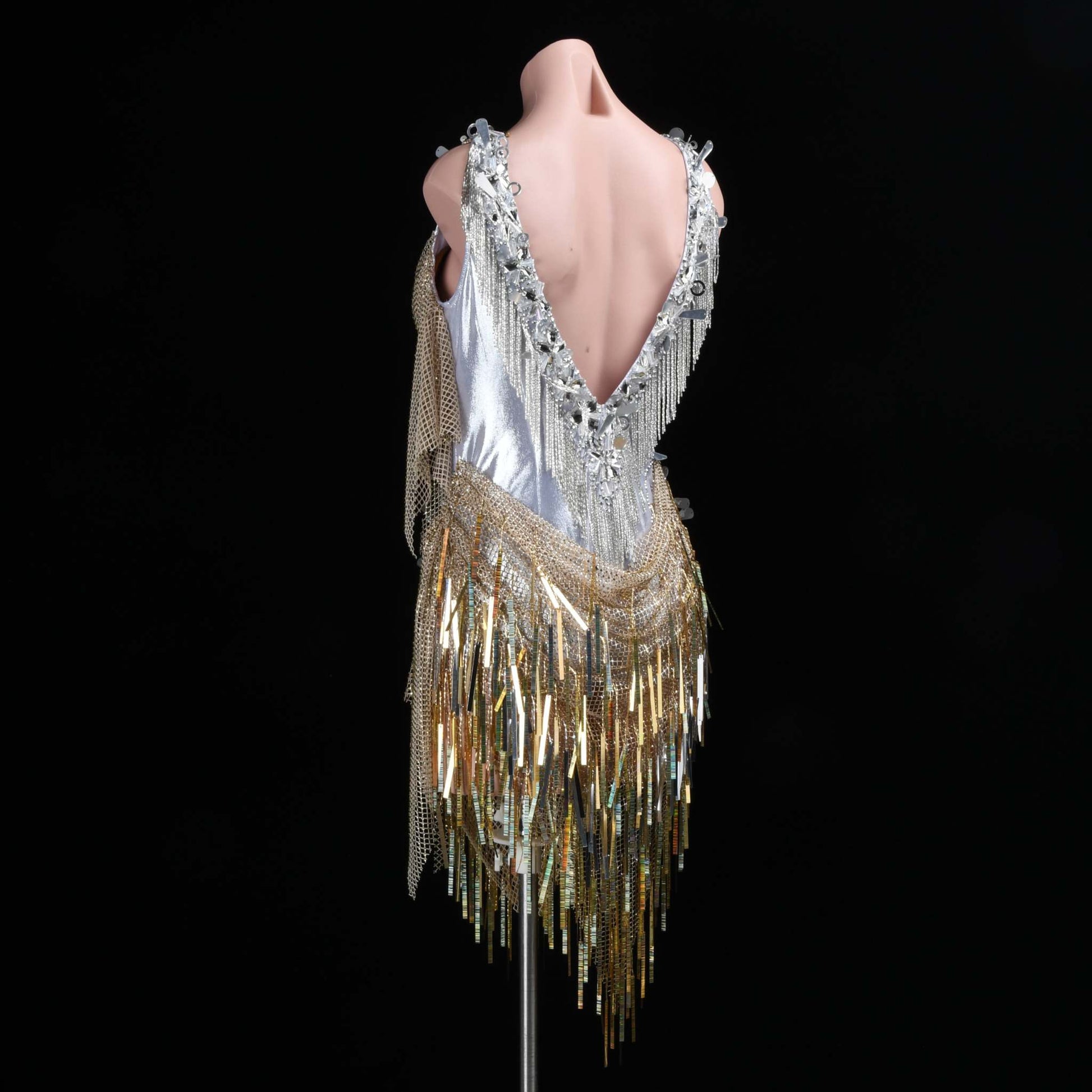 Turn heads in this dazzling silver and gold dress with beads, and sequins accents. Ideal for performances or elegant occasions, it blends sophistication with striking shimmer and dynamic flair to ensure you captivate every audience.