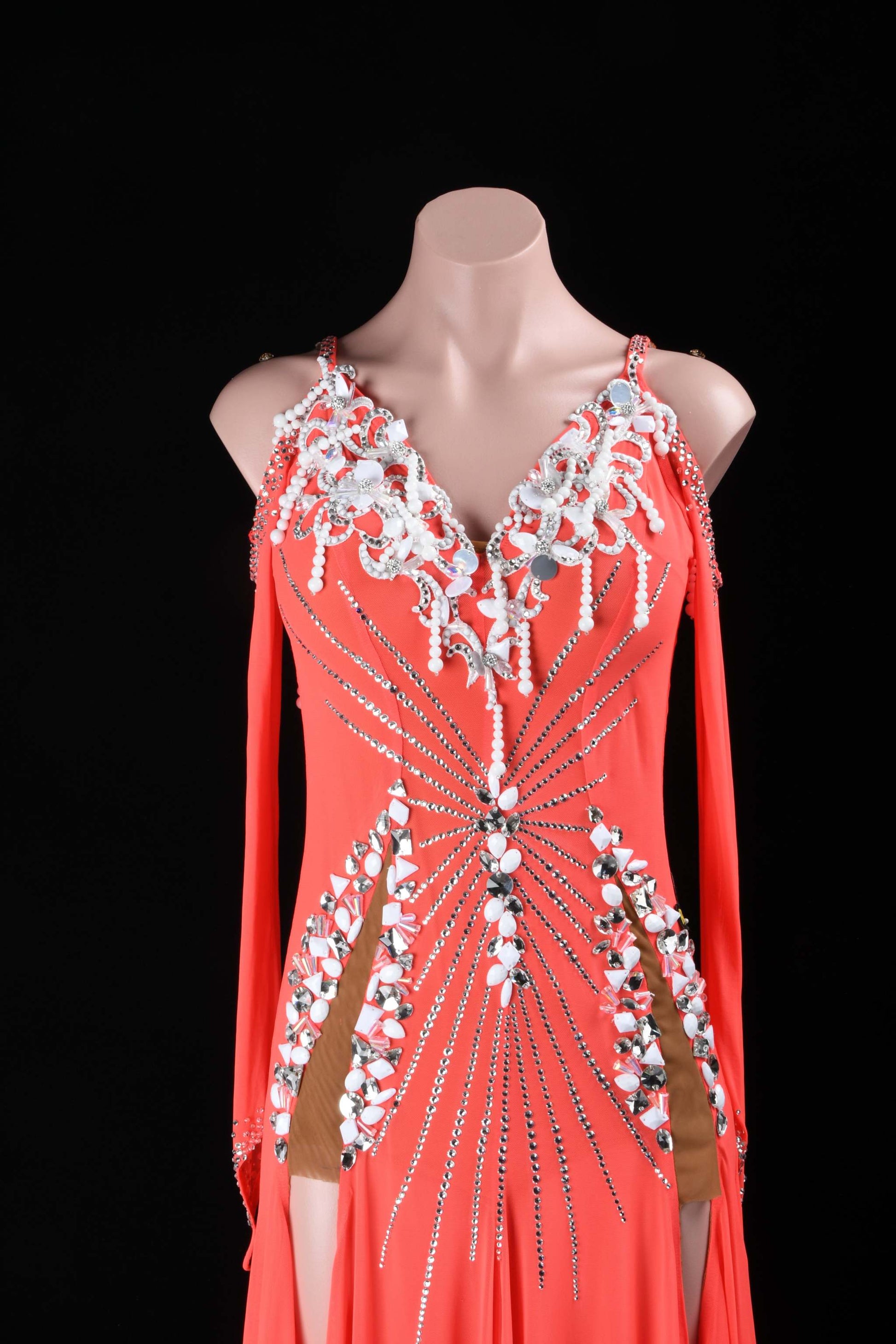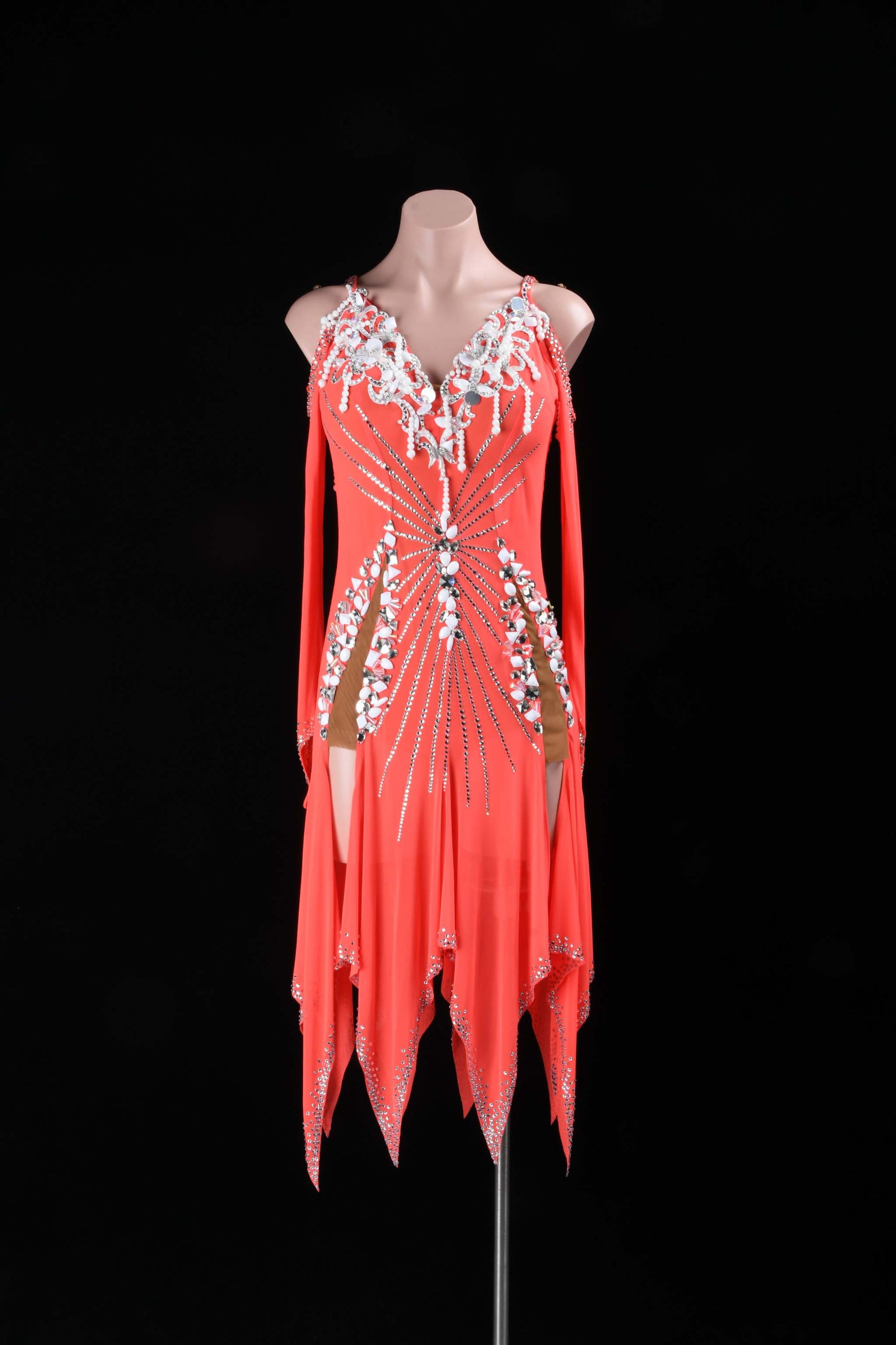 Stand out with this stunning red latin dress, crafted with open shoulders, long sleeves, and shimmering stone details. The asymmetric skirt enhances your every move, making it an excellent choice for dance routines or stage appearances.