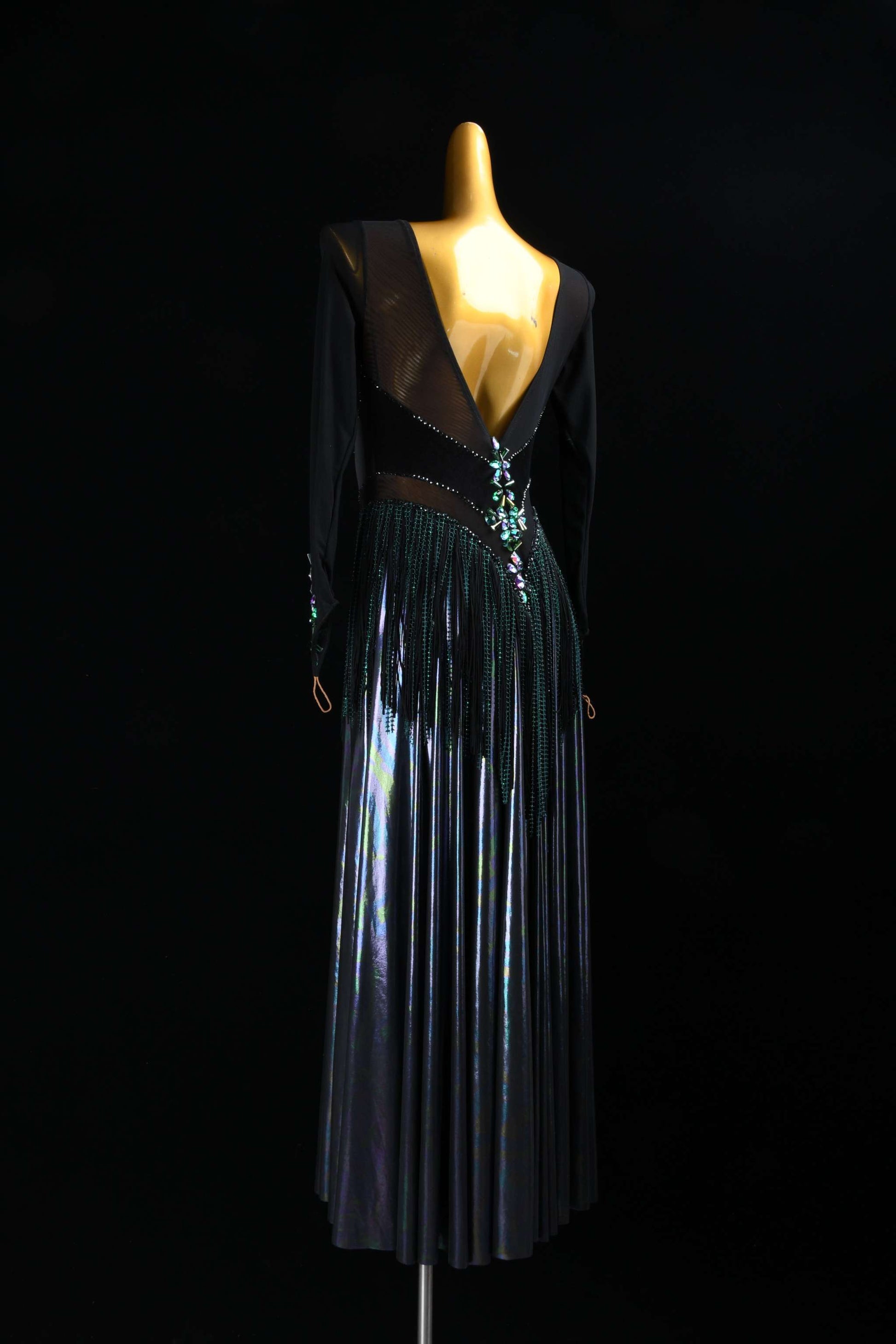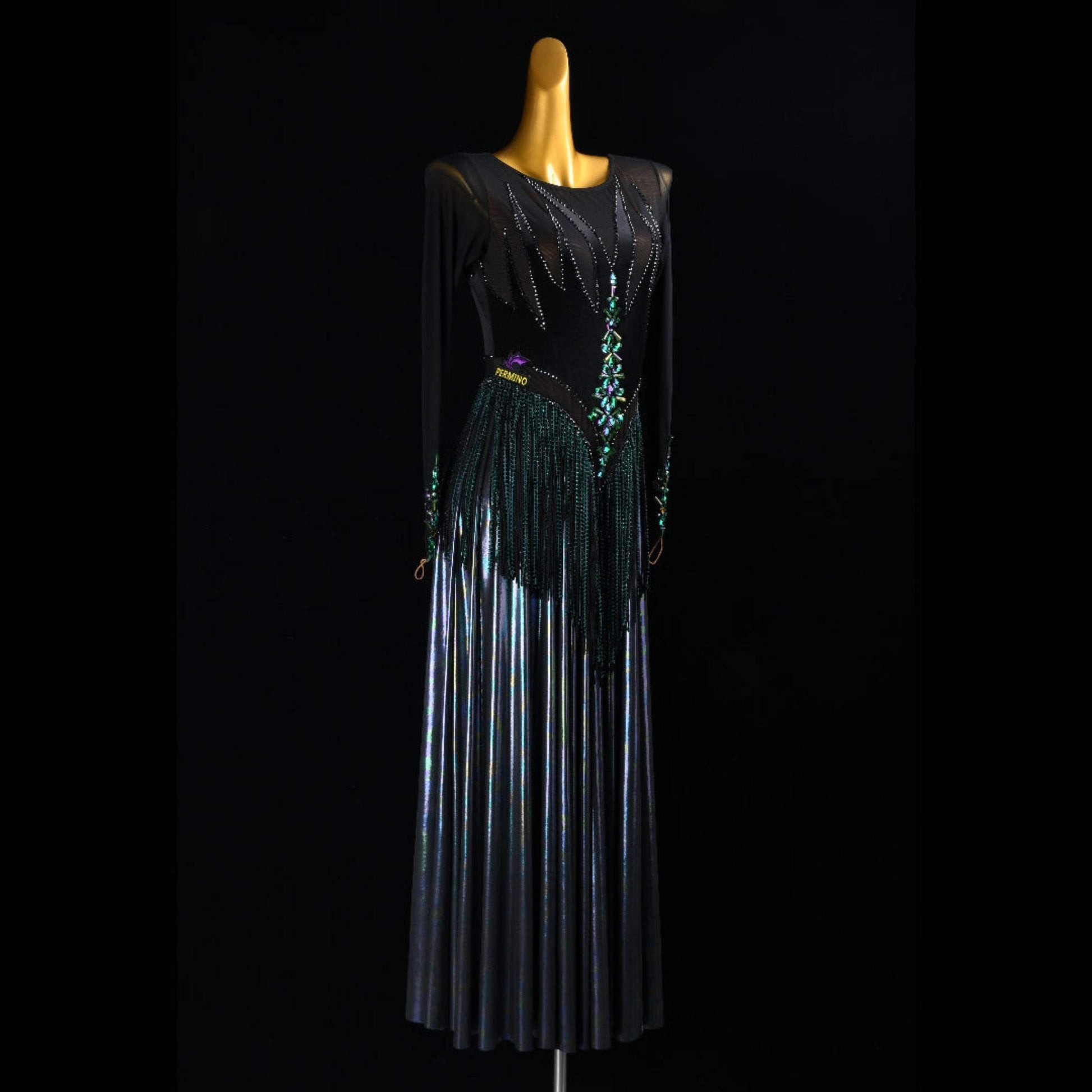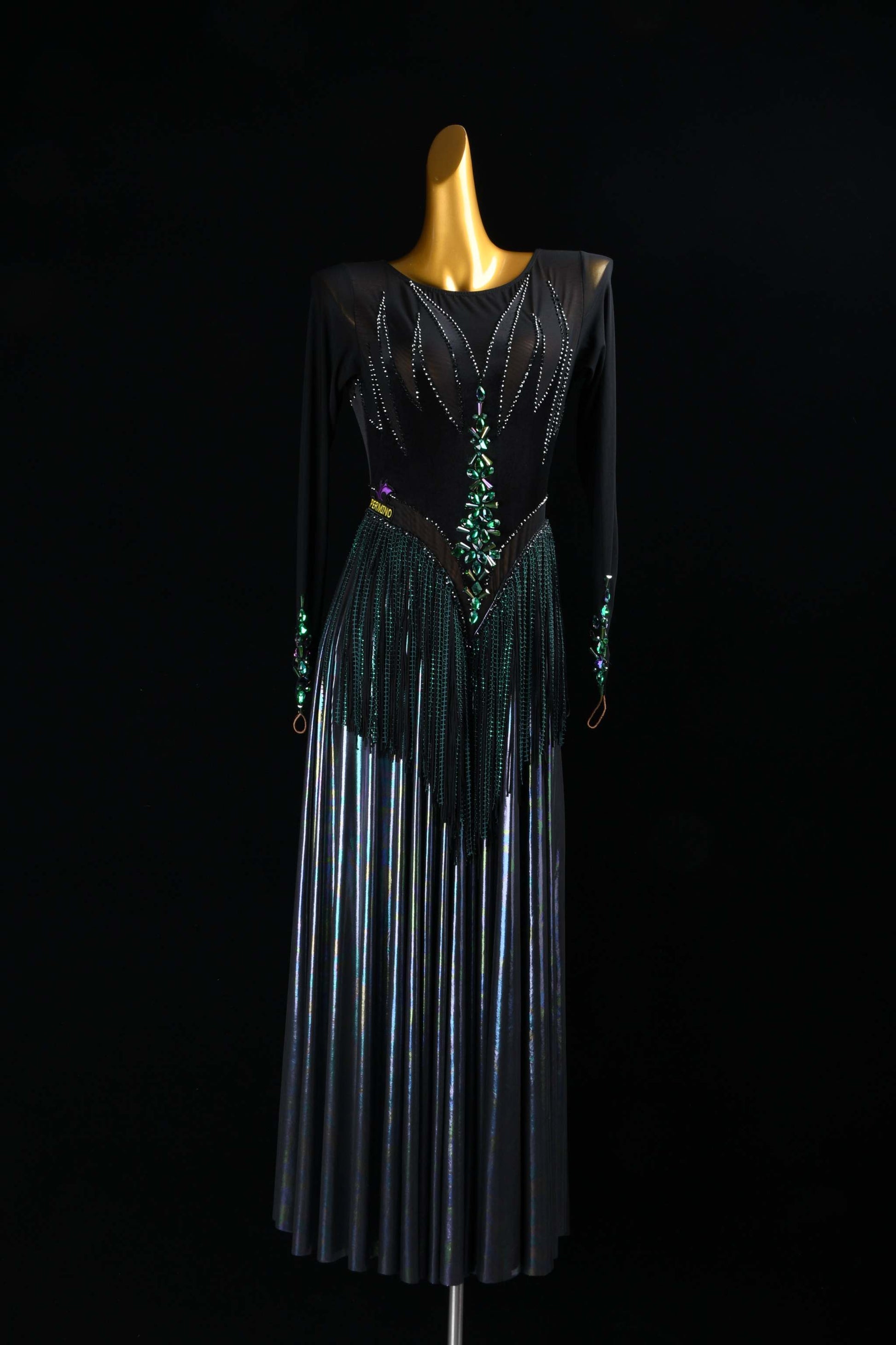 This stunning custom american smooth dress combines black and metallic grey with long sleeves, embellished with sparkling stones and intricate central details. Designed to highlight your elegance and draw all eyes during your performance, it perfectly balances sophistication and flair.