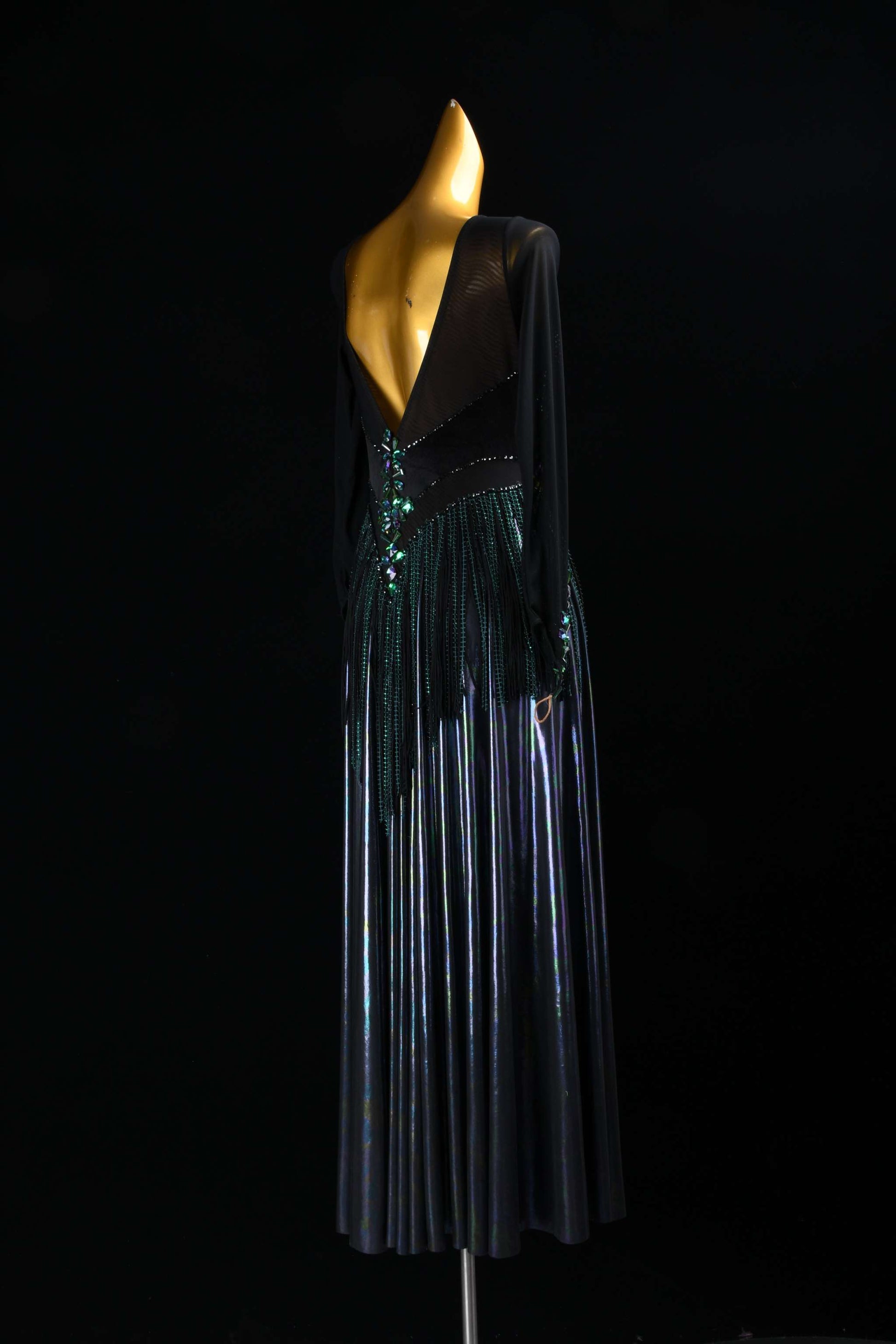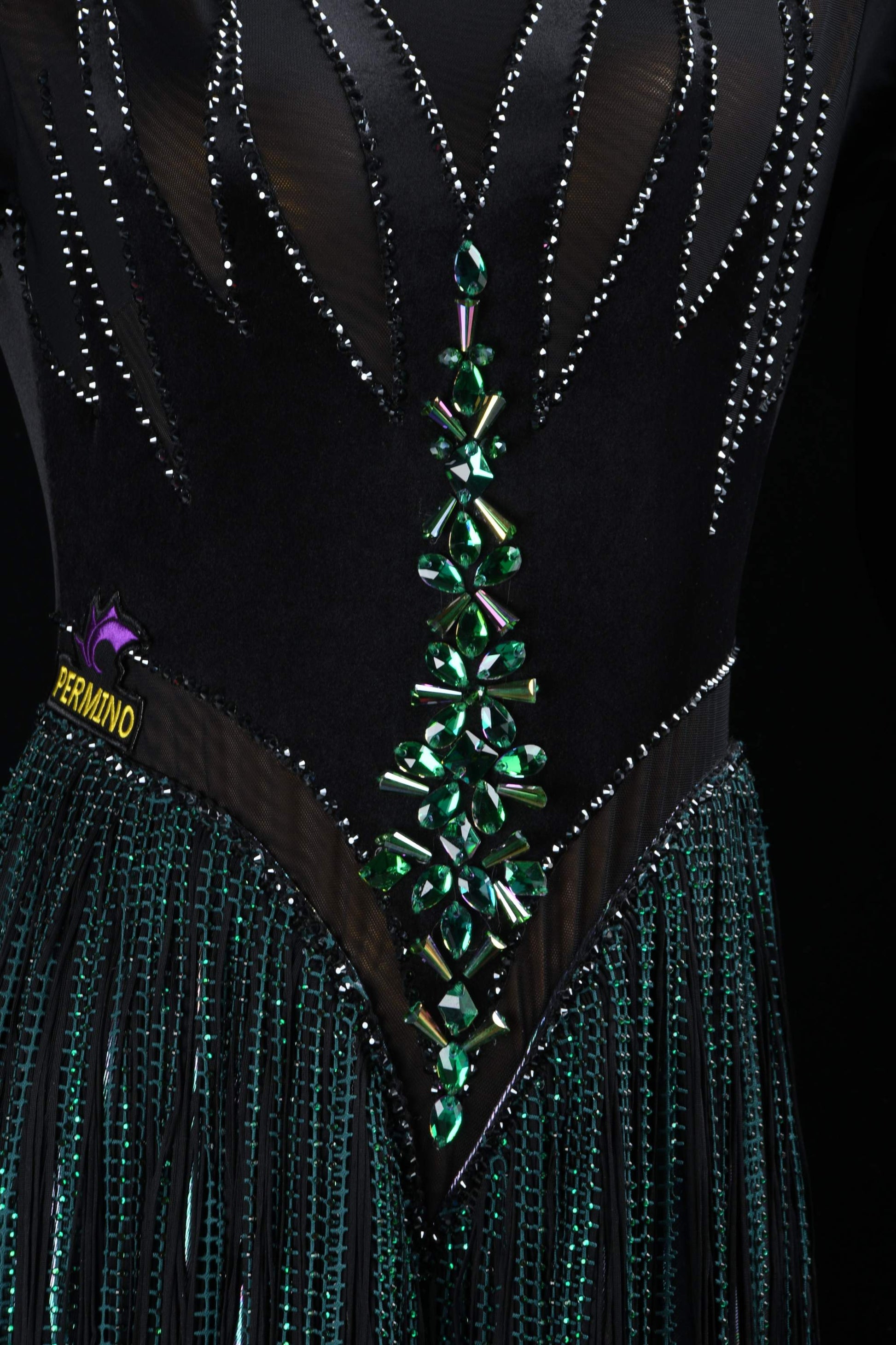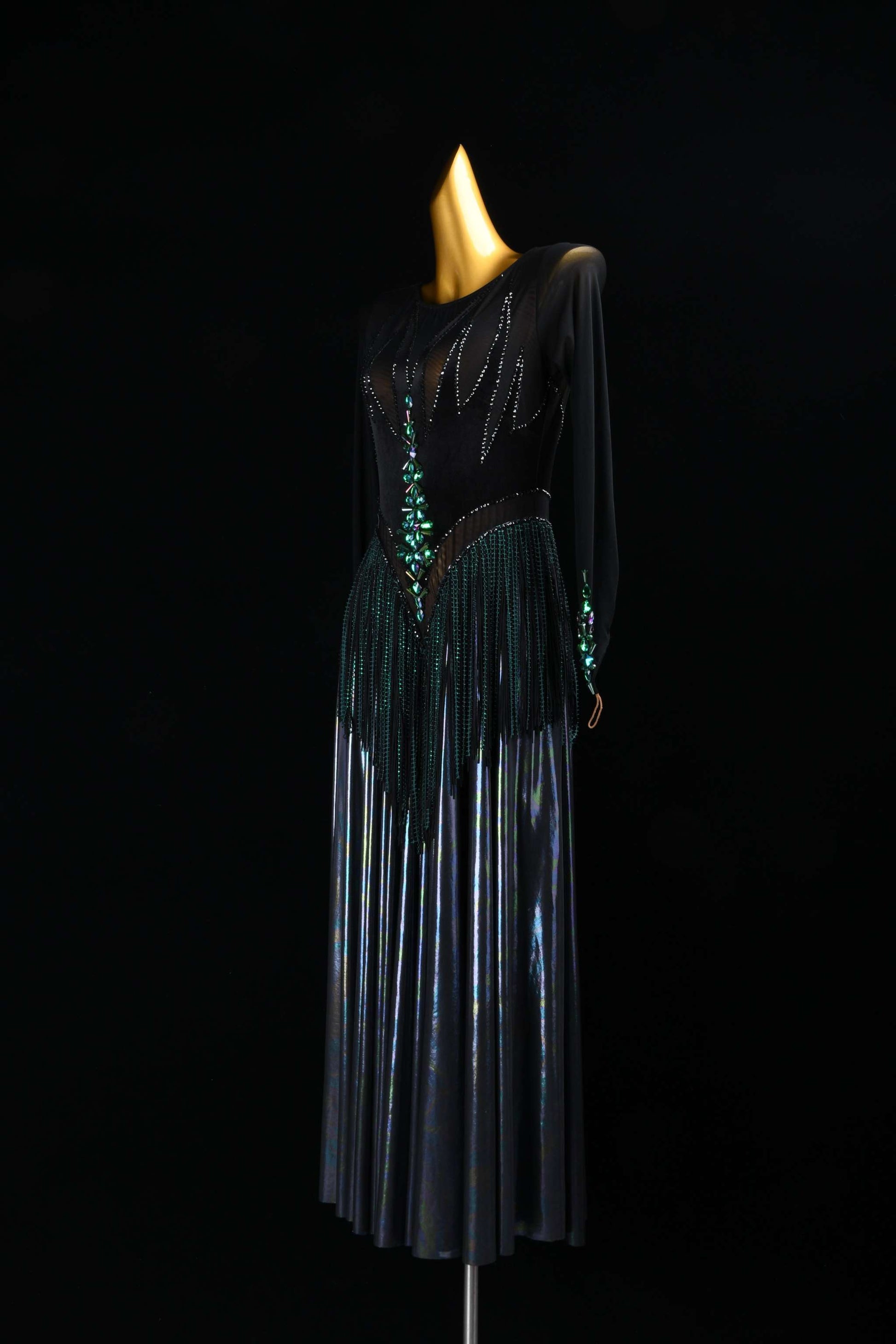 This stunning custom american smooth dress combines black and metallic grey with long sleeves, embellished with sparkling stones and intricate central details. Designed to highlight your elegance and draw all eyes during your performance, it perfectly balances sophistication and flair.