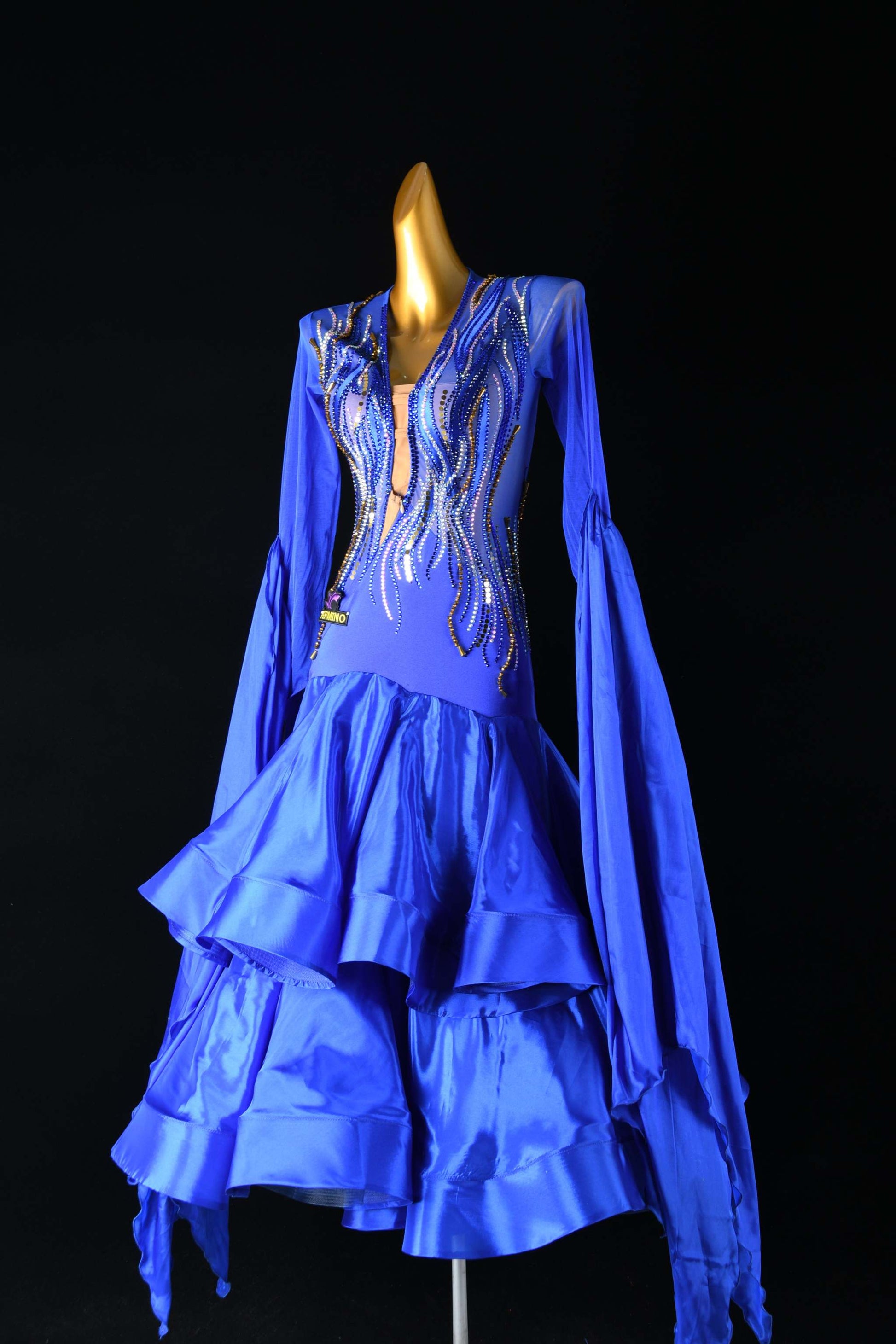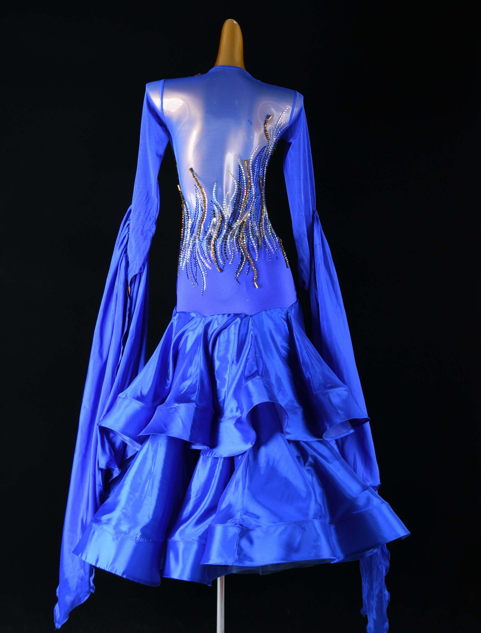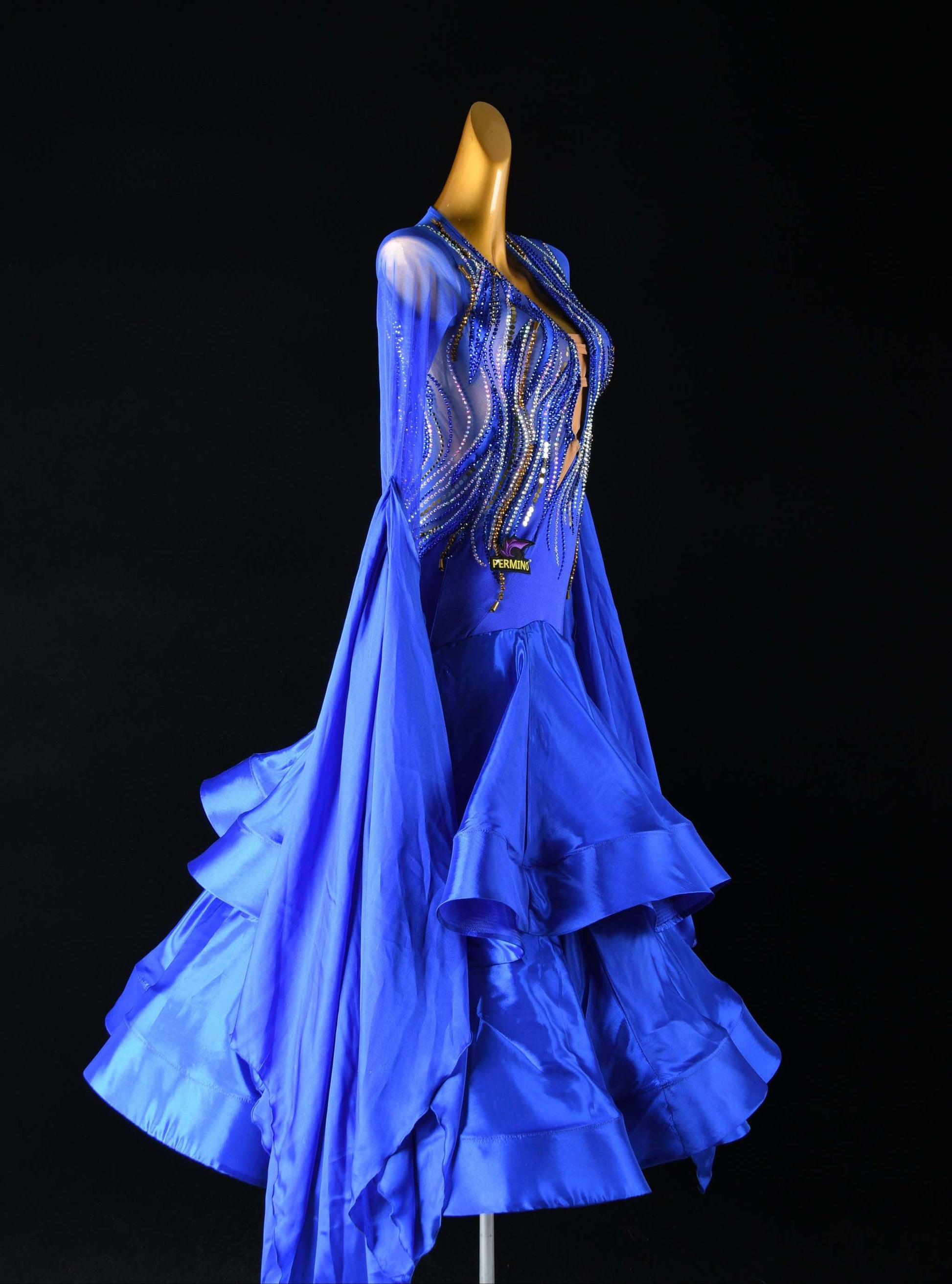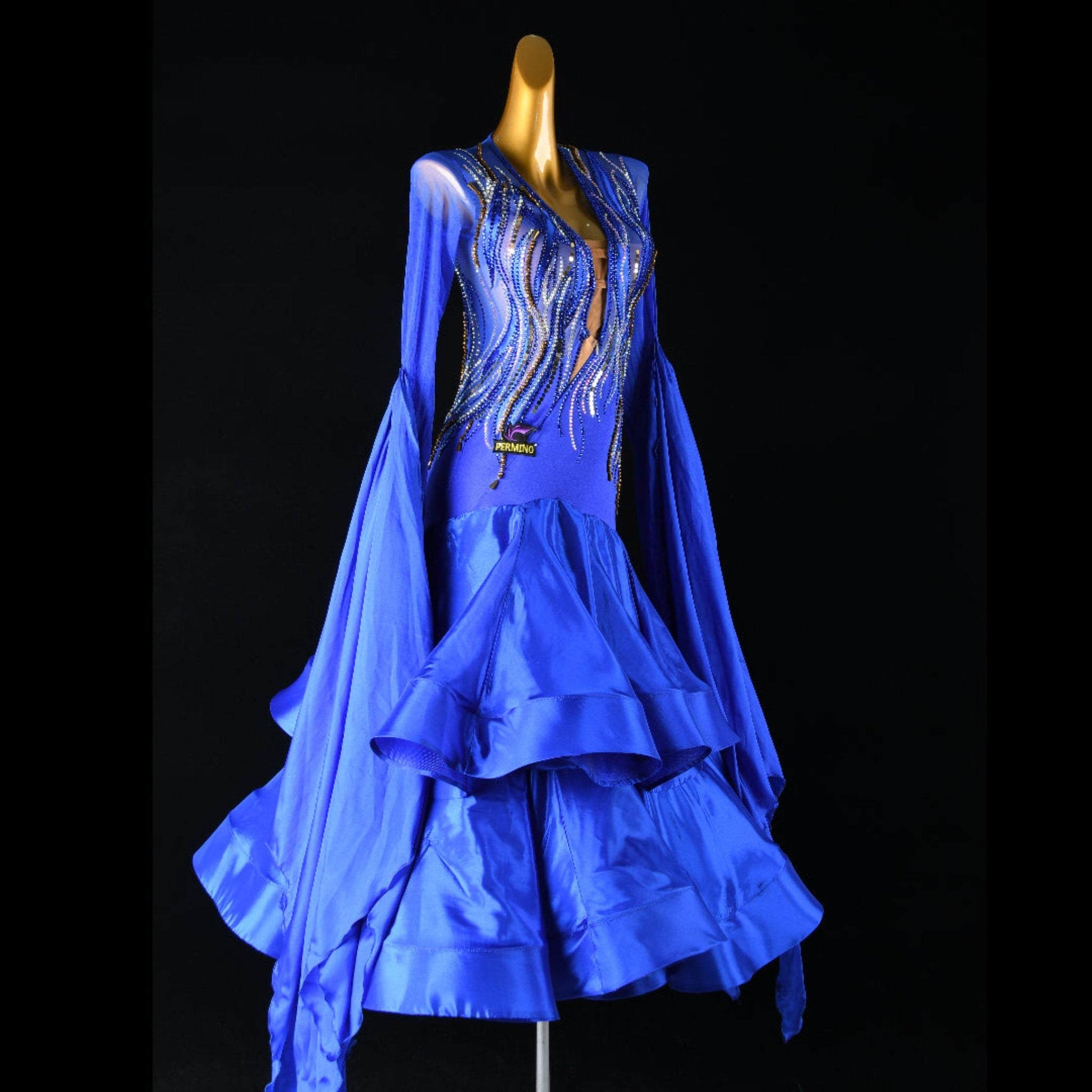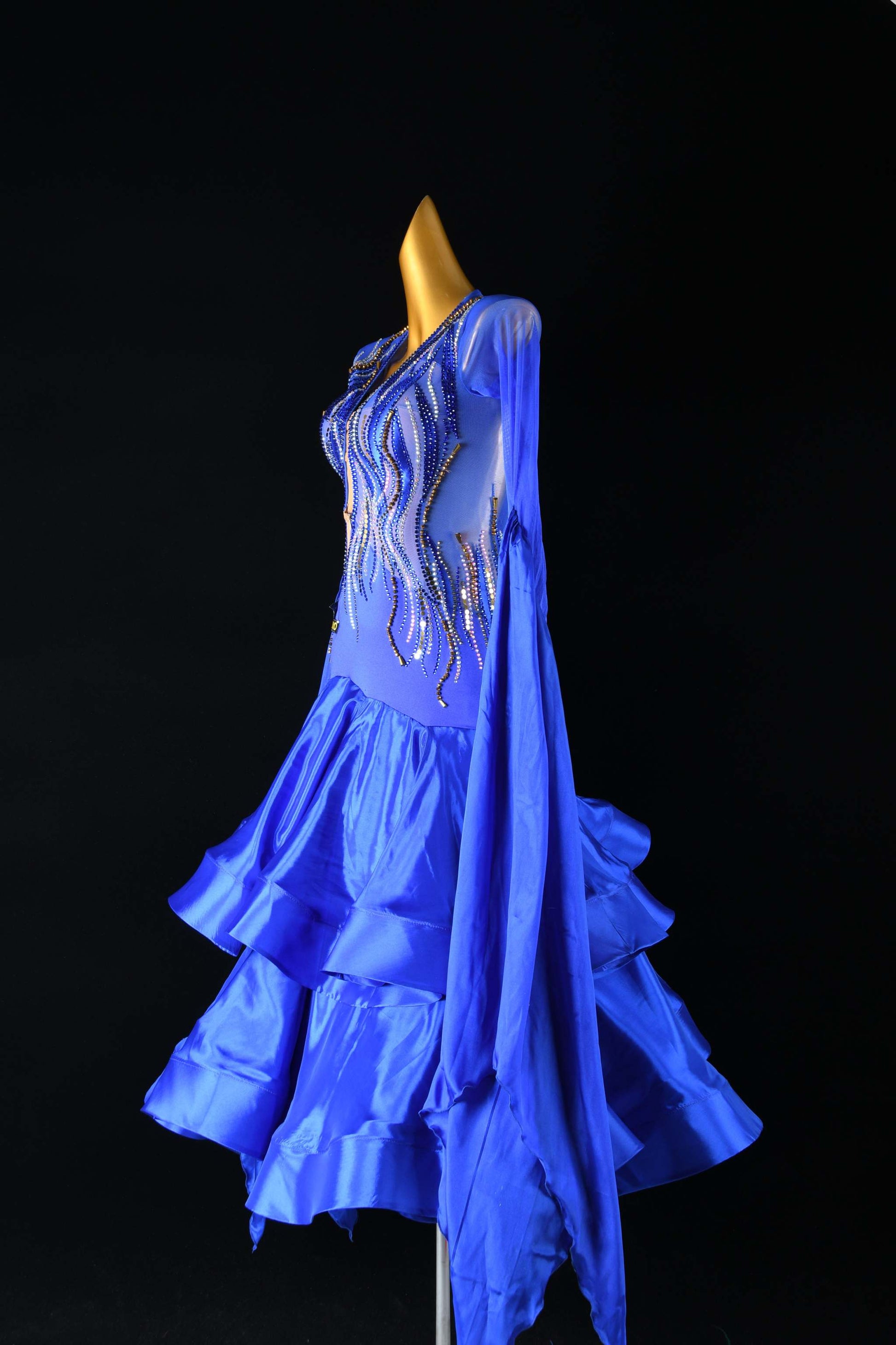 This stunning royal blue ballroom gown features long sleeves and is adorned with shimmering stones, complemented by a voluminous crinoline skirt. Crafted to exude elegance and command attention, it’s ideal for competitions and sophisticated performances.