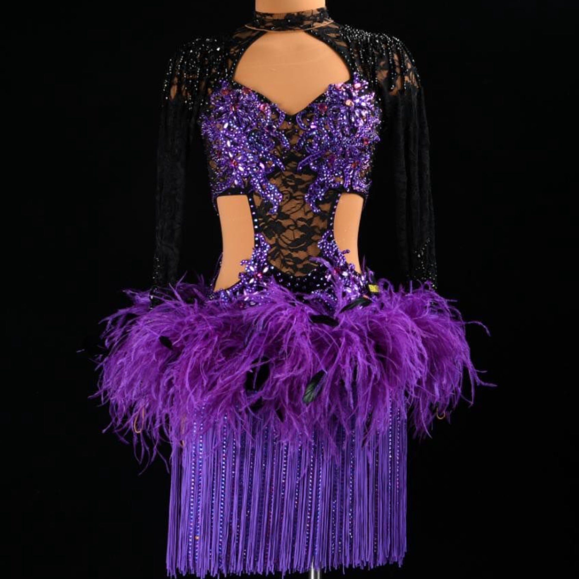 Step into the spotlight with this stunning purple latin dress, featuring sparkling crystals, sheer black lace sleeves, striking cut outs, and rich feathers layered over flowing fringe. Experience a captivating blend of sophistication and passion.