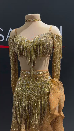 Indulge in elegance on the dance floor with this magnificent nude latin dress from Savich Art! Adorned with opulent gold details, regal long sleeves, and a full crinoline skirt, this dress embodies luxury, poise, and fluidity - a must-have for dancers in search of a captivating, performance-ready ensemble.