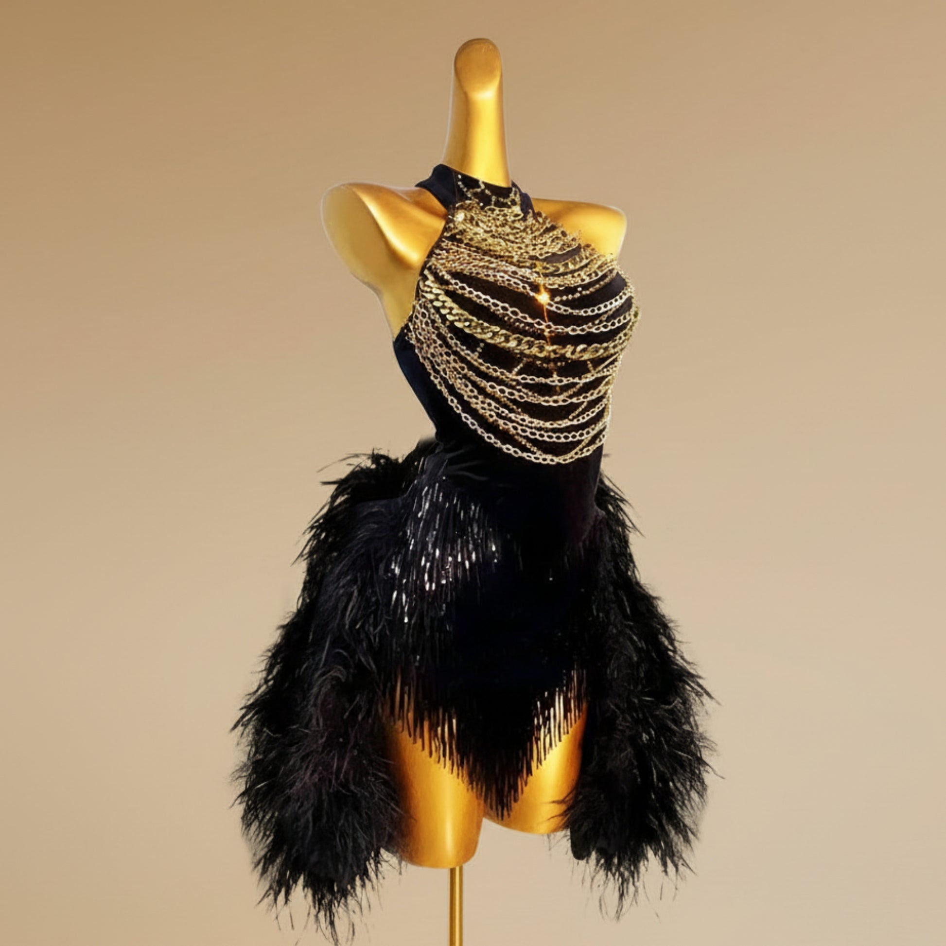 This dress belongs to the darker half of the myth. Black feathers gather at the hips like a living shadow, while cascades of gold chains drape the body in ritual and restraint. Every movement releases a whisper of power, untamed, deliberate, and impossible to ignore.