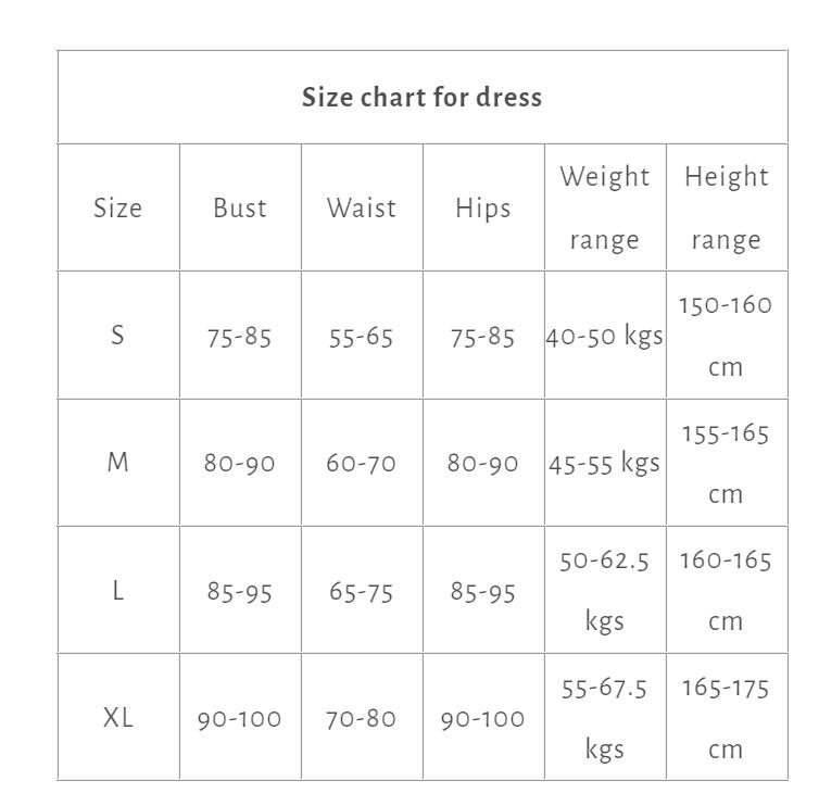 | Size | Bust | Waist | Hips | Weight | Height |