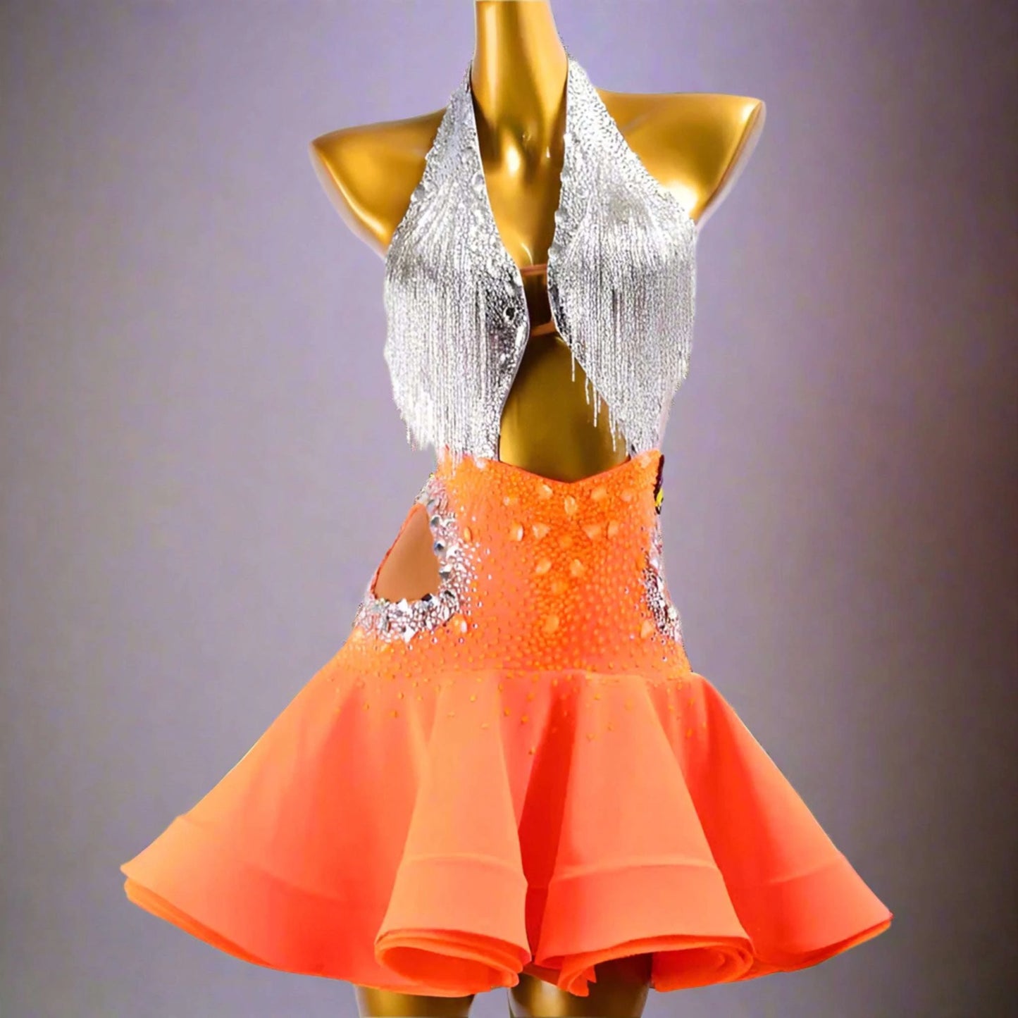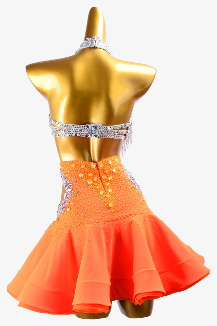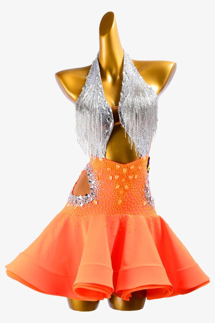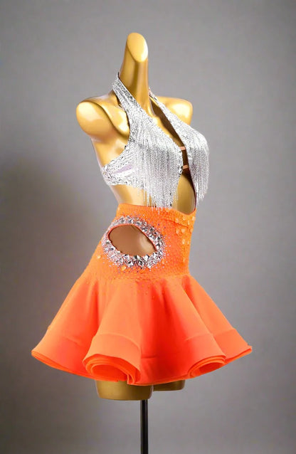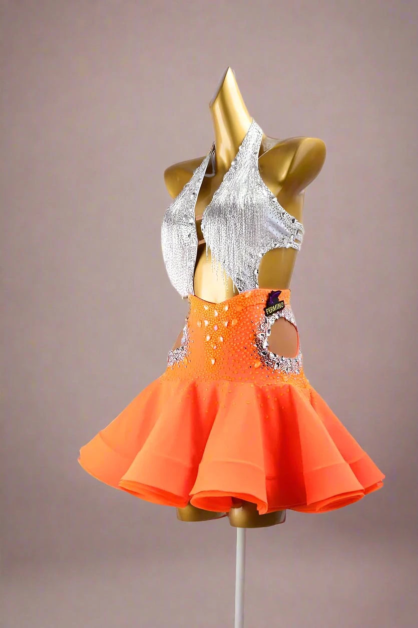 Own the spotlight in the Blaze & Starlight Dress, crafted from silver dot shine lycra and highlighted by a vibrant orangered ruffle fishbone underskirt. Adorned with glittering crystals and elegant beaded fringes, its open-back silhouette adds a captivating edge, ensuring you dazzle at every competition.