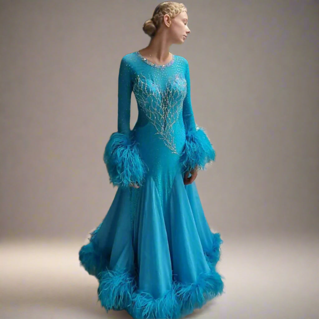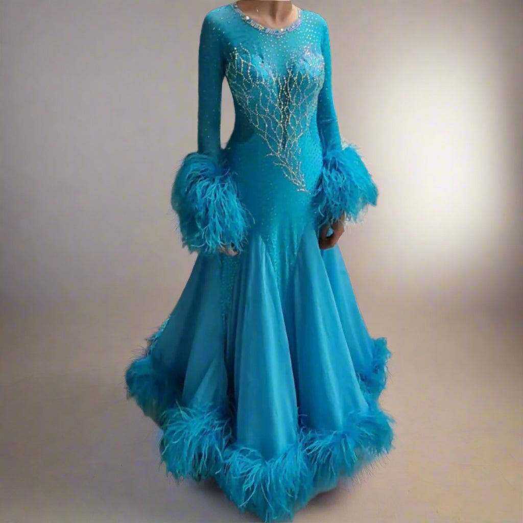 - Blue, feathers, crystals, rhinestones, professional, amateur, long sleeve dress for sale