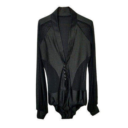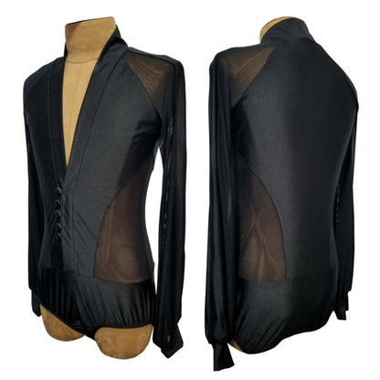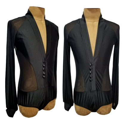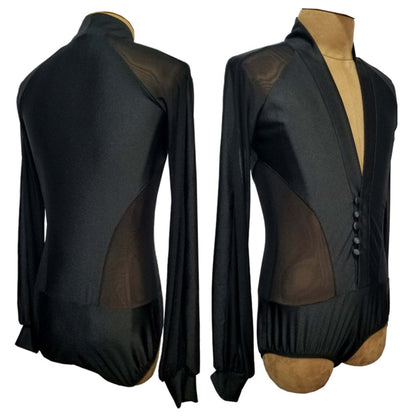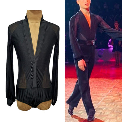 Unleash your presence on the dance floor in our customizable black latin competition shirt for men! With its long-sleeve V-neck design and elegant transparent detailing on the waist, sleeves, and shoulders, this shirt exudes boldness, breathability, and undeniable style for competitive dancers.