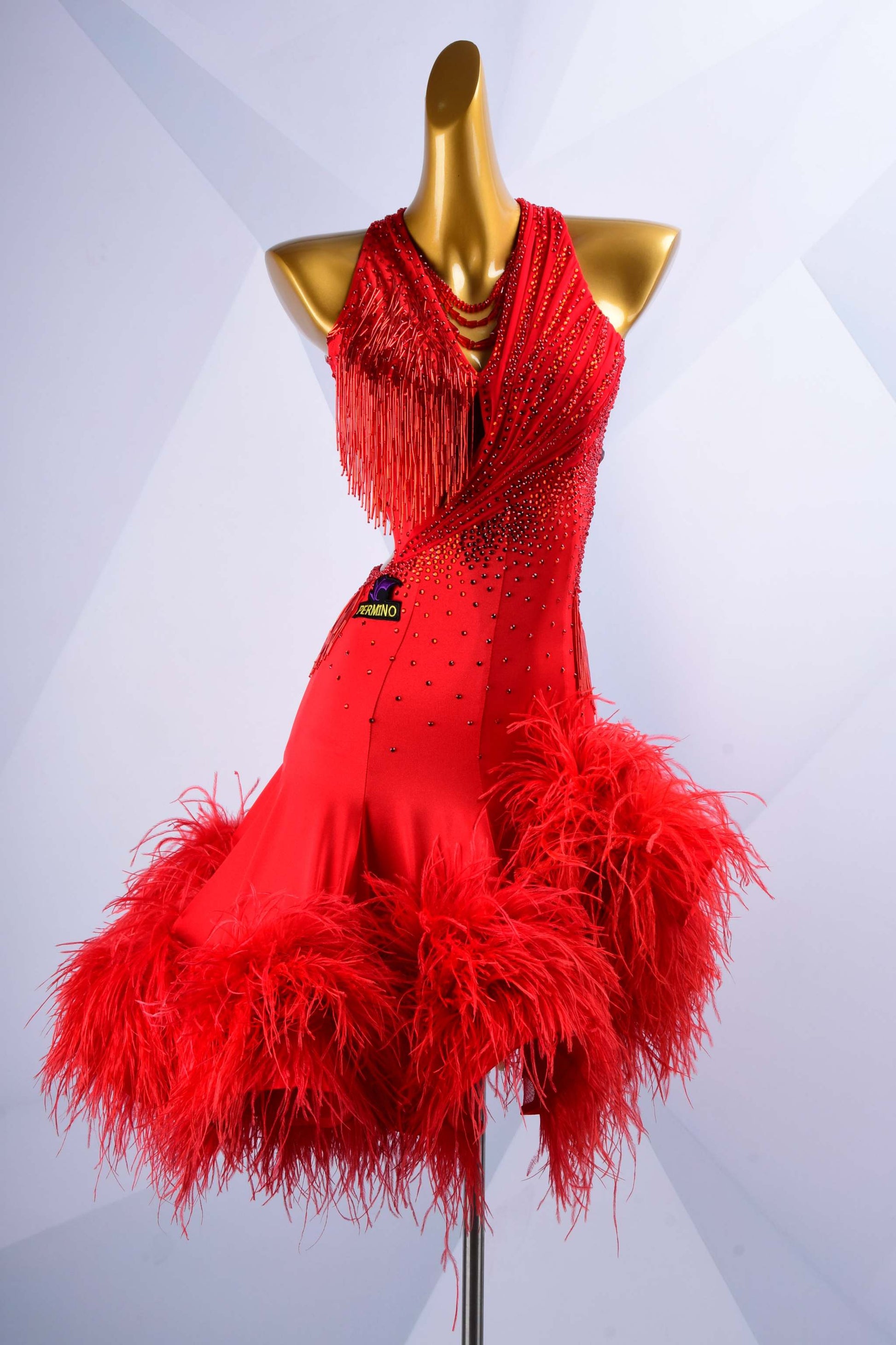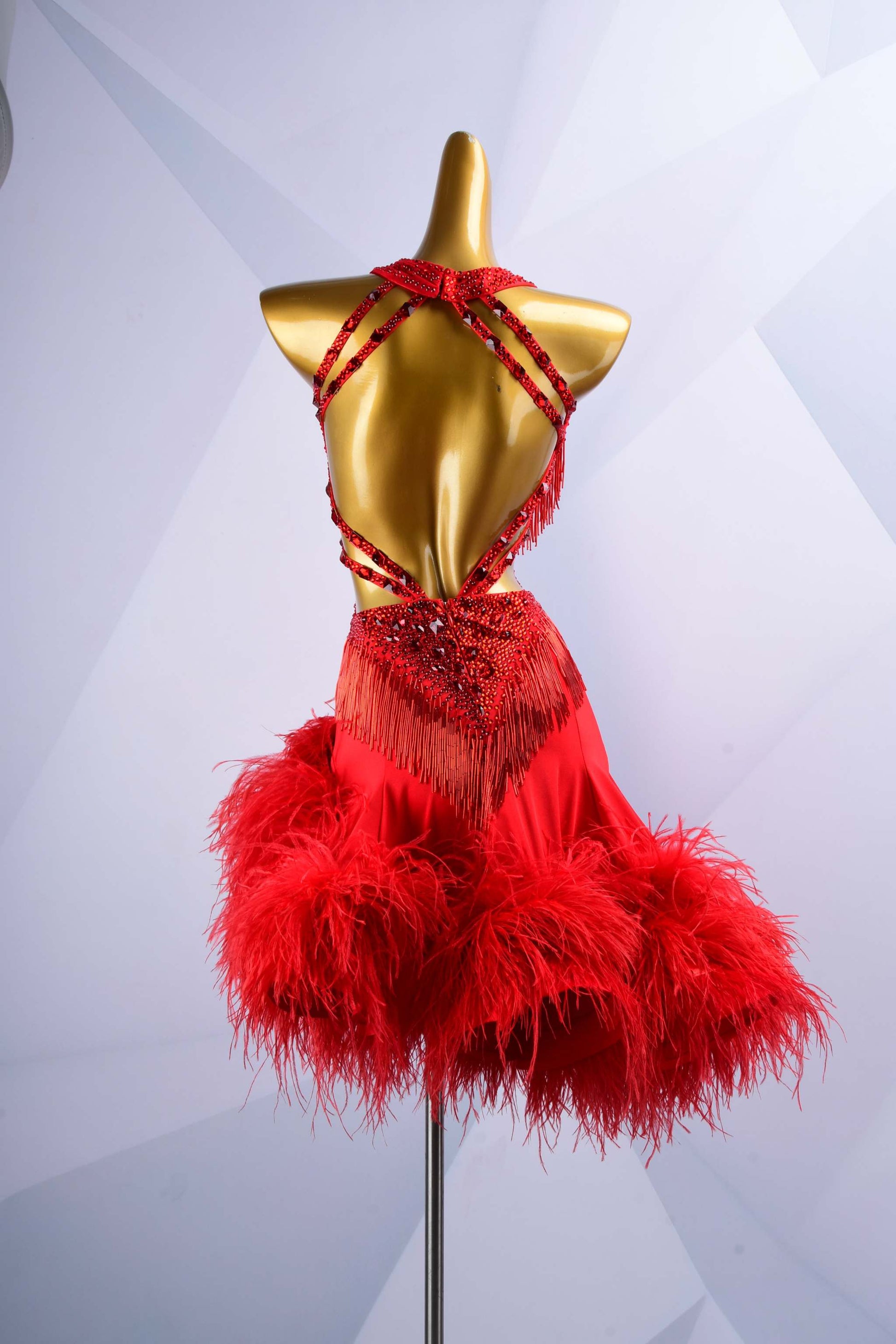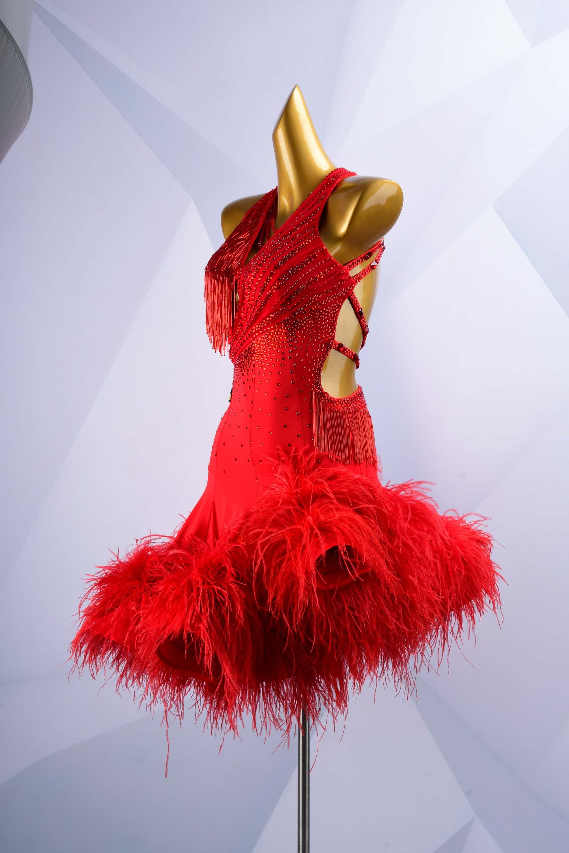 Stand out with this vibrant red latin dance dress, featuring dazzling rhinestones, lively beads, and a luxurious feather trim. Crafted to accentuate every striking move you make on the dance floor.