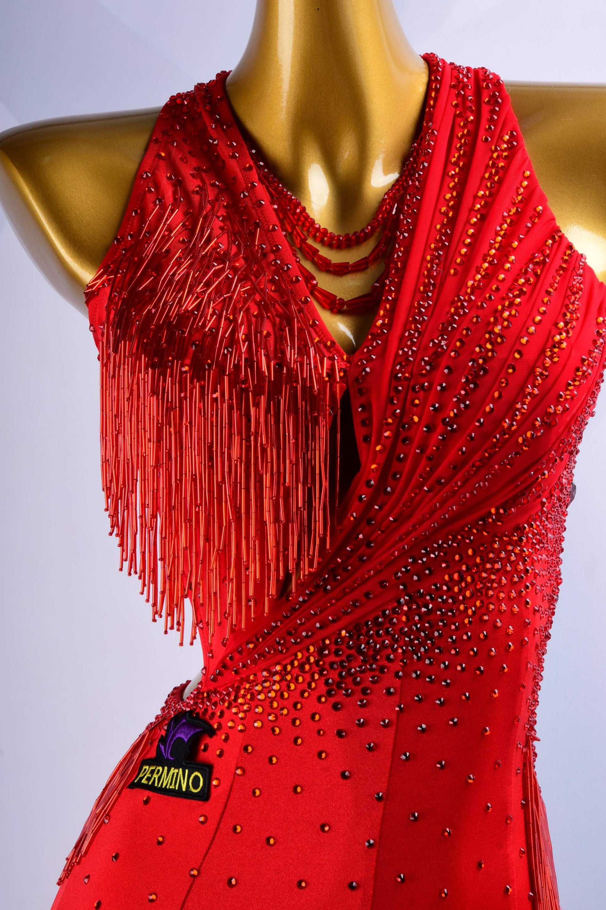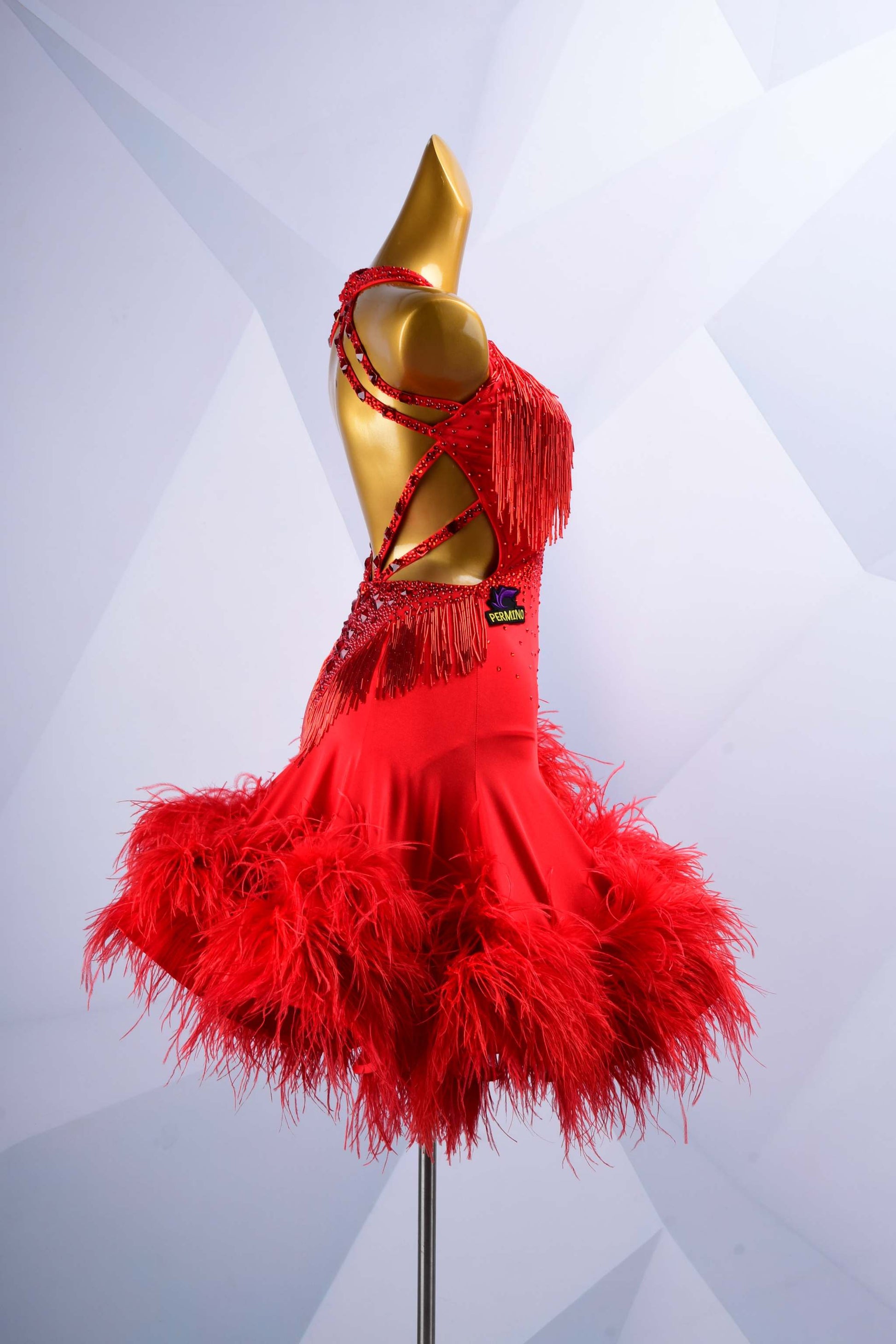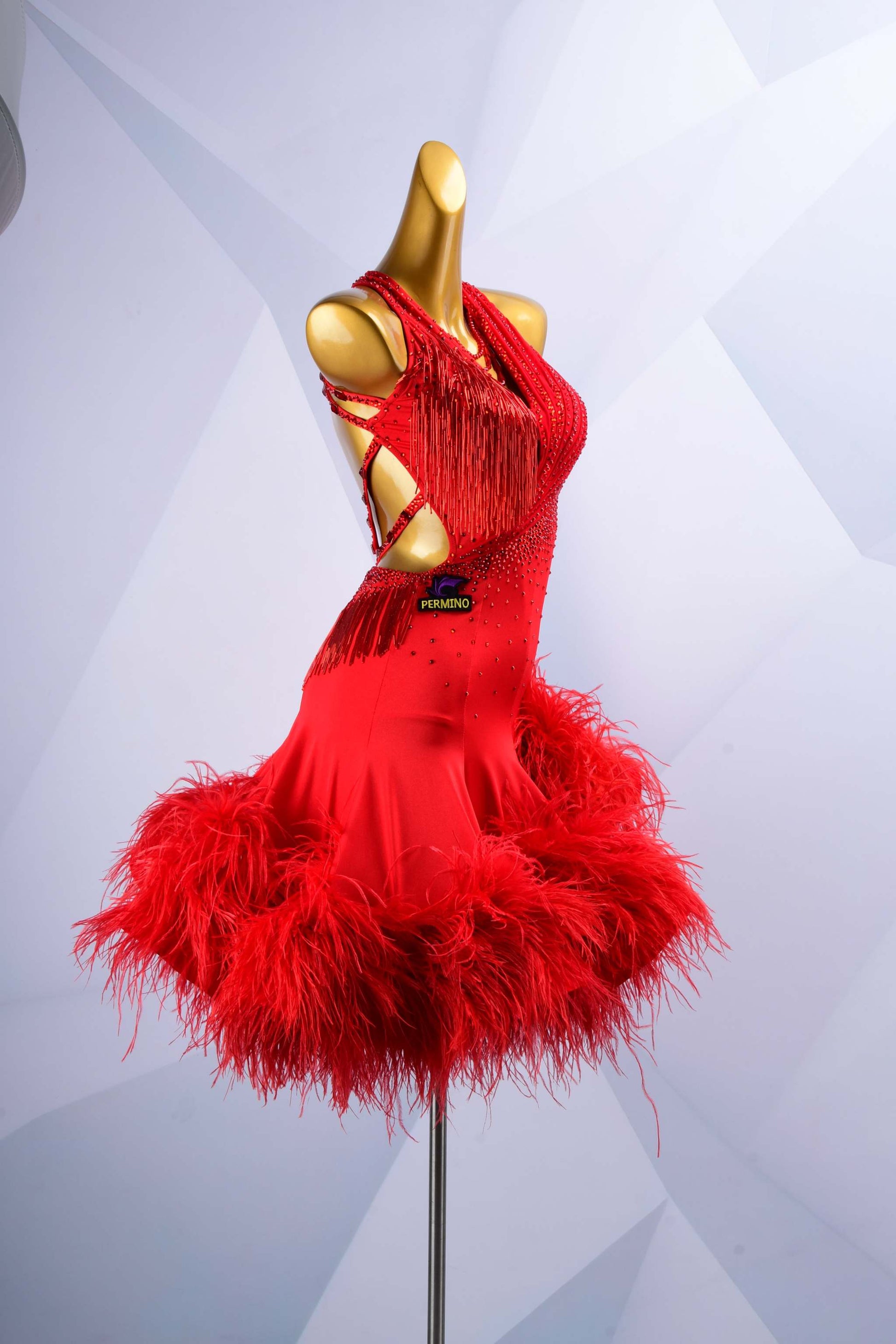 Stand out with this vibrant red latin dance dress, featuring dazzling rhinestones, lively beads, and a luxurious feather trim. Crafted to accentuate every striking move you make on the dance floor.