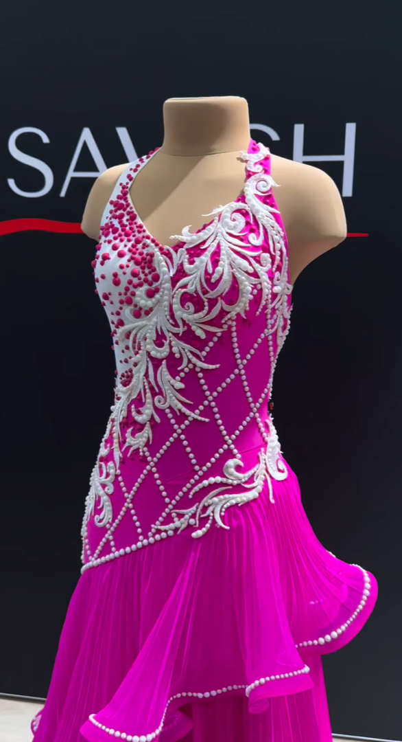 Experience the enchanting elegance of Savich Art's junior white & pink ballroom dress. With a sleeveless lace bodice, sparkling pearl embellishments, and voluminous crinoline, this dress is sure to impress any judge.