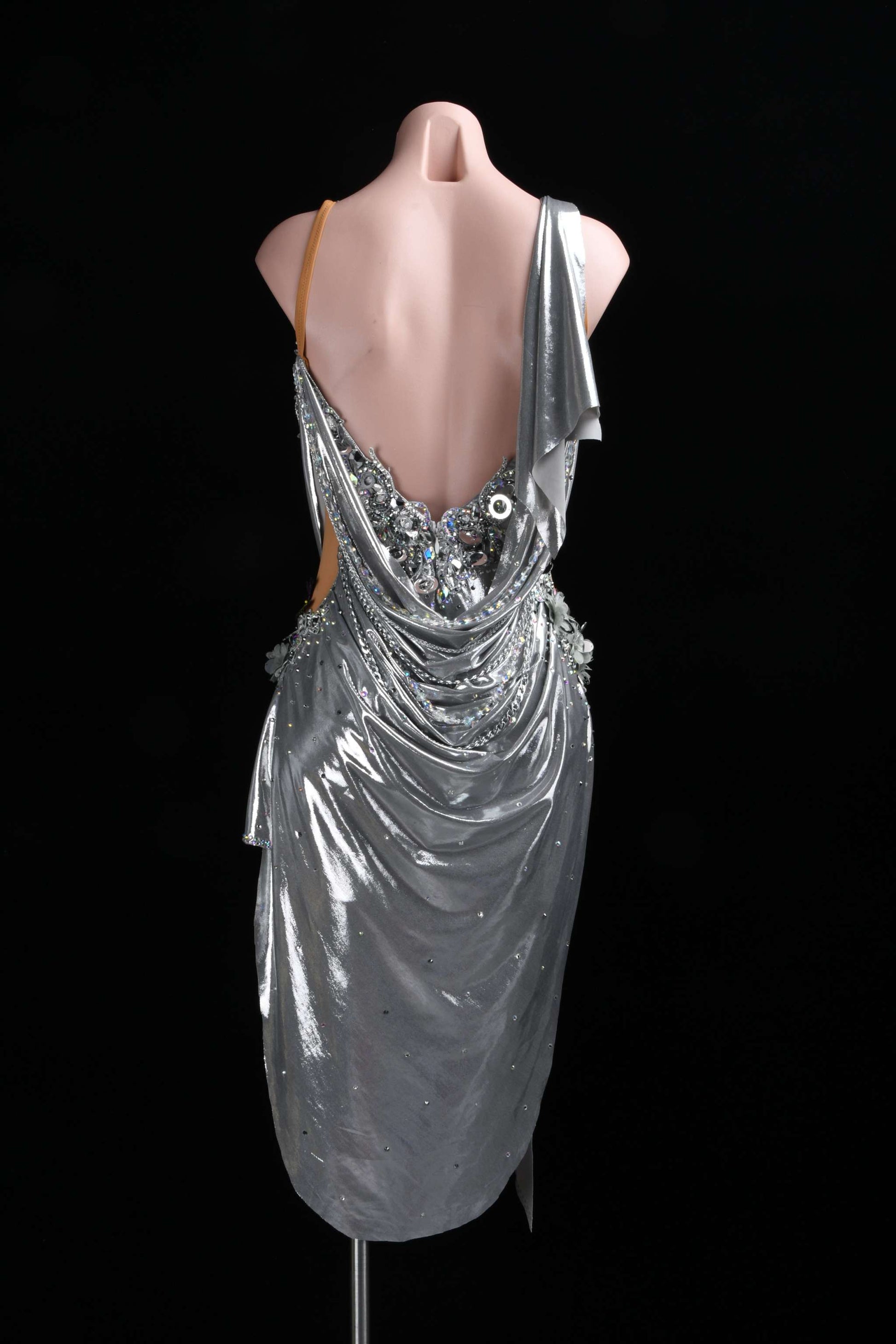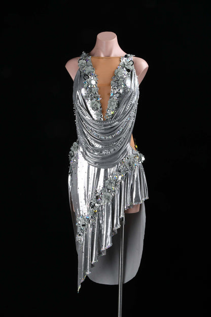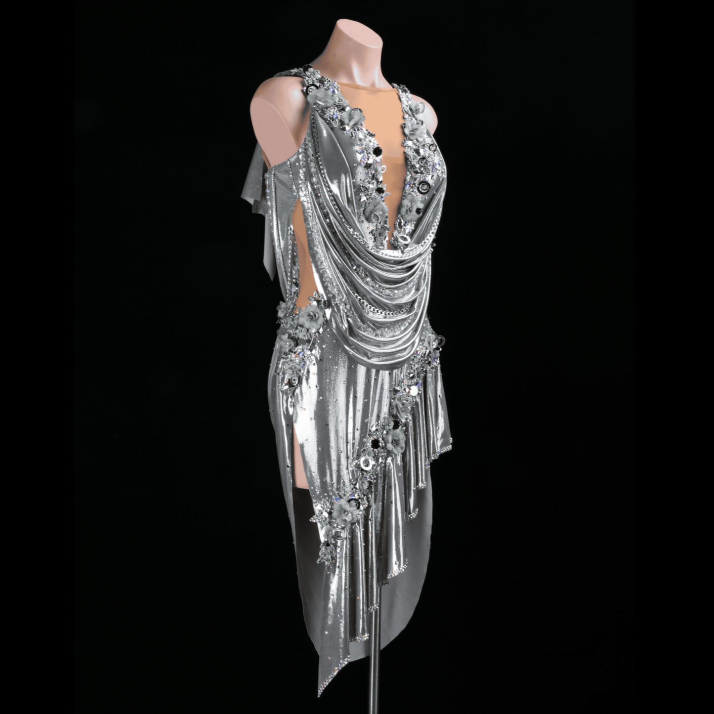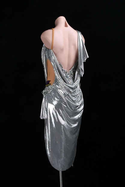 This stunning silver latin dress is adorned with detailed rhinestones and beads, showcasing a sleek, form-fitting design. It includes draped fabric accents, stylish cut-outs, and sparkling decorations, making it an ideal choice for captivating performances on stage or in competitions.
