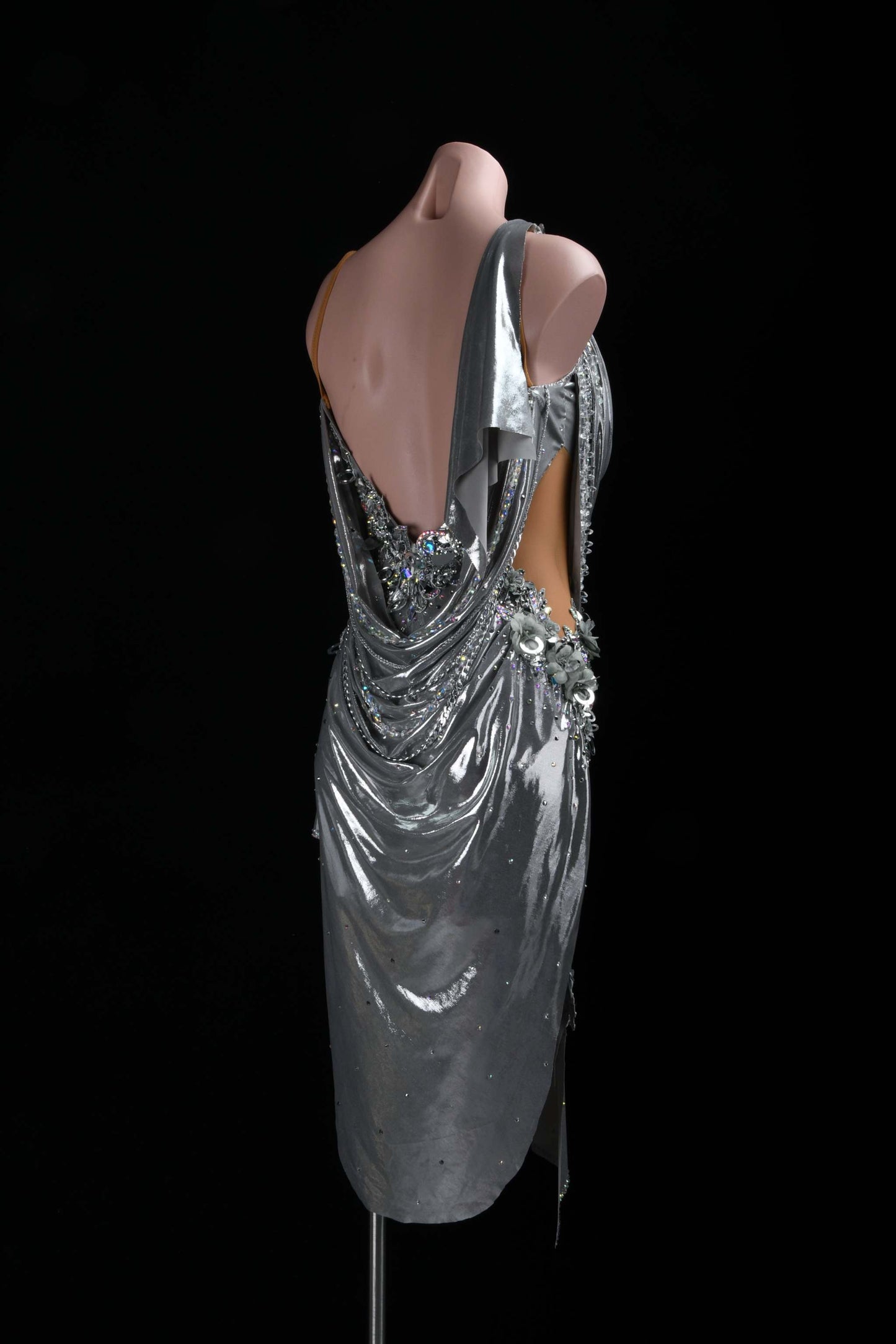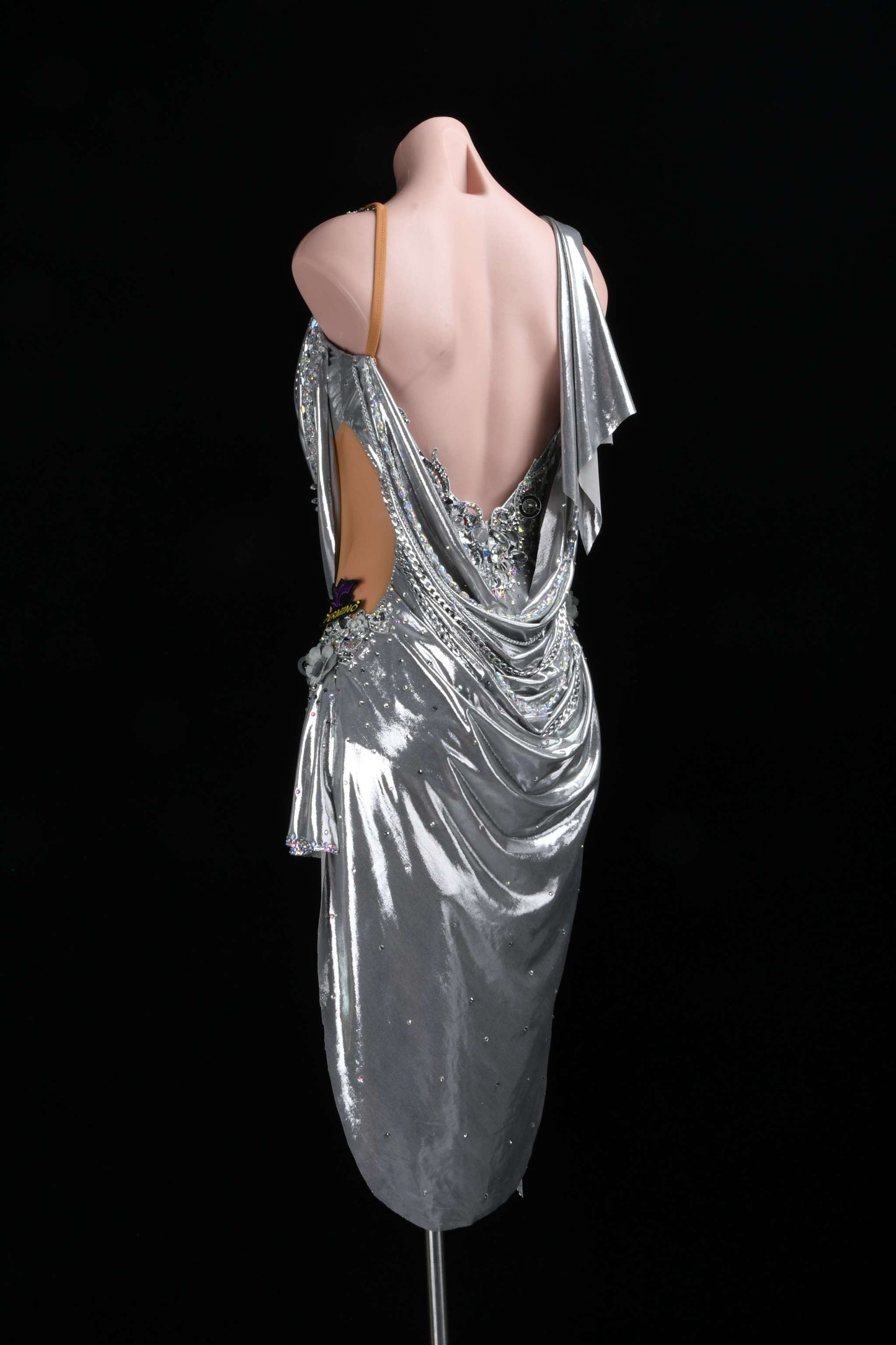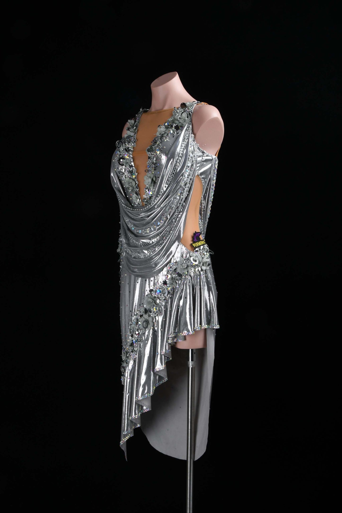This stunning silver latin dress is adorned with detailed rhinestones and beads, showcasing a sleek, form-fitting design. It includes draped fabric accents, stylish cut-outs, and sparkling decorations, making it an ideal choice for captivating performances on stage or in competitions.