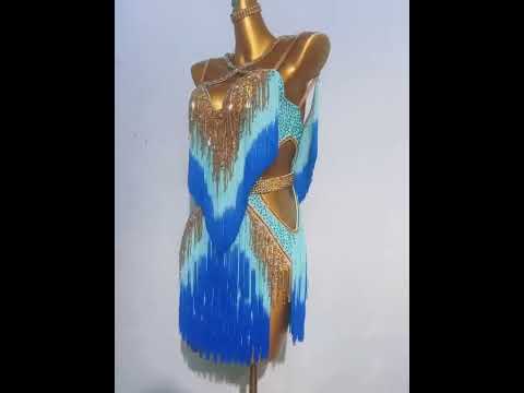 A vibrant custom latin dance dress featuring cascading fringe and shimmering embellishments designed to move fluidly with every step. The dress showcases an intricate rhinestone-studded neckline with crisscross straps, paired with a sculpted silhouette that highlights dynamic motion and stage presence.