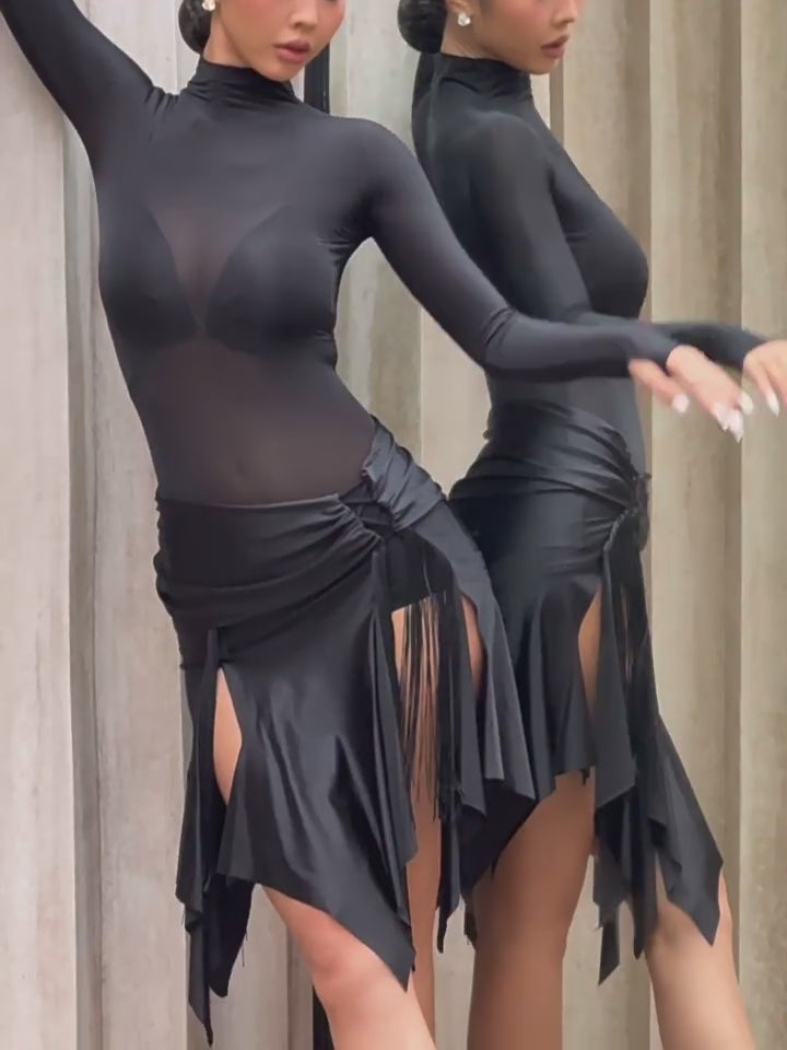 This latin practice skirt showcases a graceful curved hem that moves beautifully with you. Its high slit offers unrestricted mobility, and the snug fit around the waist and hips enhances your natural S-curve, delivering a sleek and sophisticated feminine silhouette.