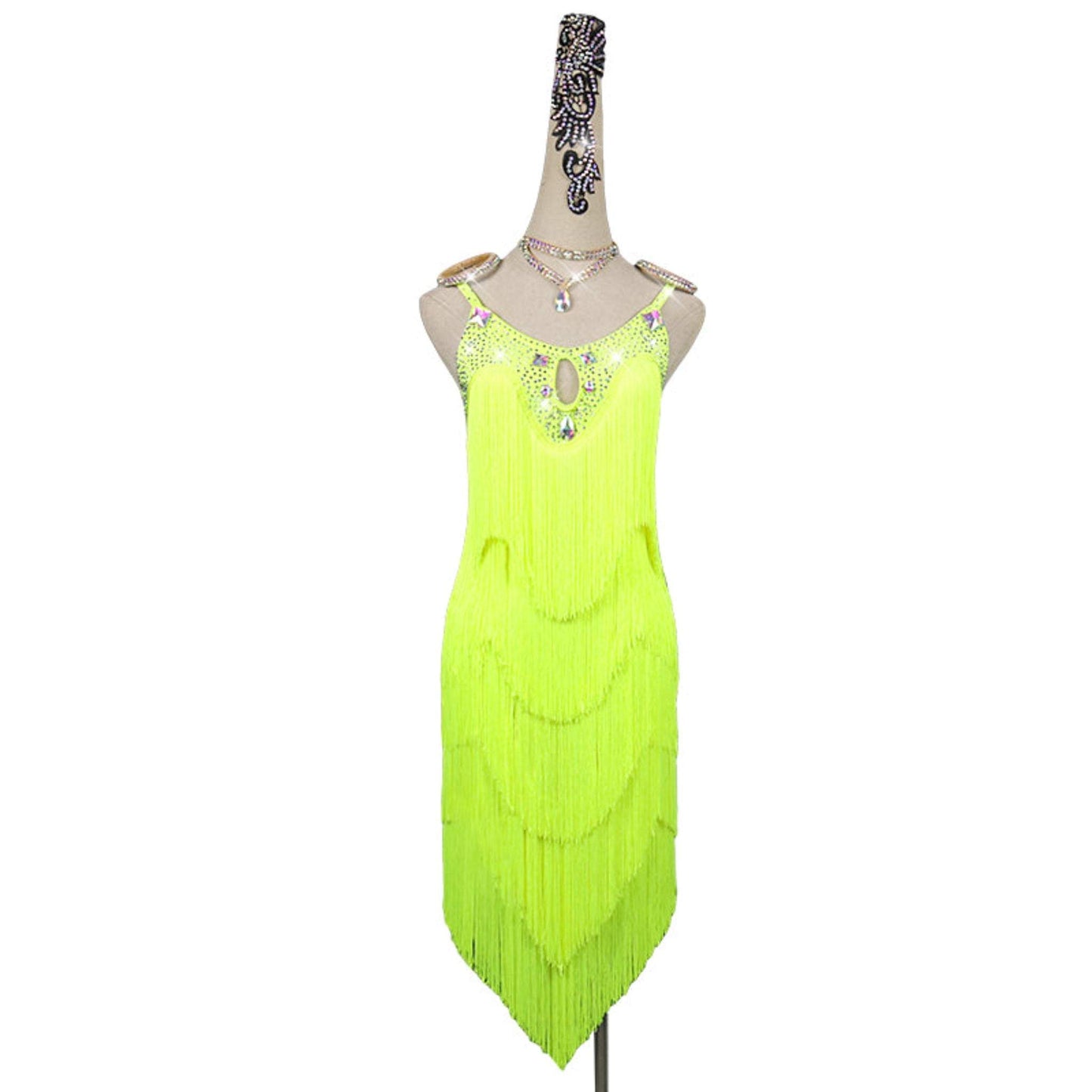 Dance with elegance in our bespoke latin dress, adorned with fringe and shimmering crystals for a touch of glamour. Meticulously crafted and competitively priced, this dance attire can be personalized in a wide array of vibrant colors. Tailored to your precise measurements for the ultimate fit, it's time to dazzle on the dance floor with our premium-quality dancewear. Find the perfect dance dress for you at our online store today!