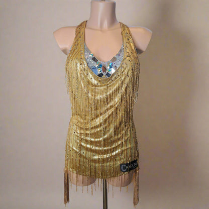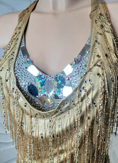 Shine with elegance in this stunning short dress featuring a blend of gold and silver hues. Adorned with sparkling rhinestones, reflective mirrors, and delicate fringes and beads, it gracefully flows over a shimmering silver base, highlighting refined necklines. Ideal for making a memorable impression and dazzling under the lights on the dancefloor.