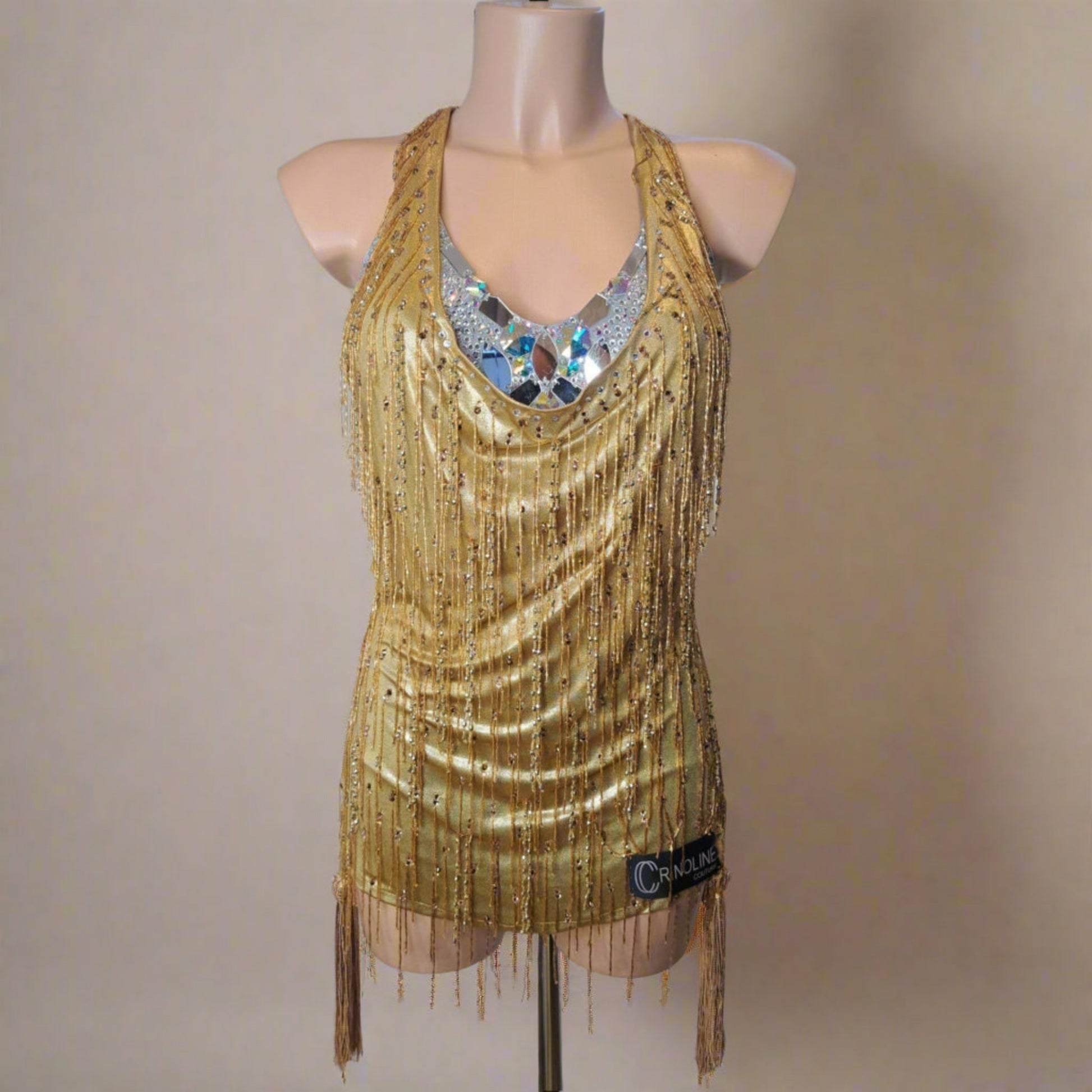 - Gold, fringe, beads, mirrors, crystals, beads, professional, amateur, youth, sleeveless dress for sale