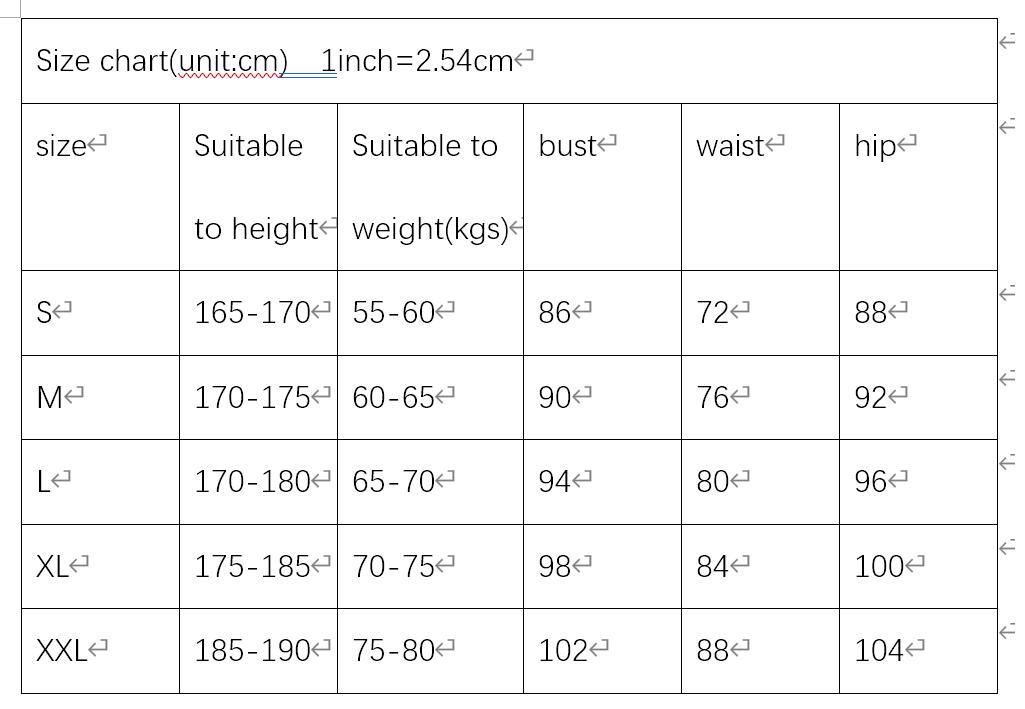 | XXL | 102 | 88 | 104 | 75-80 | 185-190 |