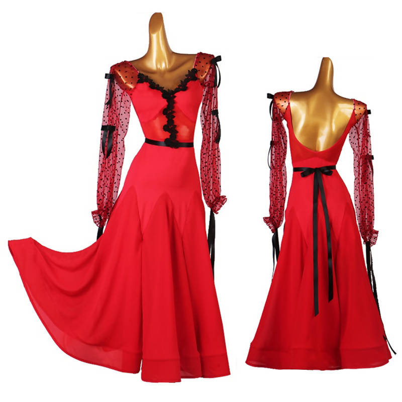 Elegance meets allure in this exquisite practice ballroom dress. The long, transparent sleeves adorned with intricate lace details add a touch of sophistication to your dance. Available in both passionate red and classic black, this dancewear dress offers a bold choice.