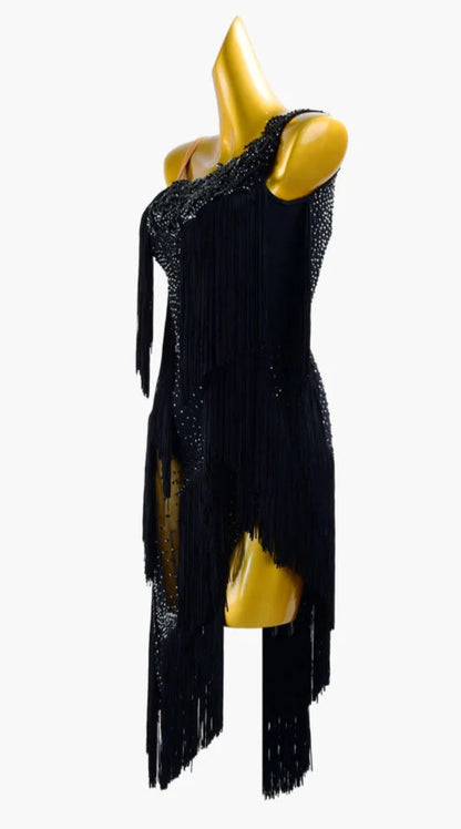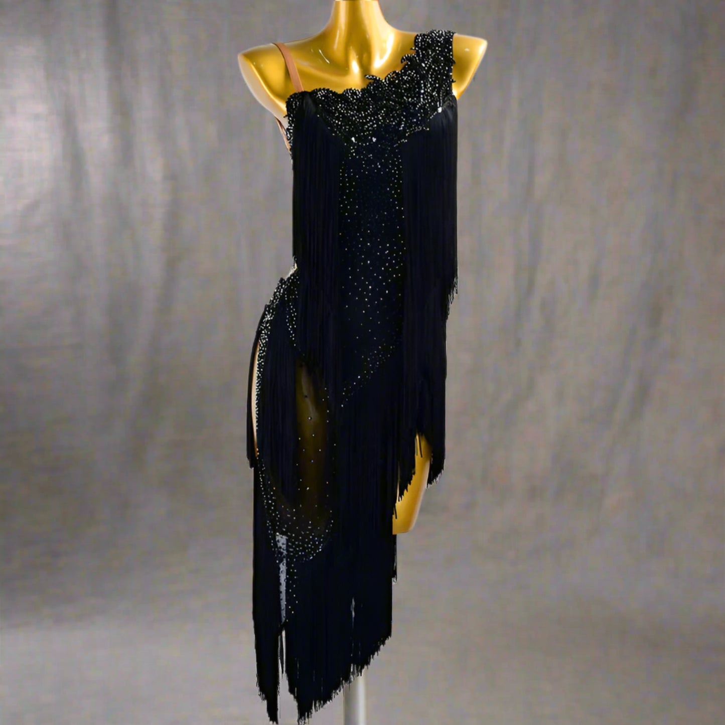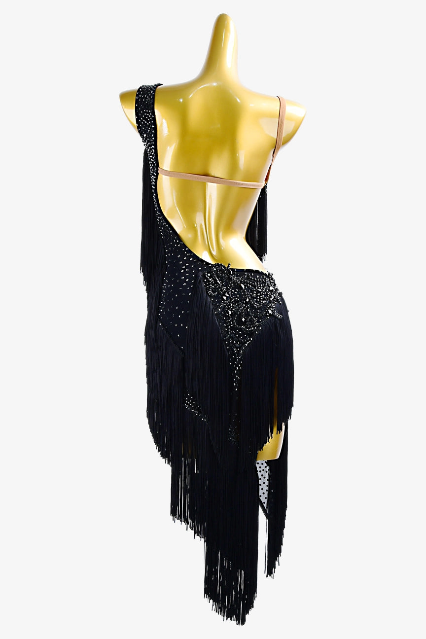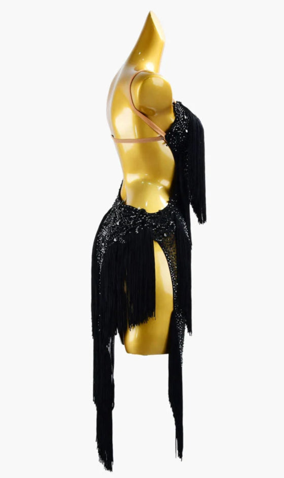 Dominate every performance in this exquisite black fringe latin dress. Embellished with brilliant rhinestones, luxurious crystal lace appliqué, and captivating cascades of fringe, its striking backless design accentuates your every movement. Perfect for latin competitions where sophisticated glamour and powerful expression unite to create an unforgettable impression.