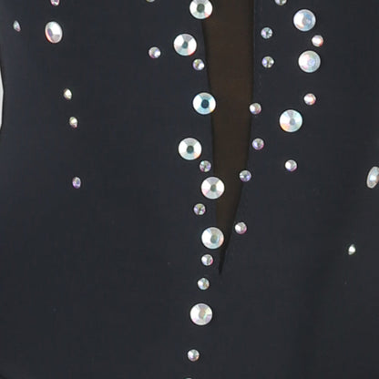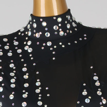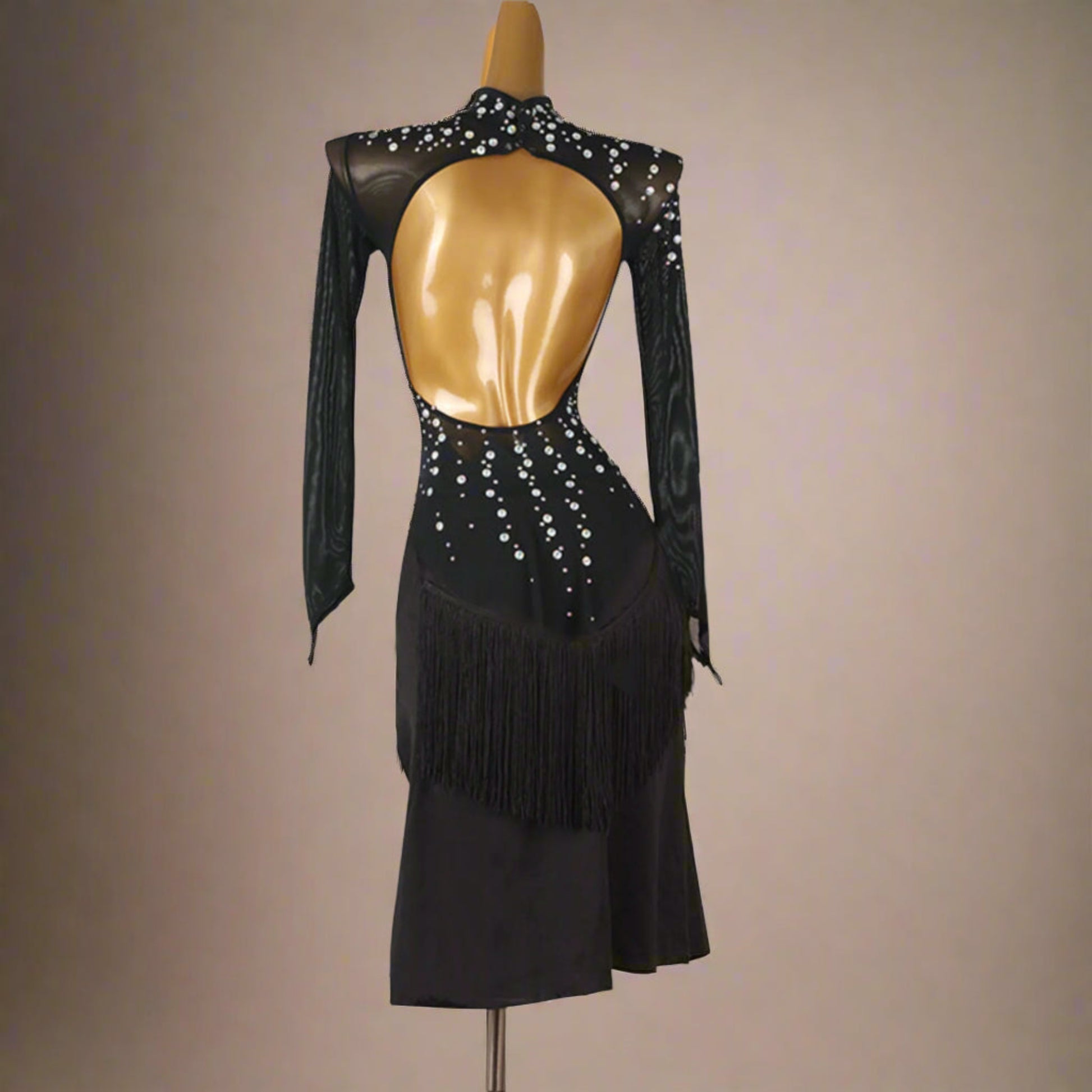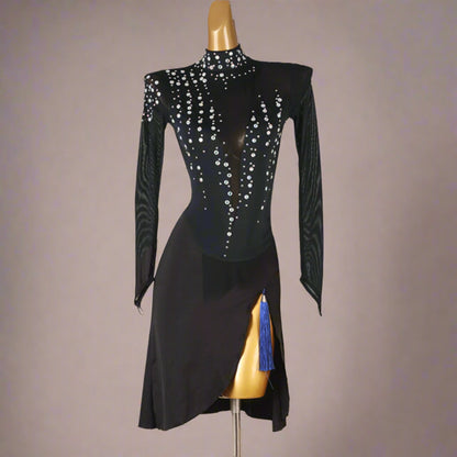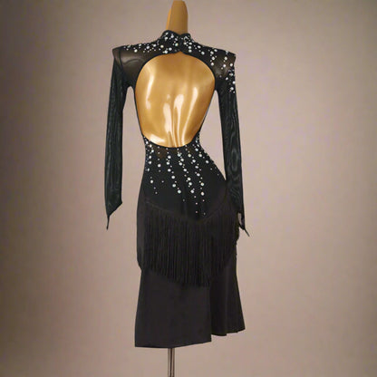 Step into the spotlight with this stunning black latin dress, adorned with sparkling stones, graceful long sleeves, striking fringe, and a provocative open back. Designed to enchant with every move and twirl.