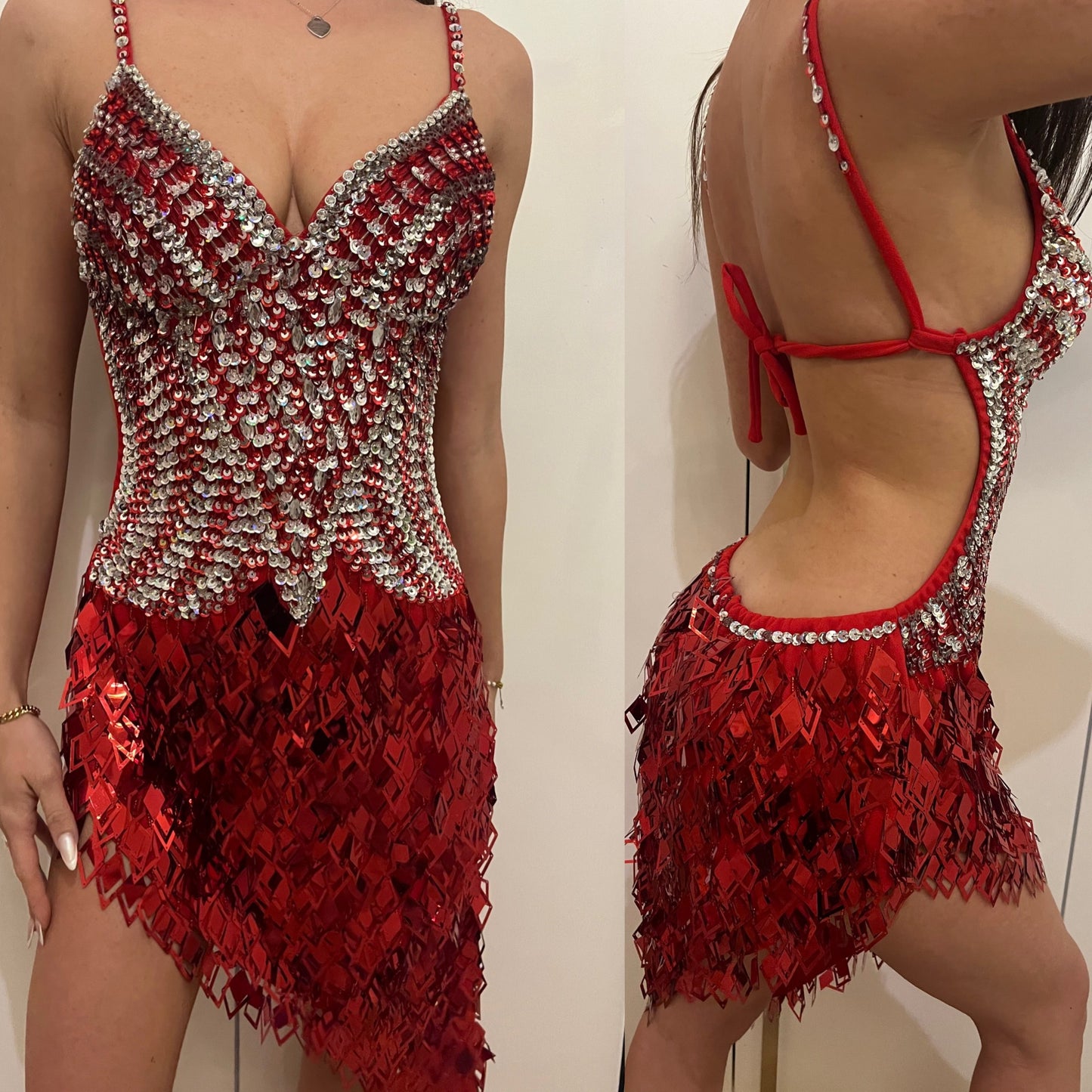 Prepare to dazzle in our red and silver sequined latin dress, ideal for dance competitions such as Latin and rhythm. This sleeveless dress showcases a stunning top embellished with red and silver sequins, while the skirt portion glistens with radiant red sequins. Elevate your dance performance and shine brightly on the floor!