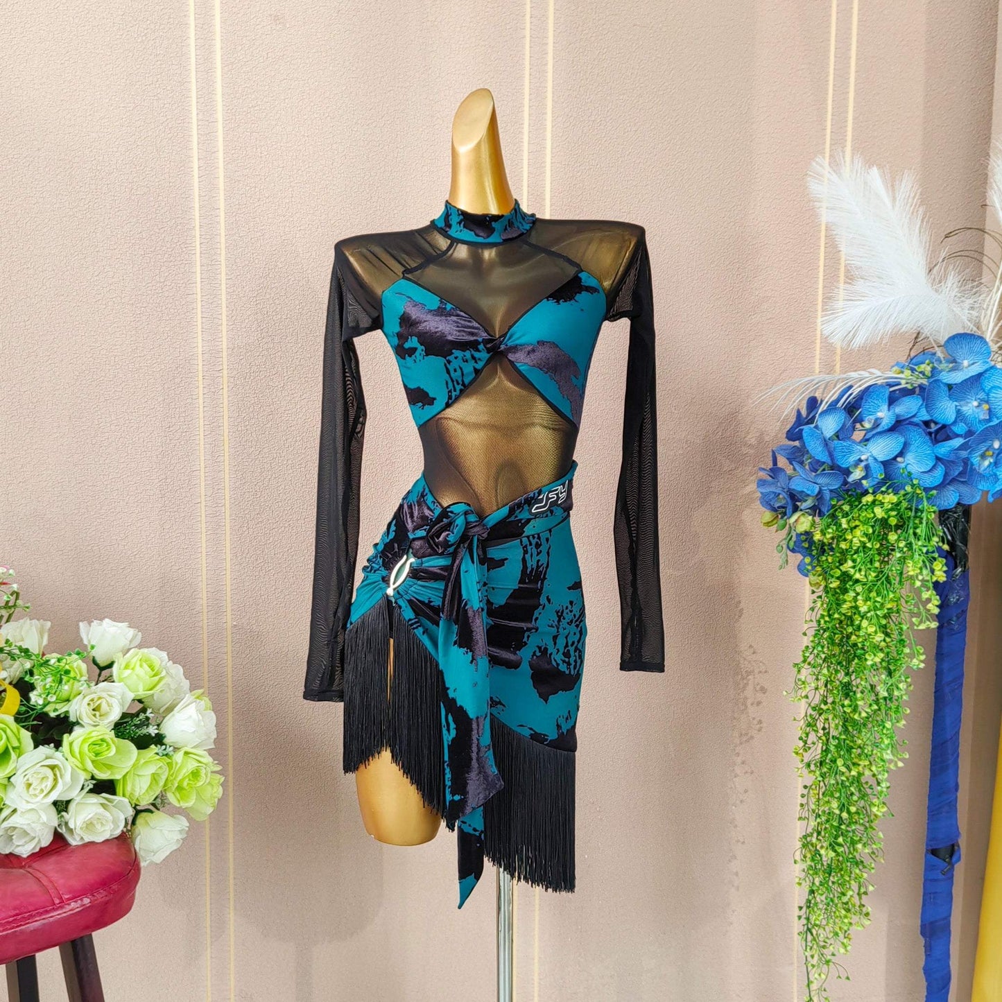 Ignite your dance skills with this striking black and blue latin ensemble! Showcasing a chic leotard with see-through panels on the arms, neckline, and midriff, along with a swaying fringed skirt for captivating motion.