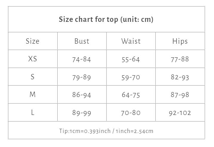 | Size | Bust | Waist | Hips |