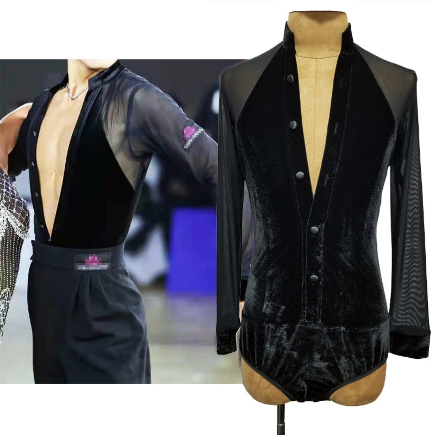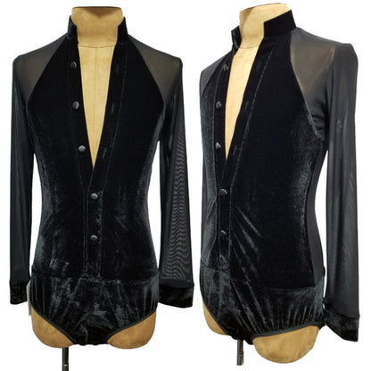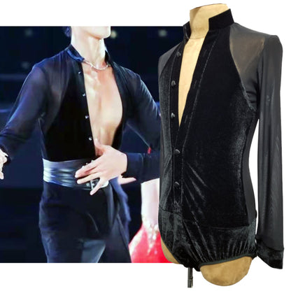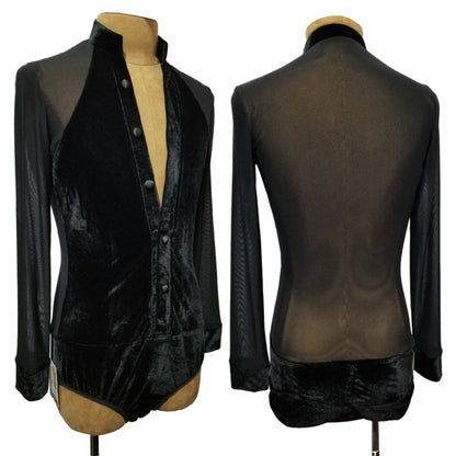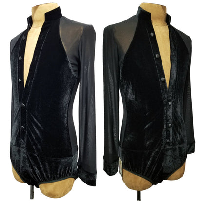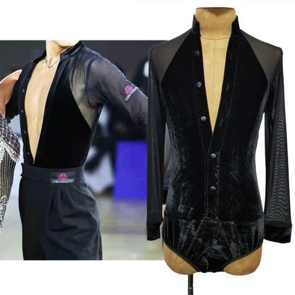 Experience elegance on the dance floor with our sleek and bold customizable black velvet latin competition shirt. Made with a luxurious velvet finish, long sleeves, and a seductive transparent back, this shirt provides unbeatable style, comfort, and flexibility, making it a must-have for both professional and aspiring latin dancers.